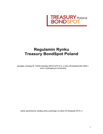 Regulamin Rynku Treasury BondSpot Poland (przyjęty uchwałą Nr 124/04 Zarządu MTS-CeTO S.A. w dniu 29 października 2004 r. wraz z późniejszymi zmianami) (tekst ujednolicony według stanu prawnego na dzień 25 listopada 2010 r.) 1 Regulamin Rynku Treasury BondSpot Poland Spis treści: ROZDZIAŁ I – PRZEPISY OGÓLNE ...................................................................................... 3 ROZDZIAŁ II - DOPUSZCZENIE I REZYGNACJA............................................................. 6 ROZDZIAŁ III - OBOWIĄZKI UCZESTNIKÓW................................................................... 8 ROZDZIAŁ IV – PROWADZENIE OBROTU ...................................................................... 10 ROZDZIAŁ V – TRANSAKCJE ............................................................................................ 12 ROZDZIAŁ VI - INFORMACJE ............................................................................................ 14 ROZDZIAŁ VII – NADZÓR NAD RYNKIEM ..................................................................... 15 ROZDZIAŁ VIII – ODPOWIEDZIALNOŚĆ I ROZWIĄZYWANIE SPORÓW ................. 18 Załącznik A – Grupy SPW wg terminów zapadalności ........................................................... 20 Załącznik B – Lista SPW będących przedmiotem obrotu........................................................ 21 Załącznik C – Minimalna jednostka obrotu ............................................................................. 22 Załącznik D – Rodzaje transakcji ............................................................................................. 23 Załącznik E – Godziny obrotu (czas środkowoeuropejski) ..................................................... 24 Załącznik F – Dni Obrotu......................................................................................................... 25 Załącznik G – Minimalna jednostka kwotowania / maksymalny spread dla SPW .................. 26 Załącznik H - Instytucje Rozliczeniowe .................................................................................. 27 Załącznik I - Procedury rozliczeniowe.................................................................................... 28 Załącznik J – Cykle rozliczeniowe........................................................................................... 29 Załącznik K - Zasady zawierania transakcji w ramach Segmentu Instytucjonalnego ............. 30 Załącznik L - Przydzielanie Płynnych SPW Market Makerom ............................................... 31 Załącznik M – Dzienne statystyki ............................................................................................ 32 Załącznik N – Procedury używane w przypadku, gdy Uczestnik nie jest w stanie zweryfikować zawartych transakcji na swoim ekranie ............................................................ 33 Załącznik O - Procedura Anulowania Transakcji ................................................................... 34 Załącznik P – Tabela opłat ....................................................................................................... 37 Załącznik R – Zasady zawierania transakcji warunkowych .................................................... 42 Załącznik Q – Zasady działania Agenta Emitenta ................................................................... 44 2 Regulamin Rynku Treasury BondSpot Poland ROZDZIAŁ I – PRZEPISY OGÓLNE § 1. - Definicje W niniejszym Regulaminie następujące określenia mają poniżej wymienione znaczenie: Agent Emitenta oznacza Uczestnika wskazanego przez Emitenta upoważnionego do zawierania w jego imieniu transakcji na Rynku na zasadach określonych w Załączniku Q; Bazowe SPW oznacza SPW, określone przez Ministra Finansów, po zasięgnięciu opinii Rady Uczestników Rynku SPW, emisje SPW, w szczególności dotyczące obligacji o stałym dochodzie i terminie wykupu nie krótszym niż jeden rok oraz wartości nominalnej nie mniejszej niż 2,5 mld zł, określone w Załączniku B, których lista może ulegać zmianie; Cena oznacza wielkość wyrażoną w procentach wartości nominalnej SPW, należną z tytułu sprzedaży, z wyłączeniem należnych odsetek, lub wielkość określoną poprzez odniesienie do oprocentowania; Dyspozycja oznacza przyjęcie w odpowiedzi całości bądź części Oferty, dokonane za pośrednictwem Systemu i niezwłocznie zarejestrowane przez System; Dzień Obrotu oznacza dzień, w którym SPW mogą być przedmiotem obrotu na Rynku, zgodnie z Załącznikiem F; Emitent oznacza Ministra Finansów; Godziny Obrotu oznacza godziny, podczas których odbywa się obrót SPW na Rynku w Dniu Obrotu, za pośrednictwem Systemu, zgodnie z Załącznikiem E; Informacje w czasie rzeczywistym oznacza informacje dotyczące SPW będących przedmiotem obrotu na Rynku, w stosunku do których upłynęło nie więcej niż 600 sekund od chwili gdy takie informacje zostały przekazane do Uczestników; Inwestor instytucjonalny oznacza podmiot określony w sekcji I Załącznika II do Dyrektywy 2004/39/WE Parlamentu Europejskiego i Rady z dnia 21 kwietnia 2004 r.; Komitet Rynku organ, o którym mowa w § 35 Regulaminu; Market Maker oznacza Uczestnika uprawnionego do zawierania transakcji na Rynku za pośrednictwem Systemu poprzez wprowadzanie Ofert i Dyspozycji; Market Taker oznacza Uczestnika uprawnionego do zawierania transakcji na Rynku za pośrednictwem Systemu wyłącznie poprzez wprowadzanie Dyspozycji; Oferta oznacza propozycję sprzedaży lub kupna złożoną za pośrednictwem Systemu zawierającą specyfikację w zakresie 3 Regulamin Rynku Treasury BondSpot Poland wielkości SPW oraz proponowanej Ceny jak również wskazanie SPW będącego przedmiotem Oferty; Państwo Członkowskie oznacza Państwo Członkowskie Unii Europejskiej; Płynne SPW oznacza SPW, posiadające znaczny udział w obrocie na Rynku, z wyłączeniem bazo