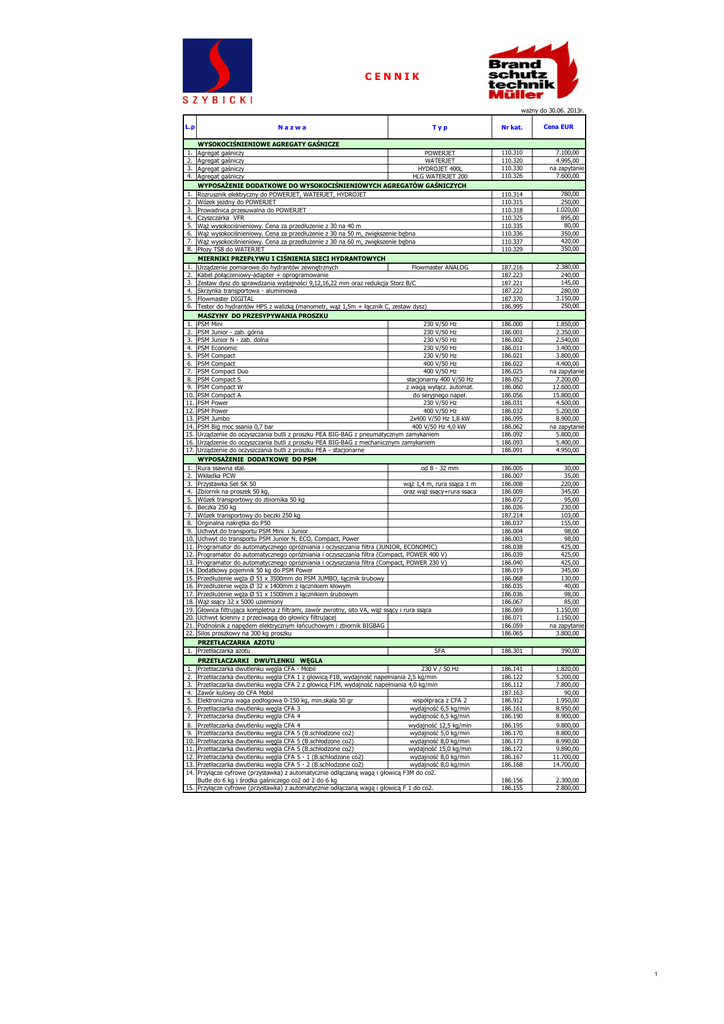CENNIK ważny do 30.06. 2013r. L.p Nazwa Typ 1. 2. 3. 4. 5. 6. 7. 8. 9. 10. 11. 12. 13. 14. 15. 16. 17. WYSOKOCIŚNIENIOWE AGREGATY GAŚNICZE Agregat gaśniczy POWERJET Agregat gaśniczy WATERJET Agregat gaśniczy HYDROJET 400L Agregat gaśniczy HLG WATERJET 200 WYPOSAŻENIE DODATKOWE DO WYSOKOCIŚNIENIOWYCH AGREGATÓW GAŚNICZYCH Rozrusznik elektryczny do POWERJET, WATERJET, HYDROJET Wózek jezdny do POWERJET Prowadnica przesuwalna do POWERJET Czyszczarka VFR Wąż wysokociśnieniowy. Cena za przedłużenie z 30 na 40 m Wąż wysokociśnieniowy. Cena za przedłużenie z 30 na 50 m, zwiększenie bębna Wąż wysokociśnieniowy. Cena za przedłużenie z 30 na 60 m, zwiększenie bębna Płozy TS8 do WATERJET MIERNIKI PRZEPŁYWU I CIŚNIENIA SIECI HYDRANTOWYCH Urządzenie pomiarowe do hydrantów zewnętrznych Flowmaster ANALOG Kabel połączeniowy-adapter + oprogramowanie Zestaw dysz do sprawdzania wydajności 9,12,16,22 mm oraz redukcja Storz B/C Skrzynka transportowa - aluminiowa Flowmaster DIGITAL Tester do hydrantów HPS z walizką (manometr, wąż 1,5m + łącznik C, zestaw dysz) MASZYNY DO PRZESYPYWANIA PROSZKU PSM Mini 230 V/50 Hz PSM Junior - zab. górna 230 V/50 Hz PSM Junior N - zab. dolna 230 V/50 Hz PSM Economic 230 V/50 Hz PSM Compact 230 V/50 Hz PSM Compact 400 V/50 Hz PSM Compact Duo 400 V/50 Hz PSM Compact S stacjonarny 400 V/50 Hz PSM Compact W z wagą wyłącz. automat. PSM Compact A do seryjnego napeł. PSM Power 230 V/50 Hz PSM Power 400 V/50 Hz PSM Jumbo 2x400 V/50 Hz 1,8 kW PSM Big moc ssania 0,7 bar 400 V/50 Hz 4,0 kW Urządzenie do oczyszczania butli z proszku PEA BIG-BAG z pneumatycznym zamykaniem Urządzenie do oczyszczania butli z proszku PEA BIG-BAG z mechanicznym zamykaniem Urządzenie do oczyszczania butli z proszku PEA - stacjonarne 1. 2. 3. 4. 5. 6. 7. 8. 9. 10. 11. 12. 13. 14. 15. 16. 17. 18. 19. 20. 21. 22. WYPOSAŻENIE DODATKOWE DO PSM Rura ssawna stal. od 8 - 32 mm Wkładka PCW Przystawka Set SK 50 wąż 1,4 m, rura ssąca 1 m Zbiornik na proszek 50 kg, oraz wąż ssący+rura ssaca Wózek transportowy do zbiornika 50 kg Beczka 250 kg Wózek transportowy do beczki 250 kg Orginalna nakrętka do P50 Uchwyt do transportu PSM Mini i Junior Uchwyt do transportu PSM Junior N, ECO, Compact, Power Programator do automatycznego opróżniania i oczyszczania filtra (JUNIOR, ECONOMIC) Programator do automatycznego opróżniania i oczyszczania filtra (Compact, POWER 400 V) Programator do automatycznego opróżniania i oczyszczania filtra (Compact, POWER 230 V) Dodatkowy pojemnik 50 kg do PSM Power Przedłużenie węża Ø 51 x 3500mm do PSM JUMBO, łącznik śrubowy Przedłużenie węża Ø 32 x 1400mm z łącznikiem kłowym Przedłużenie węża Ø 51 x 1500mm z łącznikiem śrubowym Wąż ssący 32 x 5000 uziemiony Głowica filtrująca kompletna z filtrami, zawór zwrotny, sito VA, wąż ssący i rura ssąca Uchwyt ścienny z przeciwagą do głowicy filtrującej Podnośnik z napędem elektrycznym łańcuchowym i zbiornik BIGBAG Silos proszkowy na 300 kg proszku 1. 2. 3. 4. 1. 2. 3. 4. 5. 6. 7. 8. 1. 2. 3. 4. 5. 6. PRZETŁACZARKA AZOTU 1. Przetłaczarka azotu 1. 2. 3. 4. 5. 6. 7. 8. 9. 10. 11. 12. 13. 14. 15. SFA PRZETŁACZARKI DWUTLENKU WĘGLA Przetłaczarka dwutlenku węgla CFA - Mobil 230 V / 50 Hz Przetłaczarka dwutlenku węgla CFA 1 z głowicą F1B, wydajność napełniania 2,5 kg/min Przetłaczarka dwutlenku węgla CFA 2 z głowicą F1M, wydajność napełniania 4,0 kg/min Zawór kulowy do CFA Mobil Elektroniczna waga podłogowa 0-150 kg, min.skala 50 gr współpraca z CFA 2 Przetłaczarka dwutlenku węgla CFA 3 wydajność 6,5 kg/min Przetłaczarka dwutlenku węgla CFA 4 wydajność 6,5 kg/min Przetłaczarka dwutlenku węgla CFA 4 wydajność 12,5 kg/min Przetłaczarka dwutlenku węgla CFA 5 (B.schłodzone co2) wydajność 5,0 kg/min Przetłaczarka dwutlenku węgla CFA 5 (B.schłodzone co2) wydajność 8,0 kg/min Przetłaczarka dwutlenku węgla CFA 5 (B.schłodzone co2) wydajność 15,0 kg/min Przetłaczarka dwutlenku węgla CFA 5 - 1 (B.schłodzone co2) wydajność 8,0 kg/min Przetłaczarka dwutlenku węgla CFA 5 - 2 (B.schłodzone co2) wydajność 8,0 kg/min Przyłącze cyfrowe (przystawka) z automatycznie odłączaną wagą i głowicą F3M do co2. Butle do 6 kg i środka gaśniczego co2 od 2 do 6 kg Przyłącze cyfrowe (przystawka) z automatycznie odłączaną wagą i głowicą F 1 do co2. Nr kat. Cena EUR 110.310 110.320 110.330 110.326 7.100,00 4.995,00 na zapytanie 7.600,00 110.314 110.315 110.318 110.325 110.335 110.336 110.337 110.329 780,00 250,00 1.020,00 895,00 80,00 350,00 420,00 350,00 187.216 187.223 187.221 187.222 187.370 186.995 2.380,00 240,00 145,00 280,00 3.150,00 250,00 186.000 186.001 186.002 186.011 186.021 186.022 186.025 186.052 186.060 186.056 186.031 186.032 186.095 186.062 186.092 186.093 186.091 1.850,00 2.350,00 2.540,00 3.400,00 3.800,00 4.400,00 na zapytanie 7.200,00 12.600,00 15.800,00 4.500,00 5.200,00 8.900,00 na zapytanie 5.800,00 5.400,00 4.950,00 186.005 186.007 186.008 186.009 186.072 186.026 187.214 186.037 186.004 186.003 186.038 186.039 186.040 186.019 186.068 186.035 186.036 186.067 186.069 186.071 186.059 186.065 30,00 35,00 220,00 345,00 95,00 230,00 103,00 155,00 98,00 98,00 425,00 425,00 425,00 345,00 130,00 40,00 98,00 85,00 1.150,00 1.150,00 na zapytanie 3.800,00 186.301 390,00 186.141 186.122 186.112 187.163 186.912 186.161 186.190 186.195 186.170 186.173 186.172 186.167 186.168 1.820,00 5.200,00 7.800,00 90,00 1.950,00 8.950,00 8.900,00 9.800,00 8.800,00 8.990,00 9.890,00 11.700,00 14.700,00 186.156 186.155 2.300,00 2.800,00 1 WYPOSAŻENIE DODATKOWE DO CFA 1. 2. 3. 4. 5. 6. 7. 8. 9. 10. 11. 12. 13. 14. 15. 16. 17. Głowica Głowica Głowica F2M do leżących butli co2 z zaworem bezpieczeństwa do 300 g Klucz do głowicy napełniajacej Rozdzielacz do pobierania co2 z dwóch butli jednocześnie Wąż ciśnieniowy co2 Pierścień do głowicy F1B Pierścień do głowicy F1M Przyłącze do szybkiego napełniania c