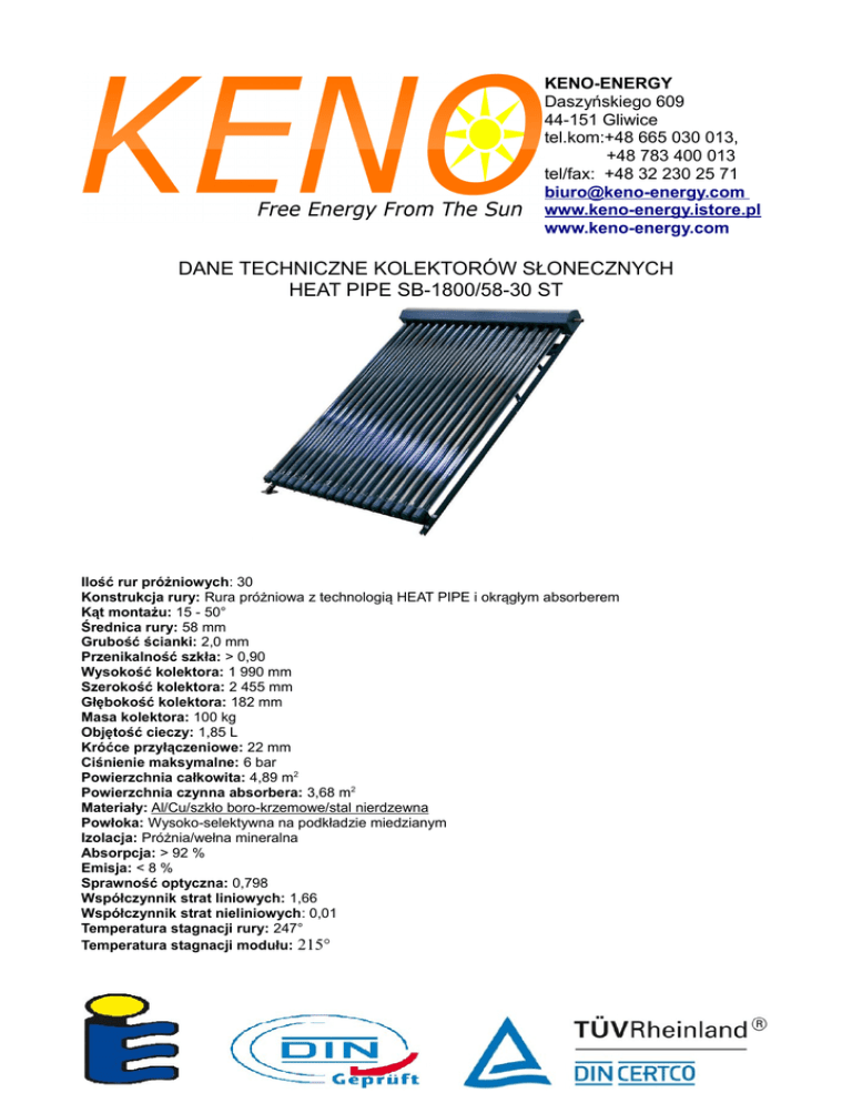 KENO-ENERGY Daszyńskiego 609 44-151 Gliwice tel.kom:+48 665 030 013, +48 783 400 013 tel/fax: +48 32 230 25 71 [email protected] www.keno-energy.istore.pl www.keno-energy.com DANE TECHNICZNE KOLEKTORÓW SŁONECZNYCH HEAT PIPE SB-1800/58-30 ST Ilość rur próżniowych: 30 Konstrukcja rury: Rura próżniowa z technologią HEAT PIPE i okrągłym absorberem Kąt montażu: 15 - 50° Średnica rury: 58 mm Grubość ścianki: 2,0 mm Przenikalność szkła: > 0,90 Wysokość kolektora: 1 990 mm Szerokość kolektora: 2 455 mm Głębokość kolektora: 182 mm Masa kolektora: 100 kg Objętość cieczy: 1,85 L Króćce przyłączeniowe: 22 mm Ciśnienie maksymalne: 6 bar Powierzchnia całkowita: 4,89 m2 Powierzchnia czynna absorbera: 3,68 m2 Materiały: Al/Cu/szkło boro-krzemowe/stal nierdzewna Powłoka: Wysoko-selektywna na podkładzie miedzianym Izolacja: Próżnia/wełna mineralna Absorpcja: > 92 % Emisja: < 8 % Sprawność optyczna: 0,798 Współczynnik strat liniowych: 1,66 Współczynnik strat nieliniowych: 0,01 Temperatura stagnacji rury: 247° Temperatura stagnacji modułu: 215°