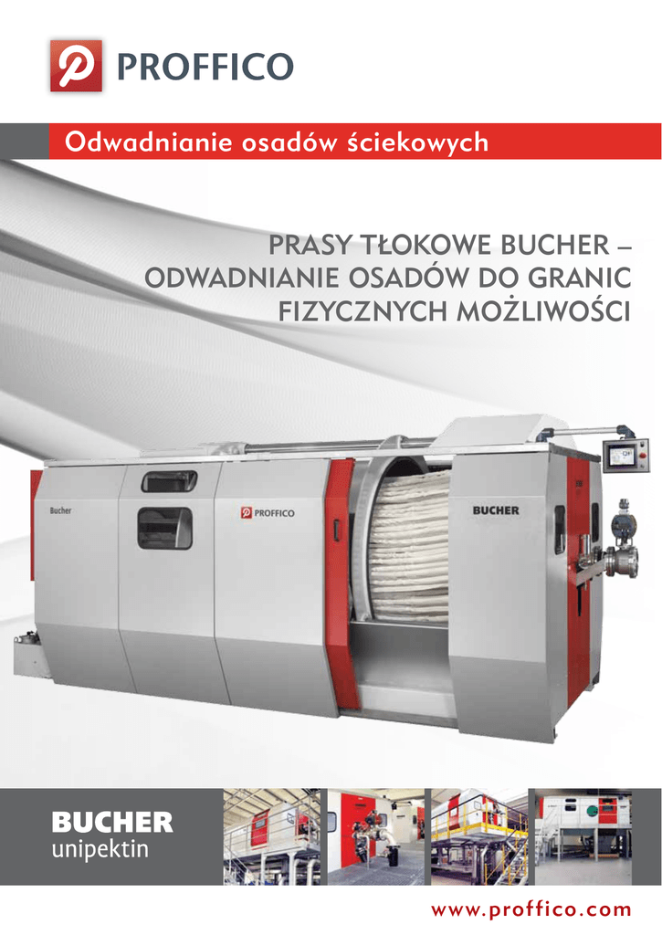 Odwadnianie osadów ściekowych PRASY TŁOKOWE BUCHER – ODWADNIANIE OSADÓW DO GRANIC FIZYCZNYCH MOŻLIWOŚCI www.proffico.com Prasy Bucher ze względu na swój sposób pracy, należą do grupy najefektywniejszych urządzeń w zakresie odwadniania komunalnych osadów ściekowych. Ich konstrukcja i jakość udowodniła na przykładzie wielu referencji, że ich żywotność techniczna wynosi ponad czterdzieści lat. Producentem tych pras jest firma Bucher Unipektin AG ze Szwajcarii a Proffico Sp. z o.o. jest ich dystrybutorem na terenie Polski w zakresie sektora komunalnego i przemysłowego. Pierwszymi zrealizowanymi inwestycjami w Polsce z wykorzystaniem pras tłokowych Bucher dla osadów komunalnych są instalacje w Radomiu i Puławach. FAZY PRACY: Napełnianie Uwodnione osady wprowadzane są centralnie do cylindra, wypełniając w ten sposób całą przestrzeń. Podczas napełniania osadem, tłok cylindra jest samoczynnie wypychany do pozycji krańcowej, powodując powstanie lekkiego nadciśnienia. Dzięki temu nadmiar wody wolnej (niezwiązanej z osadem) odprowadzany jest poprzez dreny do kanalizacji. Cykl napełniania i dopełniania komory następuje kilkunastokrotnie przez łączny czas ok. 40 minut, z tą różnicą, że pompa podająca osady pracuje łącznie ok. 8 minut. ZASADA DZIAŁANIA PRAS TŁOKOWYCH Głównym elementem prasy jest cylinder oraz tłok. Pomiędzy tłokiem a cylindrem umiejscowione są specjalne dreny odprowadzające filtrat do kanalizacji. Mieszanina osadów z flokulantem doprowadzana jest do cylindra przy użyciu pompy ślimakowej, wypełniając wolną przestrzeń pomiędzy drenami. Wielkość cylindra oraz ilość drenów (w tym powierzchnia filtracji) decyduje o wydajności prasy. Zasada działania jest identyczna jak w silnikach tłokowych, gdzie następują cykliczne fazy sprężu i rozprężu, z tą różnicą, że tłok z cylindrem dodatkowo obraca się wokół własnej osi z prędkością ok. 6 obrotów na minutę a pustą przestrzeń w cylindrze wypełniają osady. Ciśnienie w komorze ściskania wynosi zwykle ok. 5 bar i jest wytwarzane poprzez docisk tłoka, spowodowany pracą siłownika hydraulicznego. Dreny zostały tak zaprojektowane, aby w trakcie tłoczenia (sprężu) wciskały się w osad, odprowadzając w ten sposób nadmiar odcieku. Każdy z drenów składa się z rowkowanego rdzenia wykonanego z poliuretanu, zapewniając elastyczność przez okres ok. 12 tysięcy godzin pracy. Na rdzeń nasunięta jest tkanina filtracyjna, przez którą odpływa odciek z osadów. Trwałość tkaniny zwykle kształtuje się na poziomie 2,5 tysiąca godzin pracy. Wymiana tkanin filtracyjnych jest nadzwyczajnie prosta i polega na odłączeniu drenu, naciągnięciu nowej tkaniny i ponownym Otwarty cylinder założeniu drenu. Prace mogą być wykonywane przez personel techniczny eksploatatora. z systemem drenażu Ściskanie i rozprężanie Po zakończeniu cyklu napełniania komory następuje ściskanie i rozprężanie osadów. Zwykle pełen cykl trwa ok. 70-80 minut. Sprężanie wykonywane jest poprzez ruch posuwisty tłoka, przy jednoczesnym obracaniu się komory i tłoka. Faza ta powtarzana jest cyklicznie, przy czym każdorazowy posuw tłoka jest większy o kilka milimetrów od poprzedniego, aż do osiągnięcia zakładanej odległości tłoka od głowicy lub osiągnięcia górnej granicy odwadnialności dla danego osadu. W tym przypadku istnieje zasada, w myśl której im mniejsza odległość tłoka od głowicy, tym osiągany jest większy stopień odwodnienia osadów. Rozprężanie następuje zawsze po cyklu sprężania i ma za zadanie spowodować przemieszczanie odwodnionych osadów wewnątrz komory oraz oczyszczenie porów tkaniny filtracyjnej na drenach. Oczyszczanie następuje samoczynnie, poprzez przedmuch powietrzny przez dreny, powstający przy zasysaniu powietrza przy wstecznym ruchu tłoka (podciśnienie). Ciągły ruch obrotowy połączony ze zmianą położenia drenów, zapewnia kruszenie placków osadowych i ich wzajemne przemieszczanie. Wyładunek wlot osadów Po zakończeniu cyklów sprężania i rozprężania następuje cykl wyładunku osadów. W fazie tej, cylinder odłączany jest od głowicy przy jednoczesnym zachowaniu ruchu obrotowego całości. W celu pełnego wyładunku osadów, tłok przesuwa się w kierunku głowicy, zapewniając kruszenie placków osadowych i ich wypychanie na zewnątrz cylindra. Po zakończeniu cyklu wyładunku, automatycznie następuje cykl napełniania. odcinek TYPOSZEREG osady odwodnione Widok zabudowy prasy HPS 3007 HPS 6007 HPS 7507 HPS 12007 Objętość cylindra [litry] 3’300 6’000 7’500 12’000 Ilość drenów [szt / m2] 68 / 20 120 / 40 120 / 50 170 / 80 Wydajność [kgs.m./h]* ok 140 ok 300 ok 380 ok 500 Przyłącze elektryczne [kW] 18 28 28 37 Zużycie energii [kW] 9 15 16 25 *- wartość szacunkowa dla osadu wejściowego o zawartości 3-4%s.m. www.proffico.com URZĄDZENIA PERYFERYJNE I STEROWANIE Osady ze zbiornika magazynowego podawane są do prasy przy użyciu pompy ślimakowej. Z uwagi na to, że prasa w trakcie napełniania działa szarżowo, pompa posiada stosunkowo dużą wydajność (łączny czas pracy pompy ok. 6-8 minut na pełen cykl). Osady w trakcie pompowania mieszane są z roztworem flokulantu przy użyciu specjalnego miksera dynamicznego. Każda instalacja odwadniania wyposażona jest w mikrofalowy pomiar suchej masy, dzięki któremu dozowanie flokulantu następuje wyłącznie w funkcji suchej masy i przepływu. Takie rozwiązanie skutecznie eliminuje zjawisko przedawkowania polimeru. Na rurociągach osadu i flokulantu montowane są przepływomierze, dające rzeczywiste wskazania w zakresie przepływu obu mediów. Zgodnie z wytycznymi DWA dla instalacji stosowana jest wyłącznie dwu sekwencyjna stacja polimeru z odrębnymi zbiornikami, w których następuje mieszanie i dojrzewanie roztworu. Wlot prasy połączony jest z mieszaczem dynamicznym rurociągiem o odpowiednim stosunku 