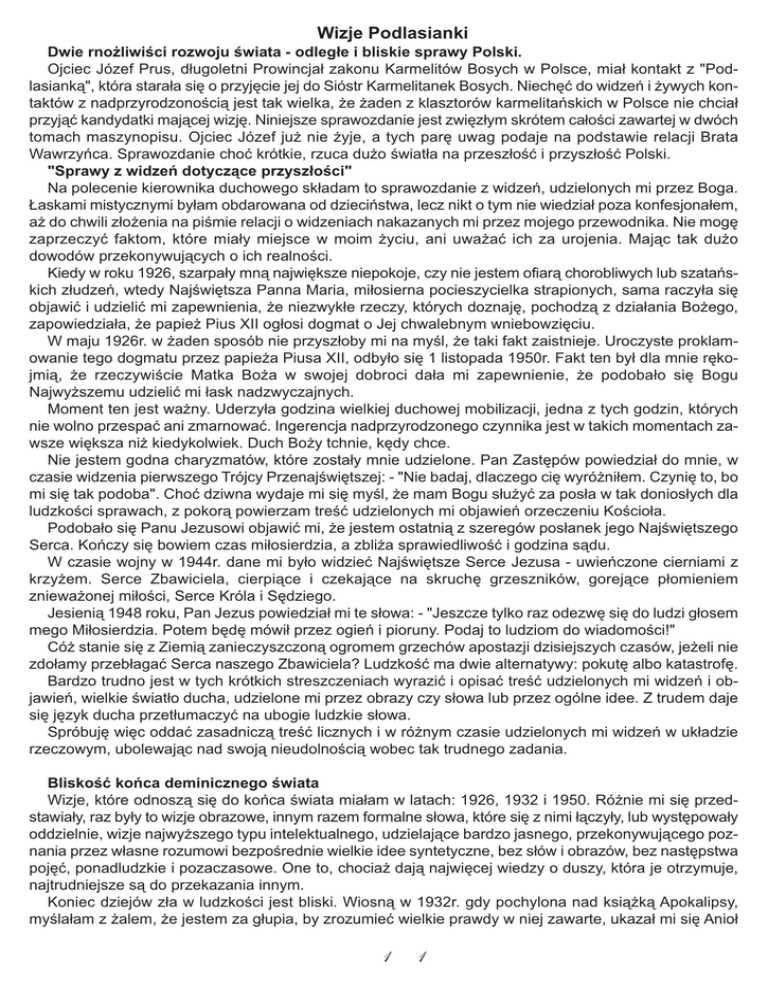 Wizje Podlasianki Dwie rnożliwiści rozwoju świata - odległe i bliskie sprawy Polski. Ojciec Józef Prus, długoletni Prowincjał zakonu Karmelitów Bosych w Polsce, miał kontakt z "Podlasianką", która starała się o przyjęcie jej do Sióstr Karmelitanek Bosych. Niechęć do widzeń i żywych kontaktów z nadprzyrodzonością jest tak wielka, że żaden z klasztorów karmelitańskich w Polsce nie chciał przyjąć kandydatki mającej wizję. Niniejsze sprawozdanie jest zwięzłym skrótem całości zawartej w dwóch tomach maszynopisu. Ojciec Józef już nie żyje, a tych parę uwag podaje na podstawie relacji Brata Wawrzyńca. Sprawozdanie choć krótkie, rzuca dużo światła na przeszłość i przyszłość Polski. "Sprawy z widzeń dotyczące przyszłości" Na polecenie kierownika duchowego składam to sprawozdanie z widzeń, udzielonych mi przez Boga. Łaskami mistycznymi byłam obdarowana od dzieciństwa, lecz nikt o tym nie wiedział poza konfesjonałem, aż do chwili złożenia na piśmie relacji o widzeniach nakazanych mi przez mojego przewodnika. Nie mogę zaprzeczyć faktom, które miały miejsce w moim życiu, ani uważać ich za urojenia. Mając tak dużo dowodów przekonywujących o ich realności. Kiedy w roku 1926, szarpały mną największe niepokoje, czy nie jestem ofiarą chorobliwych lub szatańskich złudzeń, wtedy Najświętsza Panna Maria, miłosierna pocieszycielka strapionych, sama raczyła się objawić i udzielić mi zapewnienia, że niezwykłe rzeczy, których doznaję, pochodzą z działania Bożego, zapowiedziała, że papież Pius XII ogłosi dogmat o Jej chwalebnym wniebowzięciu. W maju 1926r. w żaden sposób nie przyszłoby mi na myśl, że taki fakt zaistnieje. Uroczyste proklamowanie tego dogmatu przez papieża Piusa XII, odbyło się 1 listopada 1950r. Fakt ten był dla mnie rękojmią, że rzeczywiście Matka Boża w swojej dobroci dała mi zapewnienie, że podobało się Bogu Najwyższemu udzielić mi łask nadzwyczajnych. Moment ten jest ważny. Uderzyła godzina wielkiej duchowej mobilizacji, jedna z tych godzin, których nie wolno przespać ani zmarnować. Ingerencja nadprzyrodzonego czynnika jest w takich momentach zawsze większa niż kiedykolwiek. Duch Boży tchnie, kędy chce. Nie jestem godna charyzmatów, które zostały mnie udzielone. Pan Zastępów powiedział do mnie, w czasie widzenia pierwszego Trójcy Przenajświętszej: - "Nie badaj, dlaczego cię wyróżniłem. Czynię to, bo mi się tak podoba". Choć dziwna wydaje mi się myśl, że mam Bogu służyć za posła w tak doniosłych dla ludzkości sprawach, z pokorą powierzam treść udzielonych mi objawień orzeczeniu Kościoła. Podobało się Panu Jezusowi objawić mi, że jestem ostatnią z szeregów posłanek jego Najświętszego Serca. Kończy się bowiem czas miłosierdzia, a zbliża sprawiedliwość i godzina sądu. W czasie wojny w 1944r. dane mi było widzieć Najświętsze Serce Jezusa - uwieńczone cierniami z krzyżem. Serce Zbawiciela, cierpiące i czekające na skruchę grzeszników, gorejące płomieniem znieważonej miłości, Serce Króla i Sędziego. Jesienią 1948 roku, Pan Jezus powiedział mi te słowa: - "Jeszcze tylko raz odezwę się do ludzi głosem mego Miłosierdzia. Potem będę mówił przez ogień i pioruny. Podaj to ludziom do wiadomości!" Cóż stanie się z Ziemią zanieczyszczoną ogromem grzechów apostazji dzisiejszych czasów, jeżeli nie zdołamy przebłagać Serca naszego Zbawiciela? Ludzkość ma dwie alternatywy: pokutę albo katastrofę. Bardzo trudno jest w tych krótkich streszczeniach wyrazić i opisać treść udzielonych mi widzeń i objawień, wielkie światło ducha, udzielone mi przez obrazy czy słowa lub przez ogólne idee. Z trudem daje się język ducha przetłumaczyć na ubogie ludzkie słowa. Spróbuję więc oddać zasadniczą treść licznych i w różnym czasie udzielonych mi widzeń w układzie rzeczowym, ubolewając nad swoją nieudolnością wobec tak trudnego zadania. Bliskość końca deminicznego świata Wizje, które odnoszą się do końca świata miałam w latach: 1926, 1932 i 1950. Różnie mi się przedstawiały, raz były to wizje obrazowe, innym razem formalne słowa, które się z nimi łączyły, lub występowały oddzielnie, wizje najwyższego typu intelektualnego, udzielające bardzo jasnego, przekonywującego poznania przez własne rozumowi bezpośrednie wielkie idee syntetyczne, bez słów i obrazów, bez następstwa pojęć, ponadludzkie i pozaczasowe. One to, chociaż dają najwięcej wiedzy o duszy, która je otrzymuje, najtrudniejsze są do przekazania innym. Koniec dziejów zła w ludzkości jest bliski. Wiosną w 1932r. gdy pochylona nad książką Apokalipsy, myślałam z żalem, że jestem za głupia, by zrozumieć wielkie prawdy w niej zawarte, ukazał mi się Anioł 1 1 jasny, jako młodzieniec w białych szatach ze złotą opaską na długich włosach i tak rzekł do mnie: "Wiele z tego co tu napisane, spełni się w twoich czasach. Wznieś oczy". Kiedy podniosłam wzrok (nie mogłam uczynić innego ruchu, gdyż ekstaza mnie unieruchomiła), ujrzałam na obłoku na niebie wielką białą księgę, zamkniętą na pieczęcie. Naraz wionął wiatr, zerwał pieczęcie i począł odwracać karty księgi, odniosłam wrażenie, że odwrócił ich wiele, może kilkaset, przez chwilę wiatr przestał wiać i ujrzałam kartę zapisaną literami gorejącymi blaskiem. Anioł rzekł: -" Ta karta odpowiada obecnym czasom". Wiatr powiał znowu, odwróciło się kilka kartek, może pięć i księga zamknęła się. - "Czy mam rozumieć, że tak blisko jest koniec tego świata?" Zapytałam zrozumiawszy symbolikę widzenia. - "Tak" - odpowiedział Anioł i wyjaśnił mi, że ilość stron nie oznacza jednak konkretnej liczby lat, po prostu wyraża stosunek czasu, jaki jeszcze pozostał do końca świata, a tego który już upłynął. - "Ludzkość wkracza w ostatnią (trzecią) fazę swego rozwoju". 
