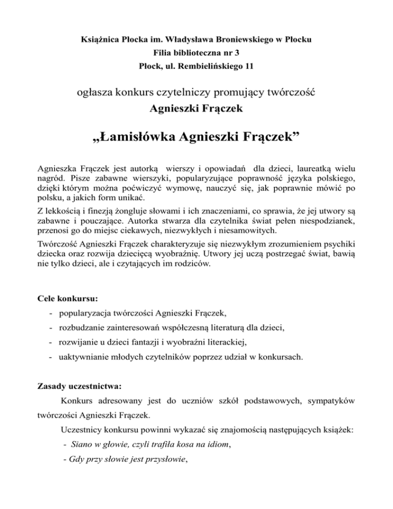 Książnica Płocka im. Władysława Broniewskiego w Płocku Filia biblioteczna nr 3 Płock, ul. Rembielińskiego 11 ogłasza konkurs czytelniczy promujący twórczość Agnieszki Frączek „Łamisłówka Agnieszki Frączek” Agnieszka Frączek jest autorką wierszy i opowiadań dla dzieci, laureatką wielu nagród. Pisze zabawne wierszyki, popularyzujące poprawność języka polskiego, dzięki którym można poćwiczyć wymowę, nauczyć się, jak poprawnie mówić po polsku, a jakich form unikać. Z lekkością i finezją żongluje słowami i ich znaczeniami, co sprawia, że jej utwory są zabawne i pouczające. Autorka stwarza dla czytelnika świat pełen niespodzianek, przenosi go do miejsc ciekawych, niezwykłych i niesamowitych. Twórczość Agnieszki Frączek charakteryzuje się niezwykłym zrozumieniem psychiki dziecka oraz rozwija dziecięcą wyobraźnię. Utwory jej uczą postrzegać świat, bawią nie tylko dzieci, ale i czytających im rodziców. Cele konkursu: - popularyzacja twórczości Agnieszki Frączek, - rozbudzanie zainteresowań współczesną literaturą dla dzieci, - rozwijanie u dzieci fantazji i wyobraźni literackiej, - uaktywnianie młodych czytelników poprzez udział w konkursach. Zasady uczestnictwa: Konkurs adresowany jest do uczniów szkół podstawowych, sympatyków twórczości Agnieszki Frączek. Uczestnicy konkursu powinni wykazać się znajomością następujących książek: - Siano w głowie, czyli trafiła kosa na idiom, - Gdy przy słowie jest przysłowie, - Jedna literka, a zmiana wielka, - Kanapka i innych wierszy kapka, - Dranie w tranie, czyli wiersze trudne niesłychanie, - Złap byka za rogi. Konkurs przebiegać będzie w II etapach: I etap - eliminacje szkolne II etap - finał W I etapie szkoły, które zgłoszą swój udział w konkursie, wytypują po 4 najlepszych zawodników, którzy stanowić będą zespół. Drużyny wytypowane w eliminacjach szkolnych zmierzą się w finale, który odbędzie się 14 kwietnia 2016 r. w siedzibie Filii bibliotecznej nr 3 przy ul. Rembielińskiego 11. Zgłoszenia finalistów należy przesłać do dnia 31 marca 2016 r. do Książnicy Płockiej - Filia biblioteczna nr 3, ul. Rembielińskiego 11, tel. 24 268 00 50, e-mail: [email protected] Ocena: Powołana przez organizatora komisja konkursowa zwracać będzie uwagę nie tylko na znajomość utworów i poprawność odpowiedzi, ale także na styl wypowiedzi. Jury przyzna uczestnikom finału nagrodę główną oraz wyróżnienia. Nagrodę stanowić będą książki oraz możliwość przeprowadzenia wywiadu z autorem zaraz po zakończeniu konkursu. Komisja zastrzega sobie inny podział nagród. Postanowienia ogólne: Udział w konkursie jest równoznaczny z wyrażeniem zgody na przetwarzanie danych osobowych uczestników na potrzeby konkursu w bazie danych prowadzonej przez Książnicę Płocką im. Władysława Broniewskiego w Płocku przy ul. Kościuszki 6, zgodnie z Ustawą z dnia 29 sierpnia 1997 r. o ochronie danych osobowych (Dz. U. z 2002 r. Nr 101, poz. 926, z późn. zm.). Ponadto organizator zastrzega sobie, że zgoda na udział dziecka w konkursie jest jednoznaczna z akceptacją nieodpłatnego wykorzystania wizerunku dziecka przez organizatora konkursu – Książnicę Płocką - zgodnie z ustawą z dnia 4 lutego 1994 r. o prawie autorskim i prawach pokrewnych, do celów związanych z promocją działalności organizatora konkursu. Możliwe formy rozpowszechniania wizerunku to publikacje, Internet, telewizja. Wszystkim uczestnikom życzymy przyjemnej lektury i sukcesów w konkursie!!!