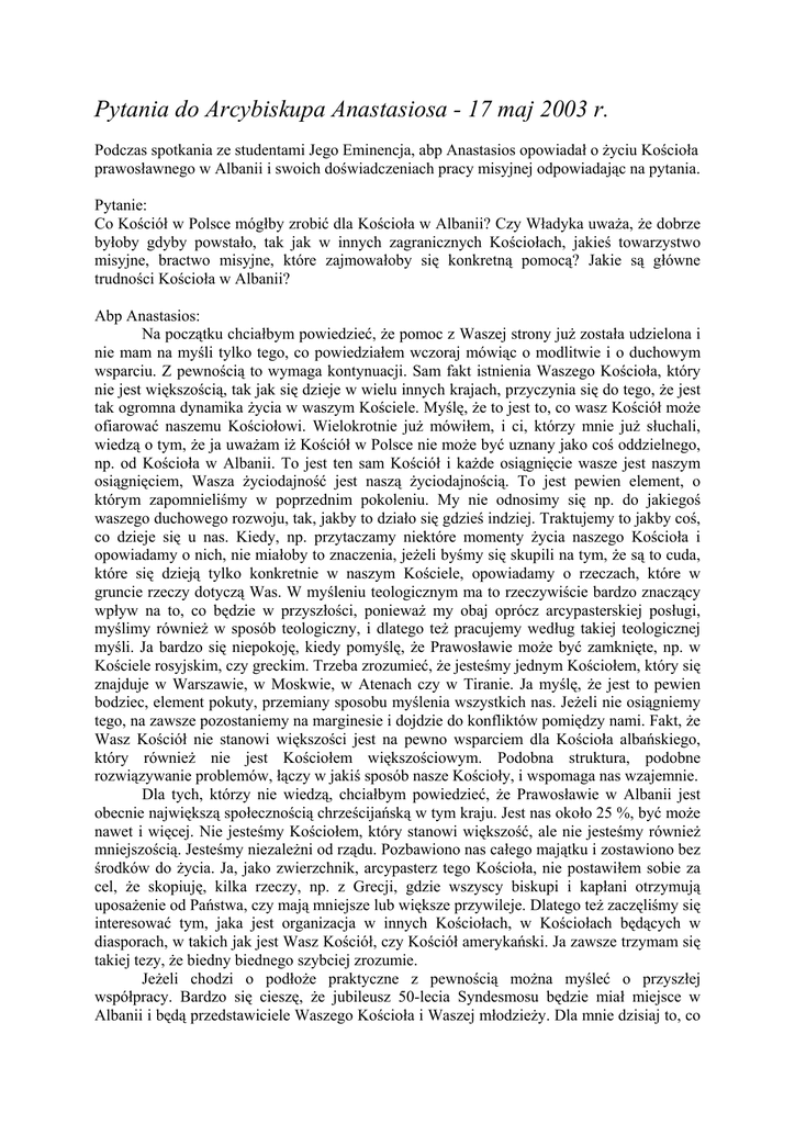 Pytania do Arcybiskupa Anastasiosa - 17 maj 2003 r. Podczas spotkania ze studentami Jego Eminencja, abp Anastasios opowiadał o życiu Kościoła prawosławnego w Albanii i swoich doświadczeniach pracy misyjnej odpowiadając na pytania. Pytanie: Co Kościół w Polsce mógłby zrobić dla Kościoła w Albanii? Czy Władyka uważa, że dobrze byłoby gdyby powstało, tak jak w innych zagranicznych Kościołach, jakieś towarzystwo misyjne, bractwo misyjne, które zajmowałoby się konkretną pomocą? Jakie są główne trudności Kościoła w Albanii? Abp Anastasios: Na początku chciałbym powiedzieć, że pomoc z Waszej strony już została udzielona i nie mam na myśli tylko tego, co powiedziałem wczoraj mówiąc o modlitwie i o duchowym wsparciu. Z pewnością to wymaga kontynuacji. Sam fakt istnienia Waszego Kościoła, który nie jest większością, tak jak się dzieje w wielu innych krajach, przyczynia się do tego, że jest tak ogromna dynamika życia w waszym Kościele. Myślę, że to jest to, co wasz Kościół może ofiarować naszemu Kościołowi. Wielokrotnie już mówiłem, i ci, którzy mnie już słuchali, wiedzą o tym, że ja uważam iż Kościół w Polsce nie może być uznany jako coś oddzielnego, np. od Kościoła w Albanii. To jest ten sam Kościół i każde osiągnięcie wasze jest naszym osiągnięciem, Wasza życiodajność jest naszą życiodajnością. To jest pewien element, o którym zapomnieliśmy w poprzednim pokoleniu. My nie odnosimy się np. do jakiegoś waszego duchowego rozwoju, tak, jakby to działo się gdzieś indziej. Traktujemy to jakby coś, co dzieje się u nas. Kiedy, np. przytaczamy niektóre momenty życia naszego Kościoła i opowiadamy o nich, nie miałoby to znaczenia, jeżeli byśmy się skupili na tym, że są to cuda, które się dzieją tylko konkretnie w naszym Kościele, opowiadamy o rzeczach, które w gruncie rzeczy dotyczą Was. W myśleniu teologicznym ma to rzeczywiście bardzo znaczący wpływ na to, co będzie w przyszłości, ponieważ my obaj oprócz arcypasterskiej posługi, myślimy również w sposób teologiczny, i dlatego też pracujemy według takiej teologicznej myśli. Ja bardzo się niepokoję, kiedy pomyślę, że Prawosławie może być zamknięte, np. w Kościele rosyjskim, czy greckim. Trzeba zrozumieć, że jesteśmy jednym Kościołem, który się znajduje w Warszawie, w Moskwie, w Atenach czy w Tiranie. Ja myślę, że jest to pewien bodziec, element pokuty, przemiany sposobu myślenia wszystkich nas. Jeżeli nie osiągniemy tego, na zawsze pozostaniemy na marginesie i dojdzie do konfliktów pomiędzy nami. Fakt, że Wasz Kościół nie stanowi większości jest na pewno wsparciem dla Kościoła albańskiego, który również nie jest Kościołem większościowym. Podobna struktura, podobne rozwiązywanie problemów, łączy w jakiś sposób nasze Kościoły, i wspomaga nas wzajemnie. Dla tych, którzy nie wiedzą, chciałbym powiedzieć, że Prawosławie w Albanii jest obecnie największą społecznością chrześcijańską w tym kraju. Jest nas około 25 %, być może nawet i więcej. Nie jesteśmy Kościołem, który stanowi większość, ale nie jesteśmy również mniejszością. Jesteśmy niezależni od rządu. Pozbawiono nas całego majątku i zostawiono bez środków do życia. Ja, jako zwierzchnik, arcypasterz tego Kościoła, nie postawiłem sobie za cel, że skopiuję, kilka rzeczy, np. z Grecji, gdzie wszyscy biskupi i kapłani otrzymują uposażenie od Państwa, czy mają mniejsze lub większe przywileje. Dlatego też zaczęliśmy się interesować tym, jaka jest organizacja w innych Kościołach, w Kościołach będących w diasporach, w takich jak jest Wasz Kościół, czy Kościół amerykański. Ja zawsze trzymam się takiej tezy, że biedny biednego szybciej zrozumie. Jeżeli chodzi o podłoże praktyczne z pewnością można myśleć o przyszłej współpracy. Bardzo się cieszę, że jubileusz 50-lecia Syndesmosu będzie miał miejsce w Albanii i będą przedstawiciele Waszego Kościoła i Waszej młodzieży. Dla mnie dzisiaj to, co jest wewnętrzne i to, co jest zewnętrzne w Kościele nie ma znaczenia terytorialnego. I ja np. mówiąc o misji nie mam jakiegoś złudnego pojęcia, że udamy się z nią tylko i wyłącznie do Azji czy Afryki. Najważniejsze jest to, że jest ona prowadzona wśród tych, którzy są poza Kościołem, i to „poza Kościołem” nie oznacza odległości, ale jest to również problemem socjalnym i społecznym. Teraz Polska zostanie przyjęta do Unii Europejskiej, Albania też zmierza do zjednoczonej Europy. Będziemy w obszarze demokracji, a nawet wręcz jakiegoś cesarstwa. Nie możemy być jednak odosobnieni, wszyscy prawosławni powinniśmy zaświadczyć o swoim istnieniu we Wspólnocie Europejskiej. W Albanii posiadamy szkołę teologiczną podobną do Seminarium, w której również uczą się wszyscy po liceum. Na pierwszym roku studiów, w istocie muszą się nauczyć dwóch języków, tj. angielskiego i greckiego i oczywiście muszą się nauczyć obsługiwać komputer, który też jest swoistym językiem Pytanie: Jakie czynniki wpłynęły na odbudowę struktury kościelnej w Albanii? Abp Anastasios: Chciałbym powiedzieć o trzech cechach wyróżniających nasz Kościół. Pierwszą z nich jest to, że przez 20 lat on w ogóle nie istniał. Było to spowodowane panującym wtedy systemem komunistycznym. Początkowy okres komunistyczny trwał 23 lata, wtedy oczywiście już została naruszona struktura Kościoła, ale jeszcze w tym okresie każdy mógł uczynić na sobie znak krzyża i nikt nikogo za to nie więził. Drugi okres, który trwał od 1967 do 1991 roku był okresem, jakiego nie doświadczył żaden inny Kościół i bardzo trudno jest to nam sobie wyobrazić. Proszę sobie przedstawić, że w takim małym państwie, był surowo zabroniony jakikolwiek przejaw religijności. Jeżeli, przykładowo nauczyciel zapytał jakieś dziecko (uc