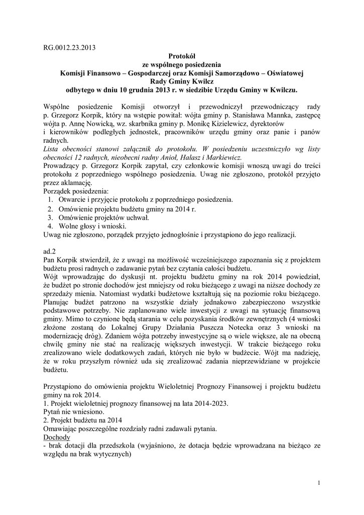RG.0012.23.2013 Protokół ze wspólnego posiedzenia Komisji Finansowo – Gospodarczej oraz Komisji Samorządowo – Oświatowej Rady Gminy Kwilcz odbytego w dniu 10 grudnia 2013 r. w siedzibie Urzędu Gminy w Kwilczu. Wspólne posiedzenie Komisji otworzył i przewodniczył przewodniczący rady p. Grzegorz Korpik, który na wstępie powitał: wójta gminy p. Stanisława Mannka, zastępcę wójta p. Annę Nowicką, wz. skarbnika gminy p. Monikę Kizielewicz, dyrektorów i kierowników podległych jednostek, pracowników urzędu gminy oraz panie i panów radnych. Lista obecności stanowi załącznik do protokołu. W posiedzeniu uczestniczyło wg listy obecności 12 radnych, nieobecni radny Anioł, Halasz i Markiewicz. Prowadzący p. Grzegorz Korpik zapytał, czy członkowie komisji wnoszą uwagi do treści protokołu z poprzedniego wspólnego posiedzenia. Uwag nie zgłoszono, protokół przyjęto przez aklamację. Porządek posiedzenia: 1. Otwarcie i przyjęcie protokołu z poprzedniego posiedzenia. 2. Omówienie projektu budżetu gminy na 2014 r. 3. Omówienie projektów uchwał. 4. Wolne głosy i wnioski. Uwag nie zgłoszono, porządek przyjęto jednogłośnie i przystąpiono do jego realizacji. ad.2 Pan Korpik stwierdził, że z uwagi na możliwość wcześniejszego zapoznania się z projektem budżetu prosi radnych o zadawanie pytań bez czytania całości budżetu. Wójt wprowadzając do dyskusji nt. projektu budżetu gminy na rok 2014 powiedział, że budżet po stronie dochodów jest mniejszy od roku bieżącego z uwagi na niższe dochody ze sprzedaży mienia. Natomiast wydatki budżetowe kształtują się na poziomie roku bieżącego. Planując budżet patrzono na wszystkie działy jednakowo zabezpieczono wszystkie podstawowe potrzeby. Nie zaplanowano wiele inwestycji z uwagi na sytuację finansową gminy. Mimo to czynione będą starania w celu pozyskania środków zewnętrznych (4 wnioski złożone zostaną do Lokalnej Grupy Działania Puszcza Notecka oraz 3 wnioski na modernizację dróg). Zdaniem wójta potrzeby inwestycyjne są o wiele większe, ale na obecną chwilę gminy nie stać na realizację większych inwestycji. W trakcie bieżącego roku zrealizowano wiele dodatkowych zadań, których nie było w budżecie. Wójt ma nadzieję, że w roku przyszłym również uda się zrealizować zadania nieprzewidziane w projekcie budżetu. Przystąpiono do omówienia projektu Wieloletniej Prognozy Finansowej i projektu budżetu gminy na rok 2014. 1. Projekt wieloletniej prognozy finansowej na lata 2014-2023. Pytań nie wniesiono. 2. Projekt budżetu na 2014 Omawiając poszczególne rozdziały radni zadawali pytania. Dochody - brak dotacji dla przedszkola (wyjaśniono, że dotacja będzie wprowadzana na bieżąco ze względu na brak wytycznych) 1 - sprzedaży działek za kwotę 300.000 zł (proszono o przygotowanie lokalizacji wykazu działek) - dochodów z tytułu wynajmu sal sportowych i świetlic wiejskich (proszono o przygotowania zestawienia) Wydatki Pan Lehmann – czy zachodzi potrzeba planowania składki członkowskiej na Stowarzyszenie Lokalna Grupa Rybacka „Obra-Warta” skoro z nowym rokiem stowarzyszenie kończy swoją działalność. Pan Wójt - w pierwszym półroczu działalność jeszcze będzie prowadzona. Zmiany mają nastąpić w trakcie roku. Pan Klapczyński – czy wiadomo coś w kwestii dofinansowania remontu drogi Lubosz – Chudobczyce? Wójt -w pierwszym rozdaniu wniosek został odrzucony czekamy na decyzję w drugim rozdaniu. Pan Korpik czy jeżeli wniosek nie uzyska wymaganej ilości punktów, inwestycja będzie realizowana ze środków powiatu i gminy? Wójt - jeżeli zostaną zachowane proporcje i remont będzie prowadzony na całej długości drogi do zadania przystąpimy. Jeżeli będzie to inwestycja tylko na fragmencie drogi w samym Luboszu nie ma sensu inwestować. Pan Korpik -wniósł uwagę do kwestii inwestowania w infrastrukturę (nie tylko drogowo chodnikową), jego zdaniem przed przystąpieniem do realizacji zadań w tym zakresie winniśmy sprawdzić czy mieszkańcy wywiązują się z podstawowych obowiązków na nich nałożonych. Pani Stanisławska – czy są umowy z indywidualnymi osobami na odśnieżanie dróg i jaka jest wartość tych umów. Pan Wasik zimowym utrzymaniem dróg zajmuje się ZOMS umowy indywidualne zawierane są w sytuacjach dużych opadów śniegu. Pani Stanisławska, – jakie umowy zawierane są z ratownikami kąpielisk, że kwota na wynagrodzeniach jest tak wysoka za 2 miesiące pracy. Pani Kizielewicz –z ratownikami sporządzane są umowy – zlecenia na czas określony tj. okres 2 miesięcy nie uzależniamy pracy od pogody. Pani Stanisławska – czy niema innych możliwości tańszego zatrudnienia. Pani Nowicka – kwestia zatrudniania ratowników była szczegółowo analizowana wcześniej były to umowy o pracę, kosztowniejsze od obecnych. Jeżeli wynagrodzenie będzie bardzo niskie będą problemy. Już w br. gmina borykała się z trudnościami zatrudnienia ratowników. Pan Korpik jest zdania, że na wysokość wynagrodzenia składa się wiele czynników między innymi sezonowość pracy, odpowiedzialność, czas pracy nie tylko w dni powszednie, ale również w niedziele. Czy wiadomym jest, kto będzie prowadził nadzór w sezonie letnim nad kąpieliskami i czy 26 tys. zł na usługach nie jest zbyt wysoką kwotą? Zdaniem radnego zbyt dużo osób zajmuje się sprawami kąpielisk, należy przyjrzeć się tej sprawie. Pan Wróblewski czy są dane nt. wysokości czynszu dzierżawnego za plażę w Kwilczu? Przekazano radnym na piśmie informacje nt. wysokości stawki wg umowy. Dyskutowano nt. umowy i wysokości czynszu dzierżawnego za plażę w Orzeszkowie. Pani Stanisławska, – jakiego budynku dotyczy remont dachu przy ul. Miłostowskiej, ponadto wysoką kwotę zaplanowano na wykup gruntów pod drogi. O jakie drogi chodzi i za jaką stawkę ma być wykup. Pan Wójt budynek przy ul. Miłostowskiej w czę
