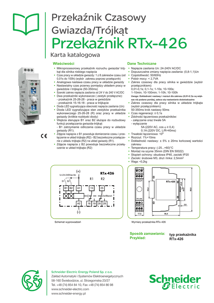 Przekaźnik Czasowy Gwiazda/Trójkąt Przekaźnik RTx-426 Karta katalogowa Właściwości Dane Techniczne w Mikroprocesorowy przekaźnik rozruchu gwiazda/ trójkąt dla silnika niskiego napięcia w Czas pracy w układzie gwiazdy: 1 z 8 zakresów czasu (od 0,01s do 100h) (wybór zakresu poprzez przełącznik) w Analogowa nastawa czasu pracy w układzie gwiazdy w Nastawialny czas przerwy pomiędzy układem pracy w gwieździe i trójkącie (50-350ms) w Szeroki zakres napięcia zasilania od 24 V do 240 V AC/DC w Dwa przekaźniki wykonawcze ( zestyki przełączne): - przekaźnik 25-26-28 - praca w gwieździe - przekaźnik 15-16-18 - praca w trójkącie w Dioda LED sygnalizująca obecność napięcia zasilania (Un) w Dioda LED sygnalizująca stan zestyków przekaźnika wykonawczego 25-26-28 (R) oraz pracy w układzie gwiazdy (krótkie rozbłyski diody) w Wejścia sterujące B1 oraz B2 służące do rozbudowy funkcji przełączania gwiazda-trójkąt: - B1 zatrzymanie odliczania czasu pracy w układzie gwiazdy (R1). w Zdjęcie napięcia z B1 powoduje domierzenie czasu i przełączenie w układ trójkąta (R2) - B2 bezzwłoczne przełączenie z układu trójkąta (R2) na układ gwiazdy (R1). w Zdjęcie napięcia z B2 powoduje bezzwłoczne przełączenie w układ trójkąta (R2) w w w w w sze niż podano poniżej, zaleca się nastawianie doświadczalne w Zakres czasowy dla pracy silnika w układzie trójkąta (wybór przełącznikiem): 50-350ms krok nastawy 50ms w Czas regeneracji: ≤ 0,1s w Zdolność łączeniowa przekaźników: - załączanie oraz trwale 5A - wyłączanie 5A (220V AC, cos ϕ ≥ 0,4) 0,1A (220V DC, L/R=40ms) w Trwałość łączeniowa: 105 w Rozrzut: 1%+10ms w Dokładność nastawy: ± 5% ± 20ms końcowej wartości zakresu w Temperatura pracy: (-25...+60)°C w Montaż na szynie 35mm (DIN EN 50022) w Stopień ochrony: obudowa IP40, zaciski IP20 w Zaciski: śrubowe M3, drut i linka: 2,5mm2 w Waga: <0,2kg 90,0 25 RTx-426 35,4 15 R 23,0 U 65,8 S2 A1 15 B1 B2 25 U=24-240Vac/dc B1 B2 Uwaga: Dokładność nastawy i rozrzut dla zakresu (0,01-0,1)s są więk- A1 (+) S1 Napięcie zasilania Un: 24-240V AC/DC Dopuszczalne zmiany napięcia zasilania: (0,8-1,1)Un Częstotliwość: 50/60Hz Pobór mocy: < 2,7VA Zakres czasowy dla pracy silnika w gwieździe (wybór przełącznikiem): 0,01-0,1s; 0,1-1s; 1-10s; 10-100s; 1-10min; 10-100min; 1-10h; 10-100h Zwl/Bezwl RTx-426 A2 16 18 26 28 (-) Schemat wyprowadzeń 3,0 28 26 18 16 A2 17,5 56,4 Wymiary przekaźnika RTx-426 Sposób zamawiania: Przykład: Schneider Electric Energy Poland Sp. z o.o. Zakład Automatyki i Systemów Elektroenergetycznych 58-160 Świebodzice, ul. Strzegomska 23/27 Tel. +48 (74) 854 84 10, Fax +48 (74) 854 86 98 www.schneider-electric.com www.schneider-energy.pl typ przekaźnika RTx-426