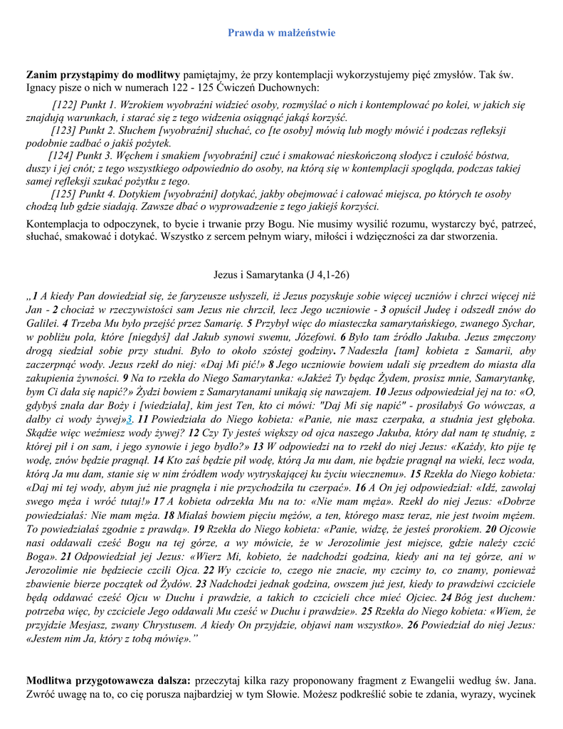 Prawda w małżeństwie Zanim przystąpimy do modlitwy pamiętajmy, że przy kontemplacji wykorzystujemy pięć zmysłów. Tak św. Ignacy pisze o nich w numerach 122 - 125 Ćwiczeń Duchownych: [122] Punkt 1. Wzrokiem wyobraźni widzieć osoby, rozmyślać o nich i kontemplować po kolei, w jakich się znajdują warunkach, i starać się z tego widzenia osiągnąć jakąś korzyść. [123] Punkt 2. Słuchem [wyobraźni] słuchać, co [te osoby] mówią lub mogły mówić i podczas refleksji podobnie zadbać o jakiś pożytek. [124] Punkt 3. Węchem i smakiem [wyobraźni] czuć i smakować nieskończoną słodycz i czułość bóstwa, duszy i jej cnót; z tego wszystkiego odpowiednio do osoby, na którą się w kontemplacji spogląda, podczas takiej samej refleksji szukać pożytku z tego. [125] Punkt 4. Dotykiem [wyobraźni] dotykać, jakby obejmować i całować miejsca, po których te osoby chodzą lub gdzie siadają. Zawsze dbać o wyprowadzenie z tego jakiejś korzyści. Kontemplacja to odpoczynek, to bycie i trwanie przy Bogu. Nie musimy wysilić rozumu, wystarczy być, patrzeć, słuchać, smakować i dotykać. Wszystko z sercem pełnym wiary, miłości i wdzięczności za dar stworzenia. Jezus i Samarytanka (J 4,1-26) „1 A kiedy Pan dowiedział się, że faryzeusze usłyszeli, iż Jezus pozyskuje sobie więcej uczniów i chrzci więcej niż Jan - 2 chociaż w rzeczywistości sam Jezus nie chrzcił, lecz Jego uczniowie - 3 opuścił Judeę i odszedł znów do Galilei. 4 Trzeba Mu było przejść przez Samarię. 5 Przybył więc do miasteczka samarytańskiego, zwanego Sychar, w pobliżu pola, które [niegdyś] dał Jakub synowi swemu, Józefowi. 6 Było tam źródło Jakuba. Jezus zmęczony drogą siedział sobie przy studni. Było to około szóstej godziny. 7 Nadeszła [tam] kobieta z Samarii, aby zaczerpnąć wody. Jezus rzekł do niej: «Daj Mi pić!» 8 Jego uczniowie bowiem udali się przedtem do miasta dla zakupienia żywności. 9 Na to rzekła do Niego Samarytanka: «Jakżeż Ty będąc Żydem, prosisz mnie, Samarytankę, bym Ci dała się napić?» Żydzi bowiem z Samarytanami unikają się nawzajem. 10 Jezus odpowiedział jej na to: «O, gdybyś znała dar Boży i [wiedziała], kim jest Ten, kto ci mówi: "Daj Mi się napić" - prosiłabyś Go wówczas, a dałby ci wody żywej»3. 11 Powiedziała do Niego kobieta: «Panie, nie masz czerpaka, a studnia jest głęboka. Skądże więc weźmiesz wody żywej? 12 Czy Ty jesteś większy od ojca naszego Jakuba, który dał nam tę studnię, z której pił i on sam, i jego synowie i jego bydło?» 13 W odpowiedzi na to rzekł do niej Jezus: «Każdy, kto pije tę wodę, znów będzie pragnął. 14 Kto zaś będzie pił wodę, którą Ja mu dam, nie będzie pragnął na wieki, lecz woda, którą Ja mu dam, stanie się w nim źródłem wody wytryskającej ku życiu wiecznemu». 15 Rzekła do Niego kobieta: «Daj mi tej wody, abym już nie pragnęła i nie przychodziła tu czerpać». 16 A On jej odpowiedział: «Idź, zawołaj swego męża i wróć tutaj!» 17 A kobieta odrzekła Mu na to: «Nie mam męża». Rzekł do niej Jezus: «Dobrze powiedziałaś: Nie mam męża. 18 Miałaś bowiem pięciu mężów, a ten, którego masz teraz, nie jest twoim mężem. To powiedziałaś zgodnie z prawdą». 19 Rzekła do Niego kobieta: «Panie, widzę, że jesteś prorokiem. 20 Ojcowie nasi oddawali cześć Bogu na tej górze, a wy mówicie, że w Jerozolimie jest miejsce, gdzie należy czcić Boga». 21 Odpowiedział jej Jezus: «Wierz Mi, kobieto, że nadchodzi godzina, kiedy ani na tej górze, ani w Jerozolimie nie będziecie czcili Ojca. 22 Wy czcicie to, czego nie znacie, my czcimy to, co znamy, ponieważ zbawienie bierze początek od Żydów. 23 Nadchodzi jednak godzina, owszem już jest, kiedy to prawdziwi czciciele będą oddawać cześć Ojcu w Duchu i prawdzie, a takich to czcicieli chce mieć Ojciec. 24 Bóg jest duchem: potrzeba więc, by czciciele Jego oddawali Mu cześć w Duchu i prawdzie». 25 Rzekła do Niego kobieta: «Wiem, że przyjdzie Mesjasz, zwany Chrystusem. A kiedy On przyjdzie, objawi nam wszystko». 26 Powiedział do niej Jezus: «Jestem nim Ja, który z tobą mówię».” Modlitwa przygotowawcza dalsza: przeczytaj kilka razy proponowany fragment z Ewangelii według św. Jana. Zwróć uwagę na to, co cię porusza najbardziej w tym Słowie. Możesz podkreślić sobie te zdania, wyrazy, wycinek tekstu. Pamiętaj, żeby słuchać sercem, zapamiętywać to, co zaczęło do ciebie przemawiać. Możesz przeczytać punkta, zaznaczyć te, które cię na ten czas poruszają. Pamiętaj jednak, że "Nie ilość wiedzy, ale wewnętrzne odczuwanie i smakowanie rzeczy zadowala i nasyca duszę"-ĆD 2, więc nie "szukajmy" wielu treści, nieraz jedno słowo wystarczająco do nas przemówi. Modlitwa przygotowawcza zwyczajna: w wybranym miejscu i pozycji zacznij od znaku Krzyża, trzeba mieć świadomość, że stajemy przed Bogiem, przed całym Jego miłosierdziem, pozwól, by Jego łaska w nas działała – być mógł widzieć, słyszeć, czuć i dotykać – być uczestnikiem w sceny z Ewangelii. Prośba o właściwą intencję: Następnie Ignacy proponuje modlitwę z 46 numeru Ćwiczeń Duchownych: Prosić Boga, Pana naszego, aby wszystkie moje zamiary, decyzje i czyny były skierowane w sposób czysty do służby i chwały Jego Boskiego Majestatu (ĆD 46). Wyobrażenie sobie miejsca: wyobraź sobie, że jesteś razem z Jezusem i Samarytanką, usłysz głos Jezusa, postawę Jego i kobiety, zobacz studnię, przy której Jezus siedzi, dzban, który ma Samarytanka. Prośba o owoc kontemplacji: abym potrafił pielęgnować prawdę w moim małżeństwie – abym był nie tylko prawdziwy, szczery wobec mojego współmałżonka, ale i dopuszczał go do prawdy o mnie samym. 1. „Daj mi pić!” – Jezus wprost mówi Samarytance o swojej potrzebie/pragnieniu. Nie zataja tej potrzeby, nie mówi „naokoło”, nie liczy, że kobie