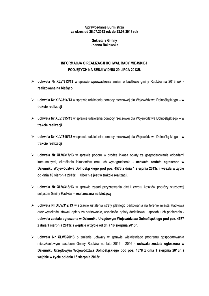Sprawozdanie złożone na sesji z dnia 26 sierpnia 2013