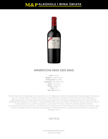 MINERVOIS MAS DES MAS Kraj: Francja Region: Langwedocja Producent: Paul Mas Apelacja: AOC Minervois Kolor: czerwone Smak: wytrawne Poj.: 0,75 Zaw. Alk. %: 14,5 Mas de Mas to wina zabierające nas w podróż do serca najlepszych apelacji Langwedocji.Kompozycja gron zbieranych ręcznie z odmian Syrah, Carignan i Grenache z około 30 letnich nasadzeń. Syrah i Grenache są winifikowane w tradycyjny sposób, Carignan przechodzi macerację węglową. Po fermentacji malolaktycznej wina są blendowane. Następnie 40% dojrzewa w beczkach z amerykańskiego dębu przez 10 miesięcy. Przyjemna dla oka, głęboka szata. W Nosie pieprzne nuty z odrobiną przypraw i czerwonych owoców. Usta pełne, bardzo gładkie z dobrze wkomponowanymi taninami. Długi i aromatyczny finisz z pieprznym akcentem. Polecane do grillowanych żeberek, mięs z sosami z grzybów leśnych, dziczyzny w przyprawach. Przechowywane w odpowiednich warunkach ma potencjał sięgający 10 lat. 59 PLN [email protected] +48 512 270 830