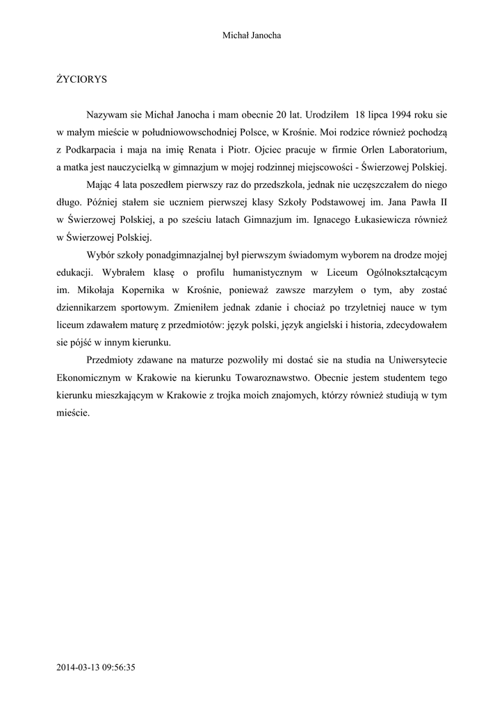 Michał Janocha ŻYCIORYS Nazywam sie Michał Janocha i mam obecnie 20 lat. Urodziłem 18 lipca 1994 roku sie w małym mieście w południowowschodniej Polsce, w Krośnie. Moi rodzice również pochodzą z Podkarpacia i maja na imię Renata i Piotr. Ojciec pracuje w firmie Orlen Laboratorium, a matka jest nauczycielką w gimnazjum w mojej rodzinnej miejscowości - Świerzowej Polskiej. Mając 4 lata poszedłem pierwszy raz do przedszkola, jednak nie uczęszczałem do niego długo. Później stałem sie uczniem pierwszej klasy Szkoły Podstawowej im. Jana Pawła II w Świerzowej Polskiej, a po sześciu latach Gimnazjum im. Ignacego Łukasiewicza również w Świerzowej Polskiej. Wybór szkoły ponadgimnazjalnej był pierwszym świadomym wyborem na drodze mojej edukacji. Wybrałem klasę o profilu humanistycznym w Liceum Ogólnokształcącym im. Mikołaja Kopernika w Krośnie, ponieważ zawsze marzyłem o tym, aby zostać dziennikarzem sportowym. Zmieniłem jednak zdanie i chociaż po trzyletniej nauce w tym liceum zdawałem maturę z przedmiotów: język polski, język angielski i historia, zdecydowałem sie pójść w innym kierunku. Przedmioty zdawane na maturze pozwoliły mi dostać sie na studia na Uniwersytecie Ekonomicznym w Krakowie na kierunku Towaroznawstwo. Obecnie jestem studentem tego kierunku mieszkającym w Krakowie z trojka moich znajomych, którzy również studiują w tym mieście. 2014-03-13 09:56:35