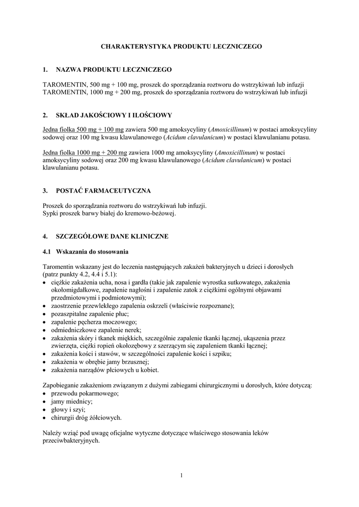 CHARAKTERYSTYKA PRODUKTU LECZNICZEGO 1. NAZWA PRODUKTU LECZNICZEGO TAROMENTIN, 500 mg + 100 mg, proszek do sporządzania roztworu do wstrzykiwań lub infuzji TAROMENTIN, 1000 mg + 200 mg, proszek do sporządzania roztworu do wstrzykiwań lub infuzji 2. SKŁAD JAKOŚCIOWY I ILOŚCIOWY Jedna fiolka 500 mg + 100 mg zawiera 500 mg amoksycyliny (Amoxicillinum) w postaci amoksycyliny sodowej oraz 100 mg kwasu klawulanowego (Acidum clavulanicum) w postaci klawulanianu potasu. Jedna fiolka 1000 mg + 200 mg zawiera 1000 mg amoksycyliny (Amoxicillinum) w postaci amoksycyliny sodowej oraz 200 mg kwasu klawulanowego (Acidum clavulanicum) w postaci klawulanianu potasu. 3. POSTAĆ FARMACEUTYCZNA Proszek do sporządzania roztworu do wstrzykiwań lub infuzji. Sypki proszek barwy białej do kremowo-beżowej. 4. SZCZEGÓŁOWE DANE KLINICZNE 4.1 Wskazania do stosowania Taromentin wskazany jest do leczenia następujących zakażeń bakteryjnych u dzieci i dorosłych (patrz punkty 4.2, 4.4 i 5.1): ciężkie zakażenia ucha, nosa i gardła (takie jak zapalenie wyrostka sutkowatego, zakażenia okołomigdałkowe, zapalenie nagłośni i zapalenie zatok z ciężkimi ogólnymi objawami przedmiotowymi i podmiotowymi); zaostrzenie przewlekłego zapalenia oskrzeli (właściwie rozpoznane); pozaszpitalne zapalenie płuc; zapalenie pęcherza moczowego; odmiedniczkowe zapalenie nerek; zakażenia skóry i tkanek miękkich, szczególnie zapalenie tkanki łącznej, ukąszenia przez zwierzęta, ciężki ropień okołozębowy z szerzącym się zapaleniem tkanki łącznej; zakażenia kości i stawów, w szczególności zapalenie kości i szpiku; zakażenia w obrębie jamy brzusznej; zakażenia narządów płciowych u kobiet. Zapobieganie zakażeniom związanym z dużymi zabiegami chirurgicznymi u dorosłych, które dotyczą: przewodu pokarmowego; jamy miednicy; głowy i szyi; chirurgii dróg żółciowych. Należy wziąć pod uwagę oficjalne wytyczne dotyczące właściwego stosowania leków przeciwbakteryjnych. 1 4.2 Dawkowanie i sposób podawania Dawki są wyrażone w odniesieniu do zawartości amoksycyliny z kwasem klawulanowym z wyjątkiem określenia dawek w odniesieniu do pojedynczego składnika. Określając dawkę produktu Taromentin do stosowania w leczeniu poszczególnych zakażeń należy brać pod uwagę: • przewidywane patogeny i ich prawdopodobną wrażliwość na środki przeciwbakteryjne (patrz punkt 4.4); • ciężkość i umiejscowienie zakażenia; • wiek, masę ciała, czynności nerek pacjenta jak podano poniżej. W razie konieczności należy rozważyć zastosowanie innych postaci lub mocy produktu Taromentin, tj. takich, które zawierają większą dawkę amoksycyliny i (lub) zawierają amoksycylinę i kwas klawulanowegoklawulanowy w innej proporcji (patrz punkty 4.4 i 5.1). Ta postać produktu Taromentin proszek do sporządzania roztworu do wstrzykiwań lub infuzji podawana według poniższych zaleceń zapewnia całkowitą dawkę dobową 3000 mg amoksycyliny i 600 mg kwasu klawulanowego. Jeśli stwierdzi się, że jest konieczne zastosowanie większej dobowej dawki amoksycyliny, zaleca się zastosowanie innej postaci dożylnej produktu Taromentin, aby uniknąć niepotrzebnego podawania dużych dawek dobowych kwasu klawulanowego. Czas prowadzonego leczenia powinien być określany na podstawie odpowiedzi pacjenta na leczenie. Niektóre zakażenia (np. zapalenie szpiku kostnego) wymaga dłuższego okresu leczenia. Nie należy przedłużać leczenia ponad 14 dni bez powtórnej kontroli stanu zdrowia pacjenta (patrz punkt 4.4 odnośnie przedłużonego leczenia). Należy wziąć pod uwagę lokalne wytyczne dotyczące właściwej częstości dawkowania amoksycyliny z kwasem klawulanowym. Dorośli i dzieci o masie ciała ≥40 kg W leczeniu zakażeń wymienionych w punkcie 4.1: dawka 1000 mg + 200 mg, podawana co 8 godzin. Zapobieganie zakażeniom związanym z zabiegami chirurgicznymi W zabiegach trwających krócej niż 1 godzinę zalecana dawka produktu Taromentin to 1000 mg + 200 mg do 2000 mg + 200 mg podawana w czasie wprowadzania do znieczulenia (Dawki 2000 mg/200 mg można uzyskać stosując inną dożylną postać produktu Taromentin). W zabiegach trwających powyżej 1 godziny zalecana dawka produktu Taromentin wynosi 1000 mg + 200 mg do 2000 mg + 200 mg podawana w czasie wprowadzania do znieczulenia, a następnie do 3 dawek 1000 mg + 200 mg w ciągu 24 godzin. Jeśli w związku z operacją stwierdzi się oczywiste, kliniczne objawy zakażenia, należy wdrożyć zwykłe leczenie dożylne lub doustne w okresie pooperacyjnym. 2 Dzieci o masie ciała <40 k Zalecane dawki Dzieci w wieku 3 miesiące i powyżej: (25 mg + 5 mg)/kg mc. co 8 godzin. Dzieci w wieku poniżej 3 miesięcy lub masie ciała mniejszej niż 4 kg: (25 mg + 5 mg)/kg mc. co 12 godzin. Osoby w podeszłym wieku Modyfikacja dawki nie jest konieczna. Zaburzenie czynności nerek Dawkowanie ustala się na podstawie maksymalnego zalecanego stężenia amoksycyliny. Nie ma konieczności zmiany dawkowania u pacjentów z klirensem kreatyniny (CrCl) większym niż 30 ml/min. Dorośli i dzieci o masie ciała ≥40 kg CrCl: 10-30 ml/min Początkowo1000 mg + 200 mg, a następnie 500 mg + 100 mg podawane 2 razy na dobę CrCl <10 ml /min Początkowo1000 mg + 200 mg, a następnie 500 mg + 100 mg podawane co 24 godziny Hemodializa Początkowo 1000 mg + 200 mg, a następnie 500 mg + 100 mg co 24 godziny, z dodatkową dawką 500 mg + 100 mg na koniec dializy (ze względu na zmniejszenie stężeń w surowicy zarówno amoksycyliny i kwasu klawulanowego) Dzieci o masie ciała <40 kg CrCl: 10 to 30 ml/min CrCl <10 ml /min 25 mg + 5 mg na kg mc. podawane co 12 godzin 25 mg + 5 mg na kg mc. podawane co 24 godziny Hemodializa 25 mg + 5 mg na kg mc. podawane co 24 godziny, z dodatkową dawką 12,5 mg + 2,5 mg na kg mc. na koniec dializy (ze względu na zmniejszenie stężeń w surowicy zarówno amoksycyliny i kwasu klawulanowego) Zaburzenie czynności wątroby