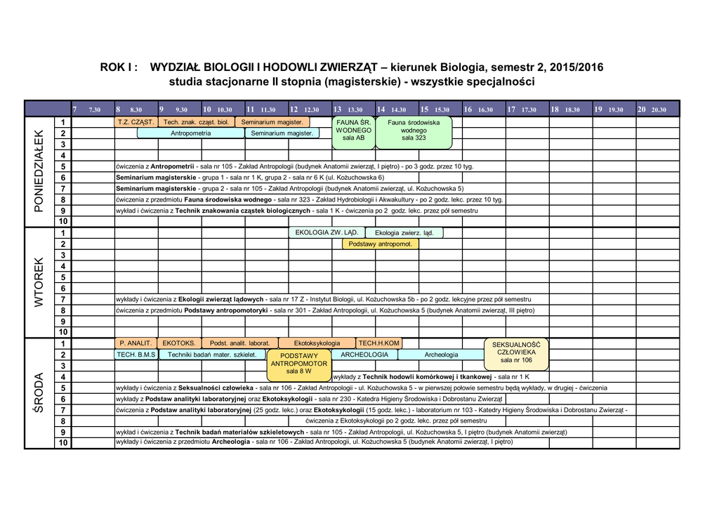 ROK I : ŚRODA WTOREK PONIEDZIAŁEK 7 1 2 3 4 5 6 7 8 9 10 1 2 3 4 5 6 7 8 9 10 1 2 3 4 5 6 7 8 9 10 7.30 8 WYDZIAŁ BIOLOGII I HODOWLI ZWIERZĄT – kierunek Biologia, semestr 2, 2015/2016 studia stacjonarne II stopnia (magisterskie) - wszystkie specjalności 8.30 T.Z. CZĄST. 9 9.30 10 10.30 Tech. znak. cząst. biol. Antropometria 11 11.30 12 12.30 Seminarium magister. Seminarium magister. 13 13.30 14 14.30 15 15.30 16 16.30 17 17.30 18 18.30 19 19.30 Fauna środowiska wodnego sala 323 FAUNA ŚR. WODNEGO sala AB ćwiczenia z Antropometrii - sala nr 105 - Zakład Antropologii (budynek Anatomii zwierząt, I piętro) - po 3 godz. przez 10 tyg. Seminarium magisterskie - grupa 1 - sala nr 1 K, grupa 2 - sala nr 6 K (ul. Kożuchowska 6) Seminarium magisterskie - grupa 2 - sala nr 105 - Zakład Antropologii (budynek Anatomii zwierząt, ul. Kożuchowska 5) ćwiczenia z przedmiotu Fauna środowiska wodnego - sala nr 323 - Zakład Hydrobiologii i Akwakultury - po 2 godz. lekc. przez 10 tyg. wykład i ćwiczenia z Technik znakowania cząstek biologicznych - sala 1 K - ćwiczenia po 2 godz. lekc. przez pół semestru EKOLOGIA ZW. LĄD. Ekologia zwierz. ląd. Podstawy antropomot. wykłady i ćwiczenia z Ekologii zwierząt lądowych - sala nr 17 Z - Instytut Biologii, ul. Kożuchowska 5b - po 2 godz. lekcyjne przez pół semestru ćwiczenia z przedmiotu Podstawy antropomotoryki - sala nr 301 - Zakład Antropologii, ul. Kożuchowska 5 (budynek Anatomii zwierząt, III piętro) P. ANALIT. TECH. B.M.S EKOTOKS. Podst. analit. laborat. Techniki badań mater. szkielet. Ekotoksykologia PODSTAWY ANTROPOMOTOR sala 8 W TECH.H.KOM ARCHEOLOGIA Archeologia SEKSUALNOŚĆ CZŁOWIEKA sala nr 106 wykłady z Technik hodowli komórkowej i tkankowej - sala nr 1 K wykłady i ćwiczenia z Seksualności człowieka - sala nr 106 - Zakład Antropologii - ul. Kożuchowska 5 - w pierwszej połowie semestru będą wykłady, w drugiej - ćwiczenia wykłady z Podstaw analityki laboratoryjnej oraz Ekotoksykologii - sala nr 230 - Katedra Higieny Środowiska i Dobrostanu Zwierząt ćwiczenia z Podstaw analityki laboratoryjnej (25 godz. lekc.) oraz Ekotoksykologii (15 godz. lekc.) - laboratorium nr 103 - Katedry Higieny Środowiska i Dobrostanu Zwierząt ćwiczenia z Ekotoksykologii po 2 godz. lekc. przez pół semestru wykład i ćwiczenia z Technik badań materiałów szkieletowych - sala nr 105 - Zakład Antropologii, ul. Kożuchowska 5, I piętro (budynek Anatomii zwierząt) wykłady i ćwiczenia z przedmiotu Archeologia - sala nr 106 - Zakład Antropologii, ul. Kożuchowska 5 (budynek Anatomii zwierząt, I piętro) 20 20.30 PIĄTEK CZWARTEK 7 1 2 3 4 5 6 7 8 9 10 1 2 3 4 5 6 7 8 9 10 7.30 8 8.30 9 9.30 10 10.30 11 11.30 12 12.30 13 13.30 Język obcy Tech. hod. kom. i tkank. ul. Norwida 25 (gmach główny) NAJNOW. OSIĄG. W GENETYCE OK. Najnow. osiąg. w genet. 14 14.30 15 16 15.30 ZAGOSP. MAŁ. ZBIOR. WODN. 16.30 17 17.30 18 18.30 19 19.30 Zagosp. małych zbiorn. wodnych ćwiczenia z Technik hodowli komórkowej i tkankowej - sala nr 6 K (po 2 godz. lekc. przez pół semestru) wykłady i ćwiczenia z przedmiotu Najnowsze osiągnięcia w genetyce - sala nr 377 - Zakład Hodowli Trzody Chlewnej wykłady i ćwiczenia z przedmiotu Zagospodarowanie małych zbiorników wodnych - sala nr 302 - Zakład Hodowli Bydła - po 2 godz. lekcyjne przez pół semestru GENET. CZŁOW. Genetyka człowieka wykłady (po 2 godz. lekc. przez pół semestru) z Genetyki człowieka - sala nr 14 O (Zakład Hodowli Owiec), ćwiczenia (5 razy po 3 godz. lekc.) - sala nr 10 w Katedrze Genetyki wykłady i ćwiczenia z Genetyki człowieka rozpoczną się 15 kwietnia 2016 r. Uwaga ! Grupy 1- specjalność: TECHNIKI LABORATORYJNE W BIOLOGII Grupa 2 - specjalność: BIOLOGIA CZŁOWIEKA UWAGA! Na zajęcia z Wychowania fizycznego (30 godz. lekc.) studenci zapisują się poprzez system internetowy Wszystkie przedmioty fakultatywne są wspólne dla I i II roku studiów magisterskich kierunku biologia! 20 20.30
