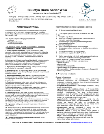 1 Biuletyn Biura Karier WSG Autoprezentacja i osobisty PR Pamiętaj - pracę dostają nie Ci, którzy najwięcej wiedzą o tej pracy, lecz Ci, którzy najwięcej wiedzą o tym, jak dostaje się pracę. (Dick Larthop) AUTOPREZENTACJA Autoprezentacja to świadome kierowanie wraŜeniem jakie wywieramy na innych, czyli próba pokazywanie się takim, jakim chcę, Ŝeby mnie inni widzieli i wszyscy to robimy chociaŜ raz na jakiś czas... Siła dąŜeń autoprezentacyjnych zaleŜy od: * Sytuacji * Wagi konsekwencji * Cech indywidualnych Jak zjednać sobie ludzi? - uniwersalne sposoby zwiększenia swojej atrakcyjności 1. Zadbaj o pierwsze wraŜenie - ludzie szybko tworzą sobie schematy i niechętnie je zmieniają. Pozytywny schemat twojej osoby kreujesz poprzez pierwszy kontakt: a) dobrze napisane, wyróŜniające się CV b) punktualność, uśmiech, stosowny ubiór, swoboda i elegancja ruchów, uścisk dłoni, dobre maniery przy pierwszej rozmowie 2. Wykorzystaj efekt pierwszeństwa i świeŜości - najlepiej zostanie zapamiętane to co powiedziałeś i zrobiłeś na początku i na końcu trzymaj więc formę i rzeczy najwaŜniejsze i najkorzystniej o tobie świadczące prezentuj na początku i na końcu spotkania. 3. Wykorzystaj efekt częstej ekspozycji -lubimy bardziej to co juŜ znamy. PokaŜ się pracodawcy wcześniej. 4. Wykorzystaj fakt, Ŝe lubimy tych, którzy są do nas podobni takŜe pod względem cech demograficznych ale przede wszystkim pod względem postaw i opinii. 5. Reguła komplementarności reakcji - nie prezentuj się jako biedactwo, którego inni juŜ wcześniej odrzucili, lecz jako osoba, która jest potencjalnie atrakcyjnym pracownikiem równieŜ dla innych pracodawców. . 6. Reguła komplementarności cech - lubimy ludzi, którzy swoim zachowaniem "wpasowują się" w nasz styl bycia, pozwól rozmówcy być takim jak lubi, właściwie go uzupełniaj. 7. Nikt nie jest jednakowo atrakcyjny dla wszystkich. Jesteśmy atrakcyjni dla innych, jeŜeli potrafimy zaspokoić ich potrzeby i rozwiązać ich problemy 8. Lubimy ludzi, którzy nas lubią , Wniosek: spróbuj polubić rekrutera i nigdy nie nastawiaj się negatywnie a zwiększysz szanse ze rekruter ciebie teŜ polubi. Zaś w osobach lubianych jesteśmy skłonni dostrzegać pozytywy i pomijać, pomniejszać wady. 9. Wykorzystaj efekt zysku - niech rekruter ma poczucie, Ŝe w miarę rozmowy coraz bardziej lubisz jego i tą firmę, którą on reprezentuje, nie zaczynaj od przesadnego entuzjazmu ani samochwalstwa. 10. Ingracjacja - zdobywanie sympatii innych przez mówienie im miłych rzeczy 11. Stosuj argumentację dwustronną i jednostronną - Jeśli widzisz lub wiesz, Ŝe rozmówca, którego chcesz do siebie przekonać, jest nastawiony do ciebie sceptycznie i ma duŜo wątpliwości albo wręcz negatywnie - zastosuj argumentacje dwustronną - uprzedź jego obawy i podaj argumenty od swych mocnych stron i nie przypominaj mu o swych słabościach. 12. Pamiętaj o normie dopasowania autoprezentacji - w tym równieŜ poziomu otwartości Techniki autoprezentacji w procesie selekcji A. W dokumentach aplikacyjnych: 1. Liczy się nie tylko CO o sobie piszesz ale teŜ JAK. W CV: a) porządek czy chaos b) kolejność informacji kojarzona jest z ich miejscem w hierarchii waŜności piszącego c) konsekwencja i spójność przedstawionej ścieŜki dotychczasowej kariery W liście motywacyjnym: a) Ilość czasowników vs ilość przymiotników b) forma czasowników (dokonane vs niedokonane: robiłem, zrobiłem) c) tryb przypuszczający vs oznajmujący d) częstotliwość uŜycia słów "ja ", "jestem 2. Wpływ stereotypów i ukrytych teorii osobowości na temat zawodów i studentów określonych kierunków Typowe wizerunki - stereotypy jakie uaktywniają się najczęściej w umyśle rekrutera przy ocenianiu: - człowiek aktywny - człowiek miły - profesjonalista/specjalista - człowiek niebanalny/ciekawy/niezaleŜny - człowiek rzetelny i cięŜko pracujący ale czasem "bez polotu" - niepowaŜny student B. W rozmowie - werbalnie: Zwracaj teŜ uwagę na: • dobór słownictwa – nie uŜywaj mowy potocznej; przećwicz odpowiedzi na najtrudniejsze pytania ze znajomym; wysłuchaj uwaŜnie uwag i spróbuj poćwiczyć swój sposób wypowiadania się, • precyzyjność wypowiedzi – nie odbiegaj od tematu, staraj skupić się na atutach, • wyczerpującą odpowiedź na pytania – to Ty znasz siebie najlepiej, wiesz o swoich osiągnięciach i mocnych stronach; rozmowa kwalifikacyjna nie jest przesłuchaniem; pracodawca zada Ci tylko kilka pytań, dlatego, jeśli jest taka moŜliwość, staraj się jak najpełniej zaprezentować swoją osobę, nie zanudzając przy tym rozmówcy, • wypowiadanie własnych opinii – staraj się nie wypowiadać swoich opinii, jeśli pracodawca Cię o to nie zapyta; nie dopuść do tego, by wywiązała się niekontrolowana dyskusja; pamiętaj, Ŝe nie kaŜdy musi mieć takie samo zdanie na dany temat, jak Ty, • odpowiadanie całymi zdaniami – staraj się nie odpowiadać krótkimi, zdawkowymi „tak” lub „nie”, • natęŜeniu głosu – staraj się mówić dosyć głośno i wyraźnie; spróbuj zmieniać intonację głosu i akcentować wypowiedzi, by nie były one nuŜące dla słuchacza, • miłym i opanowanym głosie – staraj się w miarę moŜliwości opanować zdenerwowanie; pamiętaj, Ŝe rozmawiasz tylko z człowiekiem. Biuro Karier WyŜszej Szkoły Gospodarki w Bydgoszczy, [email protected], www.biurokarier.wsg.byd.pl C. W rozmowie – niewerbalnie 1. Ubiór - mówi o tym co chcesz pokazać i czym się chwalić dopasowanie do okazji świadczy o: - wiedzy z zakresu obowiązujących norm i obyczajów, - o szacunku dla rozmówcy i dla tych konwencjonalnych norm - o gotowości wyrzeczenia się ekspresji siebie w imię interesu dopasowanie do stylu ubioru w firmie: - świadczy o twoim wyczuciu - tworzy złudzenie dopasowania osobowościowego waŜna jest umiejętność noszenia formalnego stro