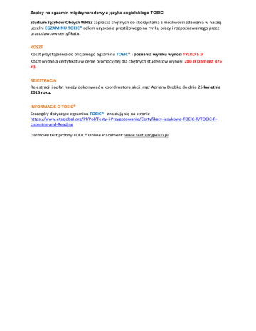 Zapisy na egzamin międzynarodowy z języka angielskiego TOEIC Studium Języków Obcych WHSZ zaprasza chętnych do skorzystania z możliwości zdawania w naszej uczelni EGZAMINU TOEIC® celem uzyskania prestiżowego na rynku pracy i rozpoznawalnego przez pracodawców certyfikatu. KOSZT Koszt przystąpienia do oficjalnego egzaminu TOEIC® i poznania wyniku wynosi TYLKO 5 zł Koszt wydania certyfikatu w cenie promocyjnej dla chętnych studentów wynosi 280 zł (zamiast 375 zł). REJESTRACJA Rejestracji i opłat należy dokonywać u koordynatora akcji mgr Adriany Drobko do dnia 25 kwietnia 2015 roku. INFORMACJE O TOEIC® Szczegóły dotyczące egzaminu TOEIC® znajdują się na stronie https://www.etsglobal.org/Pl/Pol/Testy-i-Przygotowanie/Certyfikaty-jezykowe-TOEIC-R/TOEIC-RListening-and-Reading Darmowy test próbny TOEIC® Online Placement: www.testujangielski.pl