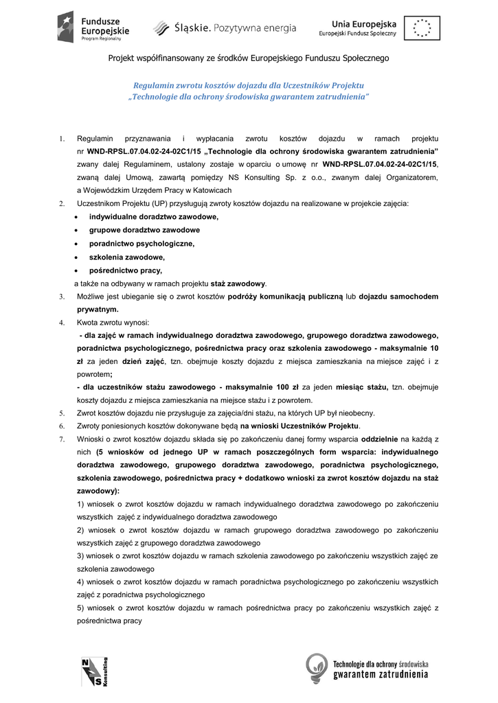Projekt współfinansowany ze środków Europejskiego Funduszu Społecznego Regulamin zwrotu kosztów dojazdu dla Uczestników Projektu „Technologie dla ochrony środowiska gwarantem zatrudnienia” 1. Regulamin przyznawania i wypłacania zwrotu kosztów dojazdu w ramach projektu nr WND-RPSL.07.04.02-24-02C1/15 „Technologie dla ochrony środowiska gwarantem zatrudnienia” zwany dalej Regulaminem, ustalony zostaje w oparciu o umowę nr WND-RPSL.07.04.02-24-02C1/15, zwaną dalej Umową, zawartą pomiędzy NS Konsulting Sp. z o.o., zwanym dalej Organizatorem, a Wojewódzkim Urzędem Pracy w Katowicach 2. Uczestnikom Projektu (UP) przysługują zwroty kosztów dojazdu na realizowane w projekcie zajęcia: indywidualne doradztwo zawodowe, grupowe doradztwo zawodowe poradnictwo psychologiczne, szkolenia zawodowe, pośrednictwo pracy, a także na odbywany w ramach projektu staż zawodowy. 3. Możliwe jest ubieganie się o zwrot kosztów podróży komunikacją publiczną lub dojazdu samochodem prywatnym. 4. Kwota zwrotu wynosi: - dla zajęć w ramach indywidualnego doradztwa zawodowego, grupowego doradztwa zawodowego, poradnictwa psychologicznego, pośrednictwa pracy oraz szkolenia zawodowego - maksymalnie 10 zł za jeden dzień zajęć, tzn. obejmuje koszty dojazdu z miejsca zamieszkania na miejsce zajęć i z powrotem; - dla uczestników stażu zawodowego - maksymalnie 100 zł za jeden miesiąc stażu, tzn. obejmuje koszty dojazdu z miejsca zamieszkania na miejsce stażu i z powrotem. 5. Zwrot kosztów dojazdu nie przysługuje za zajęcia/dni stażu, na których UP był nieobecny. 6. Zwroty poniesionych kosztów dokonywane będą na wnioski Uczestników Projektu. 7. Wnioski o zwrot kosztów dojazdu składa się po zakończeniu danej formy wsparcia oddzielnie na każdą z nich (5 wniosków od jednego UP w ramach poszczególnych form wsparcia: indywidualnego doradztwa zawodowego, grupowego doradztwa zawodowego, poradnictwa psychologicznego, szkolenia zawodowego, pośrednictwa pracy + dodatkowo wnioski za zwrot kosztów dojazdu na staż zawodowy): 1) wniosek o zwrot kosztów dojazdu w ramach indywidualnego doradztwa zawodowego po zakończeniu wszystkich zajęć z indywidualnego doradztwa zawodowego 2) wniosek o zwrot kosztów dojazdu w ramach grupowego doradztwa zawodowego po zakończeniu wszystkich zajęć z grupowego doradztwa zawodowego 3) wniosek o zwrot kosztów dojazdu w ramach szkolenia zawodowego po zakończeniu wszystkich zajęć ze szkolenia zawodowego 4) wniosek o zwrot kosztów dojazdu w ramach poradnictwa psychologicznego po zakończeniu wszystkich zajęć z poradnictwa psychologicznego 5) wniosek o zwrot kosztów dojazdu w ramach pośrednictwa pracy po zakończeniu wszystkich zajęć z pośrednictwa pracy Projekt współfinansowany ze środków Europejskiego Funduszu Społecznego Dodatkowo - wnioski o zwrot kosztów dojazdu na staż zawodowy składa się za każdy zakończony miesiąc stażu. 8. Formularze wniosków są dostępne w Biurze Projektu, ul. Cieszyńska 365, 43-382 Bielsko Biała, na stronie internetowej projektu http://www.projektynsk.pl/technologie-dla-ochrony-srodowiska/ oraz będą rozdawane uczestnikom podczas zajęć. 9. Wnioski składać należy osobiście bądź listownie do Biura Projektu po zakończeniu zajęć, do 10 dnia miesiąca następującego po miesiącu, w którym zakończyły się dane forma wsparcia. Istnieje możliwość jednokrotnego uzupełnienia ewentualnych braków w wymaganych dokumentach. Wnioski składane po terminie lub niekompletne nie będą brane pod uwagę. 10. Zwrot kosztów będzie przelewany na podany we wniosku numer rachunku bankowego po weryfikacji (koszt przejazdu, obecność UP) i zatwierdzeniu przesłanego wniosku. Koszty podróży komunikacją publiczną UP przysługuje zwrot w wysokości iloczynu ilości obecności na zajęciach i udokumentowanego kosztu przejazdu najtańszym środkiem komunikacji publicznej na danej trasie, jednak nie więcej niż 10 zł/dzień zajęć lub 100 zł/miesiąc stażu (rozliczane proporcjonalnie do liczby dni obecności na stażu). Wymagane dokumenty: 1) podpisane oświadczenie o akceptacji regulaminu zwrotu kosztów dojazdu (do pierwszego wniosku); 2) poprawnie wypełniony wniosek UP o zwrot kosztów dojazdu komunikacją publiczną; 3) udokumentowanie wysokości kosztów przejazdu w postaci np: biletów komunikacji publicznej (bilety kolejowe II klasy, bilety PKS, bilety komunikacji miejskiej i podmiejskiej) lub zaświadczenie przewoźnika wykonującego usługi w zakresie komunikacji publicznej o cenie najtańszego biletu na danej trasie; w przypadku stażu do wyliczeń w pierwszej kolejności rozpatrywana będzie koszt biletu okresowego – w związku z czym zaleca się zakup biletu okresowego (do pierwszego wniosku); Bilety służące weryfikacji kosztu muszą być niezniszczone i czytelne. Koszty podróży samochodem prywatnym UP przysługuje zwrot w wysokości iloczynu ilości obecności na zajęciach i udokumentowanego kosztu przejazdu najtańszym środkiem komunikacji publicznej na danej trasie, jednak nie więcej niż 10 zł/dzień zajęć lub 100 zł/miesiąc stażu (rozliczane proporcjonalnie do liczby dni obecności na stażu). . Wymagane dokumenty: 1) podpisane oświadczenie o akceptacji regulaminu zwrotu kosztów dojazdu (do pierwszego wniosku); 2) poprawnie wypełniony wniosek UP o zwrot kosztów dojazdu samochodem prywatnym; 3) kserokopia prawa jazdy oraz kserokopia dowodu rejestracyjnego pojazdu (poświadczone własnym podpisem za zgodność z oryginałem); 4) umowa użyczenia do korzystania z z dowodem rejestracyjnym nie jest UP). samochodu osobowego (jeśli właścicielem zgodnie Projekt współfinansowany ze środków Europejskiego Funduszu Społecznego 5) udokumentowanie wysokości kosztów przejazdu w postaci np: biletów komunikacji publicznej (bilety kolejowe II klasy, bilety PKS, bilety komunikacji miejskiej i podmiejskiej - jednorazowych) lub zaświadczenie przewoźnika 