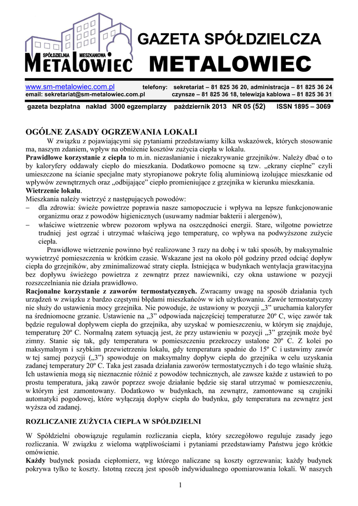 GAZETA SPÓŁDZIELCZA METALOWIEC www.sm-metalowiec.com.pl telefony: sekretariat – 81 825 36 20, administracja – 81 825 36 24 email: [email protected] czynsze – 81 825 36 18, telewizja kablowa – 81 825 36 31 gazeta bezpłatna nakład 3000 egzemplarzy październik 2013 NR 05 (52) ISSN 1895 – 3069 OGÓLNE ZASADY OGRZEWANIA LOKALI W związku z pojawiającymi się pytaniami przedstawiamy kilka wskazówek, których stosowanie ma, naszym zdaniem, wpływ na obniżenie kosztów zużycia ciepła w lokalu. Prawidłowe korzystanie z ciepła to m.in. niezasłanianie i niezakrywanie grzejników. Należy dbać o to by kaloryfery oddawały ciepło do mieszkania. Dodatkowo pomocne są tzw. „ekrany cieplne” czyli umieszczone na ścianie specjalne maty styropianowe pokryte folią aluminiową izolujące mieszkanie od wpływów zewnętrznych oraz „odbijające” ciepło promieniujące z grzejnika w kierunku mieszkania. Wietrzenie lokalu. Mieszkania należy wietrzyć z następujących powodów: − dla zdrowia: świeże powietrze poprawia nasze samopoczucie i wpływa na lepsze funkcjonowanie organizmu oraz z powodów higienicznych (usuwamy nadmiar bakterii i alergenów), − właściwe wietrzenie wbrew pozorom wpływa na oszczędności energii. Stare, wilgotne powietrze trudniej jest ogrzać i utrzymać właściwą jego temperaturę, co wpływa na podwyższone zużycie ciepła. Prawidłowe wietrzenie powinno być realizowane 3 razy na dobę i w taki sposób, by maksymalnie wywietrzyć pomieszczenia w krótkim czasie. Wskazane jest na około pół godziny przed odciąć dopływ ciepła do grzejników, aby zminimalizować straty ciepła. Istniejąca w budynkach wentylacja grawitacyjna bez dopływu świeżego powietrza z zewnątrz przez nawiewniki, czy okna ustawione w pozycji rozszczelniania nie działa prawidłowo. Racjonalne korzystanie z zaworów termostatycznych. Zwracamy uwagę na sposób działania tych urządzeń w związku z bardzo częstymi błędami mieszkańców w ich użytkowaniu. Zawór termostatyczny nie służy do ustawienia mocy grzejnika. Nie powoduje, że ustawiony w pozycji „3” uruchamia kaloryfer na średniomocne grzanie. Ustawienie na „3” odpowiada najczęściej temperaturze 20º C, więc zawór tak będzie regulował dopływem ciepła do grzejnika, aby uzyskać w pomieszczeniu, w którym się znajduje, temperaturę 20º C. Normalną zatem sytuacją jest, że przy ustawieniu w pozycji „3” grzejnik może być zimny. Stanie się tak, gdy temperatura w pomieszczeniu przekroczy ustalone 20º C. Z kolei po maksymalnym i szybkim przewietrzeniu lokalu, gdy temperatura spadnie do 15º C i ustawimy zawór w tej samej pozycji („3”) spowoduje on maksymalny dopływ ciepła do grzejnika w celu uzyskania zadanej temperatury 20º C. Taka jest zasada działania zaworów termostatycznych i do tego właśnie służą. Ich ustawienia mogą się nieznacznie różnić z powodów technicznych, ale zawsze każde z ustawień to po prostu temperatura, jaką zawór poprzez swoje działanie będzie się starał utrzymać w pomieszczeniu, w którym jest zamontowany. Dodatkowo w budynkach, na zewnątrz, zamontowane są czujniki automatyki pogodowej, które wyłączają dopływ ciepła do budynku, gdy temperatura na zewnątrz jest wyższa od zadanej. ROZLICZANIE ZUŻYCIA CIEPŁA W SPÓŁDZIELNI W Spółdzielni obowiązuje regulamin rozliczania ciepła, który szczegółowo reguluje zasady jego rozliczania. W związku z wieloma wątpliwościami i pytaniami przedstawiamy Państwu jego krótkie omówienie. Każdy budynek posiada ciepłomierz, wg którego naliczane są koszty ogrzewania; każdy budynek pokrywa tylko te koszty. Istotną rzeczą jest sposób indywidualnego opomiarowania lokali. W naszych 1 zasobach istnieją dwie możliwości opomiarowania i rozliczania poszczególnych budynków: budynki, w których lokale są opomiarowane podzielnikami kosztów c.o. i budynki, w których takiego opomiarowania nie ma. Aby budynek został opomiarowany, stosowny wniosek musi złożyć więcej niż 50% jego mieszkańców . W budynku, w którym większość lokatorów zdecydowała się na opomiarowanie ta część lokali, których użytkownicy nie zgodzili się na montaż podzielników kosztów c.o jest rozliczana wg tzw. „ryczałtu” – ich koszty ustalone będą wg kosztów średniego zużycia ciepła przypadającego na ten lokal powiększonego wskaźnikiem 1,7. Bywa tak, że koszty c.o. w lokalach opomiarowanych oraz w lokalach z ustalonymi podwyższonymi kosztami wg ryczałtu przewyższają koszty podobnych lokali w budynkach nieopomiarowanych. Przyczyną większych opłat niektórych lokali w budynkach opomiarowanych, gdzie każdy płaci za swoje zużycie ciepła jest fakt większego indywidualnego zużycia ciepła. W budynku nieopomiarowanym takie podwyższone zużycie rozkładane jest na wszystkich mieszkańców. Upraszczając – lokale z dużym zużyciem ciepła i te co zużywają go mało płacą za ciepło wg średnich kosztów. Można powiedzieć, że mieszkańcy, którzy zużywają mało ciepła składają się na ciepło dla tych, którzy potrzebują go więcej. Przypominamy, że najpóźniej do grudnia 2016 roku zużycie ciepła we wszystkich lokalach w budynkach wielorodzinnych wg dyrektywy unijnej ma być opomiarowane, a polskie prawo energetyczne dostosowane do prawa obowiązującego w Unii Europejskiej. Do ustalenia pozostaje jedynie sposób opomiarowania ciepła w mieszkaniach. Nie promujemy żadnej z metod opomiarowania, a jedynie wyjaśniamy istotę opomiarowania budynków podzielnikami kosztów c.o. Rzeczą oczywistą jest, że mieszkańcy którzy zużywają więcej ciepła będą twierdzić, że podzielniki są złe i nieprawidłowo funkcjonują. W budynkach z podzielnikami zużycie ciepła jest od 20% do 30% mniejsze niż w budynkach bez podzielników. Indywidualnie, po wprowadzeniu podzielników na budynku około 20% mieszkańców może płacić więcej niż przed opom