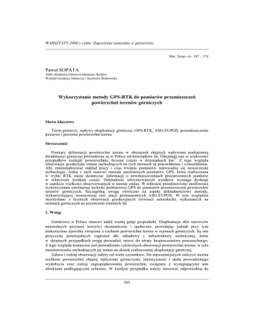 WARSZTATY 2008 z cyklu: Zagrożenia naturalne w górnictwie Mat. Symp. str. 365 – 374 Paweł SOPATA AGH Akademia Górniczo-Hutnicza, Kraków Wydział Geodezji Górniczej i Inżynierii Środowiska Wykorzystanie metody GPS-RTK do pomiarów przemieszczeń powierzchni terenów górniczych Słowa kluczowe Teren górniczy, wpływy eksploatacji górniczej, GPS-RTK, ASG-EUPOS, przemieszczenie pionowe i poziome powierzchni terenu Streszczenie Pomiary deformacji powierzchni terenu w obszarach objętych wpływami podziemnej działalności górniczej prowadzone są w Polsce od dziesiątków lat. Obejmują one w większości przypadków rozległe powierzchnie, liczone często w dziesiątkach km2. Z tego względu obserwacje geodezyjne zmian zachodzących na tych terenach są pracochłonne i czasochłonne. Aby zminimalizować nakład pracy i czas trwania pomiarów wprowadza się nowoczesne technologie. Jedną z nich stanowi metoda satelitarnych pomiarów GPS, która realizowana w trybie RTK może dostarczać informacji o przemieszczeniach przestrzennych punktów w relatywnie krótkim czasie. Dokładność otrzymywanych wyników wymaga dyskusji w aspekcie wielkości obserwowanych w terenie zmian. W referacie przedstawiono możliwości wykorzystania satelitarnej techniki pomiarowej GPS do pomiarów przemieszczeń powierzchni terenów górniczych. Szczególną uwagę zwrócono na aspekt dokładnościowy metody, wykorzystującej nowoczesną sieć stacji permanentnych ASG-EUPOS. W tym względzie skorzystano z licznych obserwacji geodezyjnych (również autorskich), wykonanych na terenach górniczych na przestrzeni ostatnich lat. 1. Wstęp Górnictwo w Polsce stanowi nadal ważną gałąź gospodarki. Eksploatacja złóż surowców mineralnych przynosi korzyści ekonomiczne i społeczne, powodując jednak przy tym niekorzystne zjawiska związane z ruchami powierzchni terenu w rejonach górniczych. Są one przyczyną potencjalnych zagrożeń dla zabudowy i infrastruktury technicznej, które w skrajnych przypadkach mogą prowadzić nawet do utraty bezpieczeństwa powszechnego. Z tego względu konieczne jest prowadzenie cyklicznych obserwacji powierzchni terenu, w celu monitorowania zachodzących jej zmian na skutek realizowanej eksploatacji górniczej. Zakres i rodzaj obserwacji zależy od wielu czynników. Do najważniejszych zaliczyć można wielkość powierzchni objętej wpływami górniczymi, intensywność i skalę prowadzonego wydobycia oraz rodzaj zagospodarowania powierzchni, związany z występującymi tam obiektami podlegającymi ochronie. W każdym przypadku należy stosować odpowiednią do 365 P.SOPATA – Wykorzystanie metody GPS-RTK do pomiarów przemieszczeń … potrzeb metodykę obserwacji, dobraną optymalnie pod względem ekonomicznym z równoczesnym zapewnieniem spodziewanej jakości i dokładności wyników. W tym względzie można postawić wniosek, że obecny rozwój techniki, w aspekcie monitorowania wpływów górniczych, nadąża za potrzebami. Obserwowany w ostatnich latach rozwój metod satelitarnych, wykorzystujących globalny system pozycjonowania GPS, umożliwia prowadzenie pomiarów geodezyjnych, z których praktycznie na bieżąco uzyskiwać można przestrzenne pozycje obserwowanych punktów. Okresowe pomiary tego rodzaju umożliwiają wyznaczenie przemieszczeń punktów przestrzennej sieci obserwacyjnej (Sopata, Stoch 2011), służące w dalszej kolejności ocenie ewentualnych zagrożeń dla obiektów zlokalizowanych w rejonach eksploatacji górniczej. W artykule przedstawiono dwa przykłady zastosowania metody pomiarów GPS-RTK, prowadzonych w nawiązaniu do nowoczesnej sieci stałych stacji permanentnych ASG-EUPOS, wykorzystanych do monitorowania wpływów podziemnej eksploatacji górniczej złóż węgla kamiennego. W każdym przypadku zastosowano indywidualne, adekwatne do potrzeb, podejście do zagadnienia monitoringu zmian powierzchni terenu, co skutkowało nieco odmienną specyfiką zastosowanej metodyki pozyskiwania danych. Na koniec przeprowadzono krótką dyskusję na temat możliwości wykorzystania metody GPS-RTK, odnosząc się do klasycznych metod pomiarowych, które mogłyby być zastosowane w prezentowanych przypadkach. 2. Specyfika rejonów i zakres obserwacji Pierwszy rejon (Rejon I) obejmował tereny górnicze Górnego Śląska, w których co najmniej od 5 lat nie realizowano bieżącej eksploatacji złoża węgla kamiennego. Obejmował on swym zasięgiem ponad 4-ro kilometrowy pas inwestycji drogowej, która przebiegając nad zrealizowanym w kilku pokładach wydobyciem węgla wymagała monitorowania ewentualnych ruchów powierzchni terenu z tytułu reaktywacji zrobów na skutek realizowanych prac budowlanych (Śliwa 2010). Ze względu na rodzaj monitorowanej inwestycji w zakresie obserwacji uwzględniono zarówno poziome jak i pionowe przemieszczenia powierzchni terenu. W tym celu dane obserwacyjne pozyskiwane były na sieci trwale stabilizowanych punktów ziemnych. Sieć tę stanowiła grupa ponad 240 punktów, rozmieszczonych wzdłuż realizowanej budowy drogi, po obu jej stronach. W czasie obserwacji wykorzystano dwie metody pomiarowe. Jedną z nich była klasyczna, precyzyjna niwelacja geometryczna, stanowiąca bazę porównawczą dla zrealizowanych pomiarów wysokościowych drugą metodą (GPS-RTK), podlegającą wówczas ocenie. Pomiary wysokościowe, realizowane w klasyczny sposób, poprzedzono kontrolą stałości odpowiednio dobranych punktów nawiązania, wymaganą szczególnie na terenach górniczych. Wyniki tej kontroli zostały uwzględnione w przeprowadzonych analizach pozyskanych wyników obserwacji. W artykule omówiono dwie serie obserwacyjne, obejmujące pięciomiesięczny przedział czasowy. W każdej serii prowadzono równolegle pomiary klasyczne i satelitarne. Pomiary wysokościowe wykonywano w dwóch różnych układach odniesienia, odpowiednio Kronsztadt 86 i elipsoida WGS-84. Jednak ze względu na różnicowy charakter otrzymywan