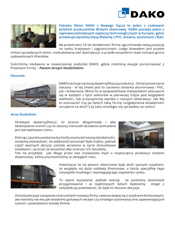 Fabryka Okien DAKO z Nowego Sącza to jeden z czołowych polskich producentów stolarki otworowej. DAKO posiada jedno z najnowocześniejszych zapleczy technologicznych w Europie, gdzie produkuje wysokiej klasy stolarkę z PVC, drewna, aluminium i stali. Na przestrzeni 15 lat działalności firma ugruntowała swoją pozycję na rynku krajowym i zagranicznym, czego dowodem jest prawie milion sprzedanych okien, rozbudowana sieć dystrybucji, a przede wszystkim stale rosnące grono zadowolonych Klientów. Gościliśmy niedawno w nowoczesnej siedzibie DAKO, gdzie mieliśmy okazje porozmawiać z Prezesem Firmy – Panem Jerzym Studzińskim. Oknonet: DAKO cechuje się dużą dywersyfikacją produkcji. Od lat poszerzacie obszary - w tej chwili jest to zarówno stolarka aluminiowa i PVC, jak i drewniana. Mimo to w województwie małopolskim plasujecie się w każdym z tych sektorów w pierwszej trójce pod względem wielkości, tak przynajmniej wynika z naszych obserwacji. Jak Wy to oceniacie? Czy po latach taką formę rozgałęzienia działalności uznajecie za atut? Czy taka strategia się sprawdza na rynku? Jerzy Studziński: Strategia dywersyfikacji, to proces długotrwały i aby obiektywnie ocenić czy to słuszny kierunek działania potrzebna jest perspektywa czasu. Patrząc z punktu widzenia tych kilkunastu lat naszej działalności, możemy powiedzieć, że większość posunięć była trafna, jednak część ważnych decyzji została wcielona w życie stosunkowo niedawno i jeszcze za wcześnie aby oceniać ich rezultaty. Tak na przykład, jak długo przez nas rozważana myśl o rozpoczęciu produkcji stolarki drewnianej, którą uruchomiliśmy w ubiegłym roku. Inwestycja ta na pewno obarczona była dość sporym ryzykiem, ze względu na duże nakłady finansowe, a także specyfikę tego niezwykle trudnego i wymagającego segmentu rynku. To spore wyzwanie, jednak wierzę , że jesteśmy doskonale przygotowanie i w najbliższych latach będziemy mogli z satysfakcją powiedzieć, że była to słuszna decyzja. Zresztą decyzje związane z kierunkiem rozwoju firmy zawsze wiążą się z ryzykiem biznesowym, ale niestety nie ma jak wiadomo gotowych recept czy strategii automatycznie zapewniających sukces i powodzenie każdej firmie. Oknonet: Takie poszerzanie gałęzi działalności firmy, to także spore inwestycje w park maszynowy, technologie, szkolenia pracowników. Jak to wygląda u Was? Z jakich maszyn, technologii korzystacie? Bazujecie na czyichś doświadczeniach czy może staracie się być prekursorami w pewnych dziedzinach? Jerzy Studziński: Produkcja tak szerokiego asortymentu jaki posiadamy w swojej ofercie wymaga różnego rodzaju specjalistycznego parku maszynowego, do tego odpowiedniej, wyspecjalizowanej w danym kierunku kadry. Jesteśmy jednak dobrze przygotowani. W ubiegłym roku przenieśliśmy się do nowej siedziby, gdzie na 13 000m2 nowoczesnych hal produkcyjnych posiadamy najnowszej generacji, specjalistyczny park maszynowy do produkcji stolarki z PVC, drewna, aluminium i stali, a także własną nowoczesną malarnię proszkową oraz okleiniarkę profili PVC i aluminiowych. Dzięki temu jesteśmy w stanie trafić do szerokiej grupy Klientów i obsłużyć ich kompleksowo. Nasza specjalistyczna kadra to bardzo dobrze wykwalifikowani fachowcy z poszczególnych dziedzin produkcyjnych, znający się na najnowszych technologiach i centrach obróbczych. Tak więc jesteśmy technologicznie i fachowo przygotowani, by sprostać wymaganiom rynku. Jeżeli chodzi o park maszynowy decyzję o wyborze producenta podjęliśmy po gruntownym przeanalizowaniu i dokładnym sprawdzeniu wielu ofert najlepszych producentów na rynku światowym. Zależało nam aby dokonać dobrego wyboru. Wybraliśmy firmę ITA, która współpracuje z wieloma czołowymi producentami maszyn, posiada relatywnie dobre rozwiązania, a także - co ważne - specjalistyczne, wyczerpujące informacje na temat oferowanych produktów i technologii. Z pewnością wkrótce będziemy mogli ocenić czy był to trafny wybór. Niestety inwestycje w sprzęt i nowe technologie to nie jest proces jednorazowy. Aby iść do przodu trzeba się liczyć z kolejnymi nakładami w przyszłości. Oknonet: Niedawno jako pierwsi wprowadziliście system podwójnego uchyłu w oknie. Co więcej można powiedzieć na temat tego rozwiązania i jakich jeszcze nowości Wasi klienci mogą się spodziewać? Jerzy Studziński: Nieustannie pracujemy nad wzbogacaniem naszej oferty, staramy się cyklicznie wprowadzać nowatorskie rozwiązania, które uatrakcyjnią nasze produkty. Jedną z takich ciekawostek jest właśnie mechanizm dwustopniowego uchyłu z funkcją antyzatrzaskową, o którym Pan wspomniał. Póki co DAKO jest pierwszą i jedyną firmą, która ma dostęp do tego systemu. Ponieważ jesteśmy długoletnim i jednym z największych odbiorców uznanej na rynku firmy WINKHAUS, otrzymaliśmy wyłączność na stosowanie tego właśnie nowoczesnego i praktycznego rozwiązania w naszych oknach. Poza tym warto wymienić inny element, który również posiadamy na wyłączność, a jest to atrakcyjna okleina w kolorze TABASCO, którą Klienci mogą kupić tylko w DAKO. To kolejna korzyść wyróżniająca okna DAKO na rynku. Jeżeli chodzi o stolarkę drewnianą muszę tu wspomnieć o ciekawej nowości, którą niedawno wprowadziliśmy do naszej oferty. Jest to drewno z okładziną aluminiową – nowy innowacyjny produkt, który z pewnością znajdzie wielu entuzjastów, ponieważ połączenie drewna z aluminium pozwala jednocześnie na zachowanie przytulnego i estetycznego charakteru wnętrza, jaki stwarzają okna drewniane oraz nowoczesnego wyglądu budynku na zewnątrz, który nadaje aluminium. Ponadto w standardzie do wszystkich okien drewnianych stosujemy bardzo dobrej klasy okapnik marki Guttman. Walorem tego produktu jest brak trwałego łączenia z ramą okna, co zapobiega niszczeniu powierzchni drewna przez wodę. Aby sprostać 