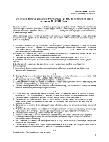 Załącznik Nr 6b - do SIWZ Część II przedmiotu zamówienia Umowa na dostawę granulatu drewnianego - pelletu do kotłowni na sezon grzewczy 2016/2017 (wzór) Zawarta w dniu ……………….. w Bielawie pomiędzy Zespołem Szkół i Placówek Kształcenia Zawodowego w Bielawie zwanym w dalszej części umowy Zamawiającym, w imieniu którego działa Ireneusz Rutowicz – Dyrektor Zespołu, a ……………….. zwanym w dalszej części umowy Dostawcą, w imieniu którego działa …………………………... Strony zawierają umowę w ramach zamówienia publicznego przeprowadzonego w trybie przetargu nieograniczonego zgodnie z art. 39 ustawy z dnia 29.01.2004 r. Prawo zamówień publicznych (Dz. U. z 2015 r. poz.2164). §1 1. Dostawca zobowiązuje się dostarczyć Zamawiającemu granulat drewniany – pellet w sezonie grzewczym 2016/2017 zgodnie ze Specyfikacją Istotnych Warunków Zamówienia. Przedmiot zamówienia jest zgodny z ofertą Dostawcy z dnia ........................... 2016 r., która stanowi załącznik do umowy jako jej integralna część. 2.Dostawca zobowiązuje się dostarczyć Zamawiającemu przedmiot umowy w terminach określonych w ofercie, po telefonicznej informacji od Zamawiającego. 3. Zamawiający wymaga dostawę towaru od poniedziałku do piątku w godz. od 7:30 do 14:00. 4. Dostawca zobowiązuje się realizować dostawy towaru własnym transportem na koszt i ryzyko własne. 5. Dostawca zobowiązuje się do rozładunku towaru i ułożenia go zgodnie ze wskazaniem Zamawiającego. 6. Łączna ilość dostarczonego pelletu uzależniona jest od faktycznych potrzeb wynikających z warunków klimatycznych. §2 1. Strony ustaliły cenę jednostkową granulatu drewnianego – pelletu w kwocie:………….. netto + Vat (słownie: ………………. netto + Vat ) za 1 [t] dostarczonego opału, 2. W cenę granulatu wliczone są koszty transportu i rozładunku. 3. Cena jednostkowa netto nie będzie zwiększana w okresie obowiązywania umowy i została przyjęta zgodnie z ofertą Dostawcy, o której mowa w § 1 ust. 1. 4. Zapłata nastąpi przelewem na rachunek bankowy Dostawcy, po dostarczeniu faktury za każdą dostawę z terminem płatności podanym w ofercie. §3 1. Odbiór ilościowy i jakościowy każdej dostawy towaru odbywał się będzie w miejscu dostawy określonym przez Zamawiającego, poprzez potwierdzenie przez upoważnionego pracownika Zamawiającego na dowodzie dostawy odbioru, każdej dostarczonej partii towaru. 2. Zamawiający zobowiązany jest, przy przyjęciu każdej dostawy towaru, do sprawdzenia czy dostarczone ilości są prawidłowe oraz czy nie wykazują wad możliwych do wykrycia już podczas przyjęcia. 3. Zamawiający w terminie 5 dni roboczych licząc od dnia dostawy ma prawo reklamować przedmiot dostawy. 4. W przypadku stwierdzenia wad ilościowych lub jakościowych towarów Zamawiający zobowiązuje się opisać wady w protokole i przesłać go niezwłocznie wraz z zawiadomieniem Dostawcy. 5. Na rozpatrzenie reklamacji Dostawca ma 5 dni roboczych. 6. Dostawca zobowiązuje się do załatwienia uzasadnionej reklamacji Zamawiającego poprzez wymianę wadliwych jakościowo towarów lub dostarczenie brakujących towarów, w terminie 7 dni od daty uznania reklamacji. 7. Nie udzielenie odpowiedzi na złożoną reklamację w ciągu 5 dni roboczych od dnia jej otrzymania przyjmuje się za uznanie. 8. Zasady określone w ust. 2 i 4 mają również zastosowanie w przypadku wad ukrytych niemożliwych do ujawnienia przez Zamawiającego podczas przyjmowania dostaw. §4 Dostawca płaci Zamawiającemu kary umowne: 1 1) za zwłokę w dostarczeniu zamówionej dostawy towaru w wysokości 0,5% ceny brutto określonej w § 2 ust. 1 za każdy dzień zwłoki; 2) za zwłokę w wymianie towaru na wolny od wad w wysokości 0,5% ceny brutto określonej w § 2 ust. 1 za każdy dzień zwłoki. §5 1. W przypadku niewykonania lub nienależytego wykonania umowy Zamawiający ma prawo wg własnego uznania: 1) odstąpić od umowy; 2) dokonać zakupu na koszt Dostawcy opału o tych samych parametrach lub opału zastępczego. 2. Dostawca zobowiązuje się zapłacić karę umowną w wysokości 20% szacunkowej wartości całości zamówienia, gdy odstąpi od umowy z powodu okoliczności, za które odpowiada Dostawca. 3. Dostawcy nie przysługują wobec Zamawiającego roszczenia odszkodowawcze z tytułu zamówienia mniejszej ilości towaru, niż określonej w załączniku do umowy. 4. Ceny i nazwy na fakturach muszą odpowiadać cenom i nazwom zamieszczonym w załączniku do umowy. 5. Za datę spełnienia świadczenia Strony przyjmują datę obciążenia rachunku bankowego Zamawiającego. 6. Zamawiający zapłaci Dostawcy odsetki ustawowe z tytułu opóźnienia w zapłacie należności objętych otrzymanymi fakturami. 7. Dostawca może odstąpić od umowy, jeżeli Zamawiający nie dokonuje zapłaty za faktury Dostawcy w okresie dłuższym niż 90 dni licząc od terminu zapłaty ustalonego w § 2 ust. 4. 8. Odstąpienie od umowy powinno nastąpić w formie pisemnej z podaniem uzasadnienia. §6 Umowa zostaje zawarta na okres od 15.09.2016 r. do 30.04.2017 r. §7 1. W sprawach nieuregulowanych w umowie stosuje się przepisy ustawy - Prawa zamówień publicznych i Kodeksu Cywilnego. 2. Wszelkie spory, których Stronom nie udało się rozstrzygnąć polubownie, będą poddane rozstrzygnięciu przez sąd powszechny właściwy dla siedziby Zamawiającego. 3. Strony ustalają, że wszystkie zmiany postanowień umowy wymagają dla swej ważności formy pisemnej, w postaci aneksu. 4. Zakazuje się istotnych zmian postanowień zawartej umowy w stosunku do treści wybranej oferty za wyjątkiem zmian przewidzianych przez Zamawiającego i na określonych przez niego warunkach. 5. Prawa i obowiązki wynikające z umowy nie mogą być przenoszone na osoby trzecie bez pisemnej zgody jej Stron. §8 Umowę sporządzono w dwóch jednobrzmiących egzemplarzach, po jednym dla każdej ze St
