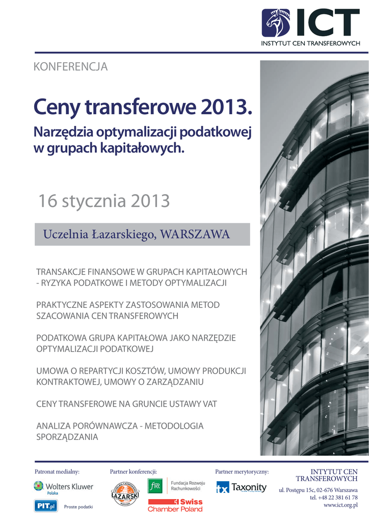 KONFERENCJA Ceny transferowe 2013. Narzędzia optymalizacji podatkowej w grupach kapitałowych. 16 stycznia 2013 Uczelnia Łazarskiego, WARSZAWA TRANSAKCJE FINANSOWE W GRUPACH KAPITAŁOWYCH - RYZYKA PODATKOWE I METODY OPTYMALIZACJI PRAKTYCZNE ASPEKTY ZASTOSOWANIA METOD SZACOWANIA CEN TRANSFEROWYCH PODATKOWA GRUPA KAPITAŁOWA JAKO NARZĘDZIE OPTYMALIZACJI PODATKOWEJ UMOWA O REPARTYCJI KOSZTÓW, UMOWY PRODUKCJI KONTRAKTOWEJ, UMOWY O ZARZĄDZANIU CENY TRANSFEROWE NA GRUNCIE USTAWY VAT ANALIZA PORÓWNAWCZA - METODOLOGIA SPORZĄDZANIA Patronat medialny: Partner konferencji: Partner merytoryczny: INTYTUT CEN TRANSFEROWYCH ul. Postępu 15c, 02-676 Warszawa tel. +48 22 381 61 78 www.ict.org.pl Ceny transferowe 2013. Narzędzia optymalizacji podatkowej w grupach kapitałowych PROGRAM KONFERENCJI 9:00 Rejestracja, poranna kawa i powitanie uczestników 9:30 Wprowadzenie do tematyki cen transferowych. (Jarosław F. Mika) Warunki uczestnictwa • Omówienie zbioru przepisów polskich i OECD; • Obowiązki sprawozdawcze w zakresie transfer pricingu; • Omówienie przepisów cen transferowych w wybranych krajach. 10:30 Formuły optymalizacji podatkowej dla grup kapitałowych. (Jarosław F. Mika) 1. Koszt uczestnictwa: 980zł (przy dokonaniu zgłoszenia do dnia 7.01.2013r.) / 1280zł (przy dokonaniu zgłoszenia po 7.01.2013r.), (podane ceny są cenami netto, które należy powiększyć o 23% VAT). • Spółka komandytowa i komandytowo-akcyjna; • Podatkowe grupy kapitałowe; • Specjalne strefy ekonomiczne. SPECJALNIE DLA CZŁONKÓW SWISS CHAMBER do 19 grudnia 720zł + 23% VAT 11:00 Przerwa kawowa 11:15 Metody szacowania cen transferowych na podstawie praktycznych przykładów. (Jarosław F. Mika) • Omówienie zasad stosowania poszczególnych metod szacunku; • Metody szacowania z podziałem na rodzaje transakcji. 12:00 Transakcje finansowe – ryzyka podatkowe i formuły optymalizacji podatkowej. (Jarosław F. Mika) • • • • • • • Pożyczki wewnątrzgrupowe; Cash pooling; Gwarancje/poręczenia bankowe; Niedostateczna kapitalizacja; Pożyczki obligacyjne; Pożyczki fasadowe; Kontrakty forward. 12:45 Lunch 13:45 Transakcje niematerialne - ryzyka podatkowe i formuły optymalizacji podatkowej. (Jarosław F. Mika) • • • • • Opłaty licencyjne; Umowy o repartycji kosztów (ang. Cost Contribution Arrangements); Umowy produkcji kontraktowej (ang. Contract Manufacturing); Transakcje wsparcia w zakresie IT; Refakturowanie. 14:15 Ceny transferowe na gruncie ustawy VAT. (dr Adam Bartosiewicz) • • • • Ograniczenia w dysponowaniu lub używaniu towaru na gruncie art. 32 uVAT; Związki pomiędzy kontrahentami; Sposoby ustalenia ceny transakcyjnej; Zasady ustalania podstawy opodatkowania. 2. Cena obejmuje: materiały szkoleniowe, lunch, przerwy kawowe. 3. Po otrzymaniu zgłoszenia wystawiana jest Fa Proforma z terminem płatności 14 dni, ale nie później niż 1 dzień przed rozpoczęciem konferencji. 4. W przypadku rezygnacji nie później niż 14 dni przed rozpoczęciem Konferencji pobierana jest opłata administracyjna w wysokości 50% opłaty za udział. W przypadku rezygnacji w terminie późniejszym niż 14 dni przed rozpoczęciem Konferencji pobierane jest 100% opłaty za udział. Rezygnację należy przesłać listem poleconym na adres organizatora. 15:15 Przerwa kawowa Zgłoszenia: 15:30 Analiza porównawcza. (Marcin Pęski) • Metodologia sporządzenia „benchmark study”; • Sposoby przygotowywania analizy porównawczej. 16:15 Wybrane orzecznictwo sądów administracyjnych w zakresie cen transferowych. (dr Andrzej Melezini) 17:15 Sesja pytań 17:30 Zakończenie konferencji Patronat medialny: Partner konferencji: Partner merytoryczny: [email protected] lub [email protected] tel. (+48 22) 381 6178 fax (+48 22) 381 6001 INTYTUT CEN TRANSFEROWYCH ul. Postępu 15c, 02-676 Warszawa tel. +48 22 381 61 78 www.ict.org.pl Ceny transferowe 2013. Narzędzia optymalizacji podatkowej w grupach kapitałowych PRELEGENCI dr Adam Bartosiewicz Członek Rady Programowej ICT Doktor nauk prawnych, specjalizujący się w problematyce prawa podatkowego (polskiego oraz unijnego) oraz prawa karnego skarbowego. Członek zarządu i wspólnik EOL Kancelaria Doradztwa Podatkowego sp. z o.o. sp.k. Autor lub współautor wielu publikacji, w tym m.in. Komentarza VAT (WoltersKluwer 2011) oraz Komentarza KKS (C.H.Beck 2010). Członek Państwowej Komisji d.s. Doradztwa Podatkowego obecnej kadencji. Wykładowca akademicki. Jarosław F. Mika Doradca podatkowy, Członek Rady Programowej ICT Jarek posiada kilkunastoletnie doświadczenie z zakresu prawa podatkowego. Najpierw jako członek zarządów spółek kapitałowych polskich oraz z udziałem kapitału zagranicznego a następnie jako doradca podatkowy (numer wpisu 10 625). Doświadczenie z zakresu podatków zdobywał m.in. w KPMG, CC&M. Autor kilkudziesięciu publikacji dotyczących problematyki prawa podatkowego (Gazeta Prawna, Rzeczpospolita, Przegląd Podatkowy, Monitor Podatkowy) oraz książki: "Ceny transferowe. Dokumentacje podatkowe. Odpowiedzialność karna skarbowa", która ukazała się nakładem wydawnictwa C.H. Beck oraz książki: „Podatkowe aspekty działalności w specjalnych strefach ekonomicznych”, Unimex, 2012. Doktorant w Kolegium Gospodarki Światowej Szkoły Głównej Handlowej w tematyce powiązań pomiędzy transakcjami dokonywanymi przez podmioty powiązane w grupach kapitałowych a wynikami finansowymi spółek notowanych na Giełdzie Papierów Wartościowych w Warszawie. Wykładowca akademicki prawa podatkowego oraz zarządzania finansami przedsiębiorstw. dr Andrzej Melezini Członek Rady Programowej ICT Doktor nauk prawnych, wykładowca akademicki, trener, specjalizujący się w problematyce procedur kontrolnych organów skarbowych. Członek Stowarzyszenia Centrum Informacji i Organizacji Badań Finansów Publicznych i Prawa Podatkowego Krajów Europy Środkowej i Wschodniej, stały współpracownik Wydawnictwa Wolter