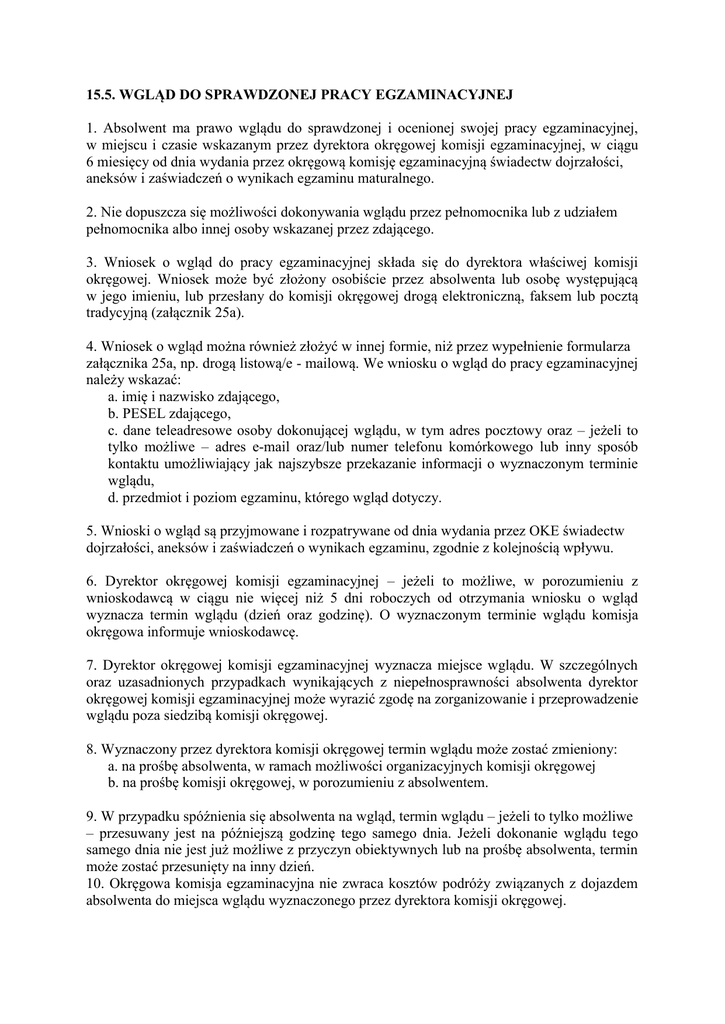 15.5. WGLĄD DO SPRAWDZONEJ PRACY EGZAMINACYJNEJ 1. Absolwent ma prawo wglądu do sprawdzonej i ocenionej swojej pracy egzaminacyjnej, w miejscu i czasie wskazanym przez dyrektora okręgowej komisji egzaminacyjnej, w ciągu 6 miesięcy od dnia wydania przez okręgową komisję egzaminacyjną świadectw dojrzałości, aneksów i zaświadczeń o wynikach egzaminu maturalnego. 2. Nie dopuszcza się możliwości dokonywania wglądu przez pełnomocnika lub z udziałem pełnomocnika albo innej osoby wskazanej przez zdającego. 3. Wniosek o wgląd do pracy egzaminacyjnej składa się do dyrektora właściwej komisji okręgowej. Wniosek może być złożony osobiście przez absolwenta lub osobę występującą w jego imieniu, lub przesłany do komisji okręgowej drogą elektroniczną, faksem lub pocztą tradycyjną (załącznik 25a). 4. Wniosek o wgląd można również złożyć w innej formie, niż przez wypełnienie formularza załącznika 25a, np. drogą listową/e - mailową. We wniosku o wgląd do pracy egzaminacyjnej należy wskazać: a. imię i nazwisko zdającego, b. PESEL zdającego, c. dane teleadresowe osoby dokonującej wglądu, w tym adres pocztowy oraz – jeżeli to tylko możliwe – adres e-mail oraz/lub numer telefonu komórkowego lub inny sposób kontaktu umożliwiający jak najszybsze przekazanie informacji o wyznaczonym terminie wglądu, d. przedmiot i poziom egzaminu, którego wgląd dotyczy. 5. Wnioski o wgląd są przyjmowane i rozpatrywane od dnia wydania przez OKE świadectw dojrzałości, aneksów i zaświadczeń o wynikach egzaminu, zgodnie z kolejnością wpływu. 6. Dyrektor okręgowej komisji egzaminacyjnej – jeżeli to możliwe, w porozumieniu z wnioskodawcą w ciągu nie więcej niż 5 dni roboczych od otrzymania wniosku o wgląd wyznacza termin wglądu (dzień oraz godzinę). O wyznaczonym terminie wglądu komisja okręgowa informuje wnioskodawcę. 7. Dyrektor okręgowej komisji egzaminacyjnej wyznacza miejsce wglądu. W szczególnych oraz uzasadnionych przypadkach wynikających z niepełnosprawności absolwenta dyrektor okręgowej komisji egzaminacyjnej może wyrazić zgodę na zorganizowanie i przeprowadzenie wglądu poza siedzibą komisji okręgowej. 8. Wyznaczony przez dyrektora komisji okręgowej termin wglądu może zostać zmieniony: a. na prośbę absolwenta, w ramach możliwości organizacyjnych komisji okręgowej b. na prośbę komisji okręgowej, w porozumieniu z absolwentem. 9. W przypadku spóźnienia się absolwenta na wgląd, termin wglądu – jeżeli to tylko możliwe – przesuwany jest na późniejszą godzinę tego samego dnia. Jeżeli dokonanie wglądu tego samego dnia nie jest już możliwe z przyczyn obiektywnych lub na prośbę absolwenta, termin może zostać przesunięty na inny dzień. 10. Okręgowa komisja egzaminacyjna nie zwraca kosztów podróży związanych z dojazdem absolwenta do miejsca wglądu wyznaczonego przez dyrektora komisji okręgowej. 11. Zasady wglądu. a. Potwierdzenie uprawnienia do dokonania wglądu. Na wgląd należy zgłosić się z dokumentem potwierdzającym tożsamość. b. Forma udostępniania prac do wglądu. Absolwentowi udostępnia się pracę egzaminacyjną w formie, w jakiej została przez niego przekazana i oceniona przez egzaminatora. Przed udostępnieniem pracy do wglądu zabezpiecza się dane osobowe egzaminatora przed nieuprawnionym ujawnieniem. c. Czas trwania wglądu. Czas wglądu do jednej pracy egzaminacyjnej wyznaczony przez dyrektora komisji okręgowej nie może być krótszy niż 30 minut. Na prośbę osoby uprawnionej do wglądu, po upływie czasu wyznaczonego przez dyrektora komisji okręgowej, czas wglądu może zostać wydłużony w takim zakresie, w jakim jest to możliwe, po uwzględnieniu liczby wglądów wyznaczonych na dany dzień. d. Osoby obecne podczas wglądu. Podczas wglądu obecny jest pracownik komisji okręgowej. Przed rozpoczęciem wglądu pracownik komisji okręgowej informuje absolwenta o tym, czy jest wstanie udzielić odpowiedzi na pytania merytoryczne dotyczące rozwiązań / zadań / liczby punktów przyznanych przez egzaminatora lub czy istnieje możliwość rozmowy z ekspertem przedmiotowym. e. Zasady oceniania rozwiązań zadań. Podczas dokonywania wglądu absolwentów i zapewnia się możliwość zapoznania się z zasadami oceniania rozwiązań zadań, o których mowa w art. 9a ust. 2 pkt 2 ustawy. f. Przebieg wglądu. Po sprawdzeniu danych osobowych absolwenta, osoba przeprowadzająca wgląd: upewnia się, czy absolwent zapoznał się z procedurami wglądu, przekazuje absolwentowi informacje, o których mowa w pkt. 15.5.11d. g. Po zakończonym wglądzie pracownik komisji okręgowej odnotowuje realizację wglądu, a absolwent potwierdza to własnoręcznym podpisem. h. Zakaz wykonywania kserokopii pracy egzaminacyjnej. Praca egzaminacyjna nie może być kopiowana. Możliwe jest natomiast wykonywanie zdjęć pracy egzaminacyjnej, w całości lub w części. i. Korzystanie z urządzeń telekomunikacyjnych. Podczas wglądu dozwolone jest korzystanie z aparatu fotograficznego, który jest integralną częścią urządzenia telekomunikacyjnego, np. telefonu komórkowego. j. Sporządzanie notatek przez osobę dokonującą wglądu. Osoba dokonująca wglądu ma prawo sporządzania notatek podczas wglądu, korzystając z materiałów przekazanych przez okręgową komisję egzaminacyjną. Osobom dokonującym wglądu należy zapewnić kartki formatu A4 oraz długopisy (w kolorze określonym przez komisję okręgową). Osoby dokonujące wglądu nie mogą robić notatek, korzystając z własnych materiałów i przyborów do pisania. k. Zgłaszanie zastrzeżeń dotyczących sprawdzenia pracy. Jeżeli podczas wglądu absolwent zgłasza zastrzeżenia dotyczące sprawdzenia pracy, w tym liczby punktów przyznanych przez egzaminatora, w pierwszej kolejności komisja okręgowa powinna dążyć do wyjaśnienia wątpliwości podczas wglądu. 12. Absolwent może zwrócić się z wnios