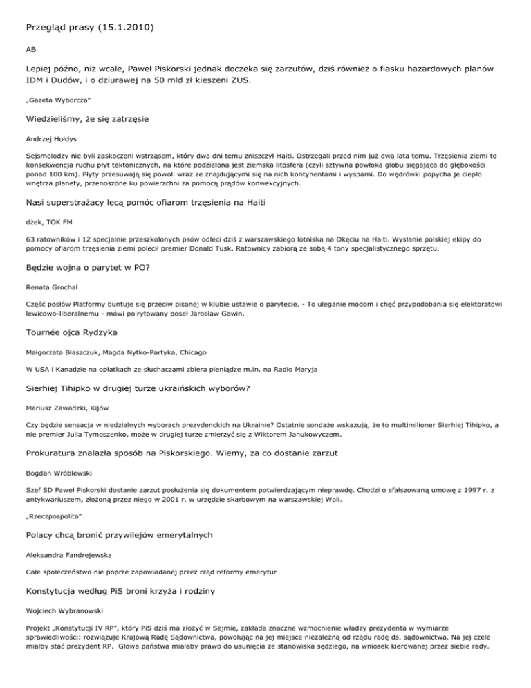 Przegląd prasy (15.1.2010) AB Lepiej późno, niż wcale, Paweł Piskorski jednak doczeka się zarzutów, dziś również o fiasku hazardowych planów IDM i Dudów, i o dziurawej na 50 mld zł kieszeni ZUS. „Gazeta Wyborcza” Wiedzieliśmy, że się zatrzęsie Andrzej Hołdys Sejsmolodzy nie byli zaskoczeni wstrząsem, który dwa dni temu zniszczył Haiti. Ostrzegali przed nim już dwa lata temu. Trzęsienia ziemi to konsekwencja ruchu płyt tektonicznych, na które podzielona jest ziemska litosfera (czyli sztywna powłoka globu sięgająca do głębokości ponad 100 km). Płyty przesuwają się powoli wraz ze znajdującymi się na nich kontynentami i wyspami. Do wędrówki popycha je ciepło wnętrza planety, przenoszone ku powierzchni za pomocą prądów konwekcyjnych. Nasi superstrażacy lecą pomóc ofiarom trzęsienia na Haiti dżek, TOK FM 63 ratowników i 12 specjalnie przeszkolonych psów odleci dziś z warszawskiego lotniska na Okęciu na Haiti. Wysłanie polskiej ekipy do pomocy ofiarom trzęsienia ziemi polecił premier Donald Tusk. Ratownicy zabiorą ze sobą 4 tony specjalistycznego sprzętu. Będzie wojna o parytet w PO? Renata Grochal Część posłów Platformy buntuje się przeciw pisanej w klubie ustawie o parytecie. - To uleganie modom i chęć przypodobania się elektoratowi lewicowo-liberalnemu - mówi poirytowany poseł Jarosław Gowin. Tournée ojca Rydzyka Małgorzata Błaszczuk, Magda Nytko-Partyka, Chicago W USA i Kanadzie na opłatkach ze słuchaczami zbiera pieniądze m.in. na Radio Maryja Sierhiej Tihipko w drugiej turze ukraińskich wyborów? Mariusz Zawadzki, Kijów Czy będzie sensacja w niedzielnych wyborach prezydenckich na Ukrainie? Ostatnie sondaże wskazują, że to multimilioner Sierhiej Tihipko, a nie premier Julia Tymoszenko, może w drugiej turze zmierzyć się z Wiktorem Janukowyczem. Prokuratura znalazła sposób na Piskorskiego. Wiemy, za co dostanie zarzut Bogdan Wróblewski Szef SD Paweł Piskorski dostanie zarzut posłużenia się dokumentem potwierdzającym nieprawdę. Chodzi o sfałszowaną umowę z 1997 r. z antykwariuszem, złożoną przez niego w 2001 r. w urzędzie skarbowym na warszawskiej Woli. „Rzeczpospolita” Polacy chcą bronić przywilejów emerytalnych Aleksandra Fandrejewska Całe społeczeństwo nie poprze zapowiadanej przez rząd reformy emerytur Konstytucja według PiS broni krzyża i rodziny Wojciech Wybranowski Projekt „Konstytucji IV RP”, który PiS dziś ma złożyć w Sejmie, zakłada znaczne wzmocnienie władzy prezydenta w wymiarze sprawiedliwości: rozwiązuje Krajową Radę Sądownictwa, powołując na jej miejsce niezależną od rządu radę ds. sądownictwa. Na jej czele miałby stać prezydent RP. Głowa państwa miałaby prawo do usunięcia ze stanowiska sędziego, na wniosek kierowanej przez siebie rady. Wieś trwa dzięki dopłatom Magdalena Kozmana Realne ceny skupu produktów rolnych w ostatnich pięciu latach spadły o 5,6 proc. W tym czasie środki produkcji mocno drożały. Bez unijnych dopłat do ziemi polskie rolnictwo nie byłoby opłacalne. Politycy PO gromią Lecha Kaczyńskiego Jarosław Stróżyk Platforma nie musi wystawiać Tuska, by wygrać wybory prezydenckie. „Dziennik Gazeta Prawna” Cimoszewicz: Za kilka miesięcy będą wojny "Zaczną się wojny. A to z Krzyżakami, a to z Rosjanami" - powiedział Włodzimierz Cimoszewicz prognozując przebieg wyborów w 2010 roku i tłumacząc, dlaczego w nich nie wystartuje. Wyznał, że woli puszczę, gdzie robi zdjęcia. "Odkładam je do specjalnego foldera. Kiedyś je wydam". Wpadka policji? Wystawili bandytom kantor Policja użyła mojego klienta jako żywą przynętę - twierdzi adwokat właściciela kantoru napadniętego w zeszły czwartek w Opolu. Mężczyzna w obronie zastrzelił bandytę. Teraz okazuje się, że policja ostrzegała właściciela o napadzie. Co więcej, czekała na miejscu wcześniej. Senyszyn zagalopowała się u Olejnik Joanna Senyszyn znana jest z kontrowersyjnych wypowiedzi. Ale tym razem chyba przesadziła. Oceniając Trybunał Konstytucyjny, który bada zgodność ustawy dezubekizacyjnej z konstytucją, nazwała go "trybunałem prostytucyjnym". Na te słowa gwałtownie zareagowała Monika Olejnik. Szokujące dane o liczbie ofiar wstrząsów Dwa miliony dzieci ucierpiało w potężnym trzęsieniu ziemi na Haiti - alarmuje brytyjska organizacja Save the Children. Osierocone maluchy muszą spać na ulicach, wśród ciał ofiar, wszystkie będą miały uraz psychiczny do końca życia. Czerwony Krzyż przedstawił też szacunki liczby zabitych. ZUS-owi brakuje 50 mld zł W tym roku dotacja do Funduszu Ubezpieczeń Społecznych będzie rekordowa – 37,9 mld zł. ZUS wykorzysta wszystkie pieniądze z Funduszu Rezerwy Demograficznej. Poprawę kondycji FUS spowoduje wydłużenie wieku emerytalnego. „Puls Biznesu” Dudowie przegrali na automatach Dawid Tokarz Wraz z IDMSA chcieli zarobić na debiucie Victorii na GPW. Rząd pozbawił ich złudzeń. Rewolucja hazardowa przekreśliła upublicznienie jednego z największych operatorów automatów w kraju. „Gazeta Giełdy Parkiet” Sektor bankowy zapłaci za państwową pomoc Bloomberg , Grzegorz Siemionczyk , reuters Waszyngton zamierza w ciągu dziesięciu lat zebrać od 50 największych instytucji finansowych 90 mld USD. Branża ostrzega, że zahamuje to jej rekonwalescencję SkyEurope mógł ukryć pieniądze we Włoszech Bartłomiej Mayer Prokuratura z Wiednia sprawdza, czy włoska firma My Sky nie ma części pieniędzy linii SkyEurope 15 stycznia 2010 10:05