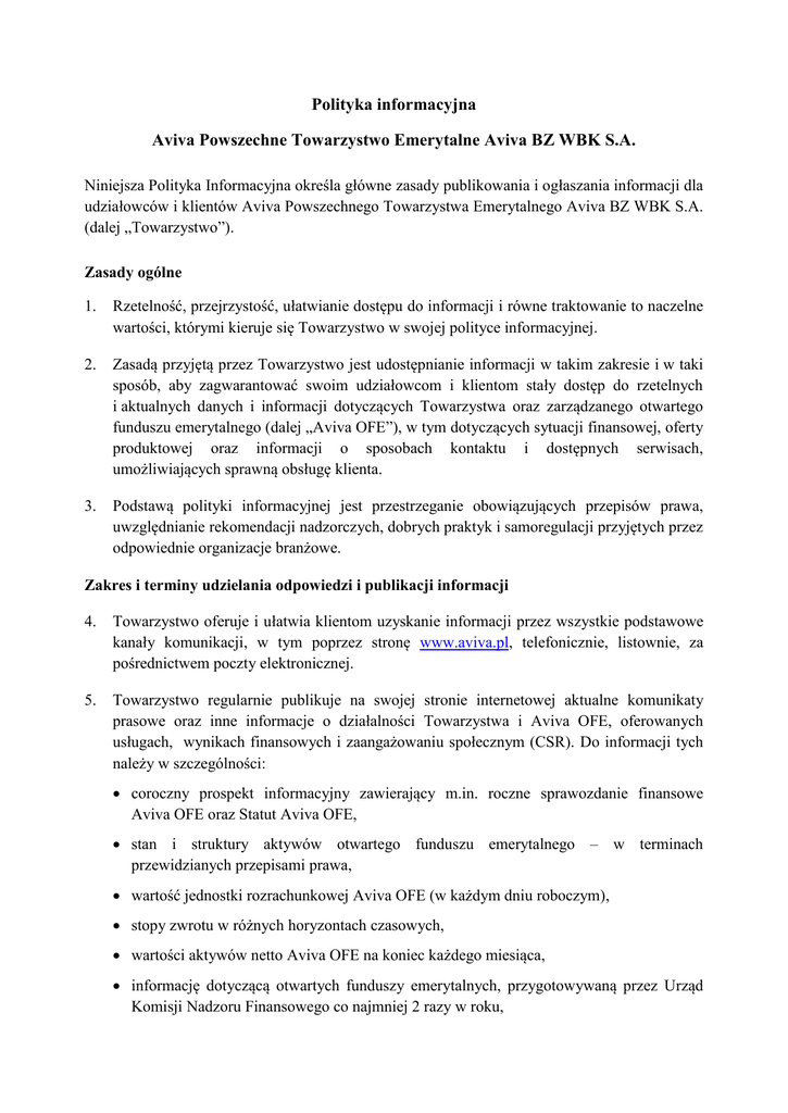 Polityka informacyjna Aviva Powszechne Towarzystwo Emerytalne Aviva BZ WBK S.A. Niniejsza Polityka Informacyjna określa główne zasady publikowania i ogłaszania informacji dla udziałowców i klientów Aviva Powszechnego Towarzystwa Emerytalnego Aviva BZ WBK S.A. (dalej „Towarzystwo”). Zasady ogólne 1. Rzetelność, przejrzystość, ułatwianie dostępu do informacji i równe traktowanie to naczelne wartości, którymi kieruje się Towarzystwo w swojej polityce informacyjnej. 2. Zasadą przyjętą przez Towarzystwo jest udostępnianie informacji w takim zakresie i w taki sposób, aby zagwarantować swoim udziałowcom i klientom stały dostęp do rzetelnych i aktualnych danych i informacji dotyczących Towarzystwa oraz zarządzanego otwartego funduszu emerytalnego (dalej „Aviva OFE”), w tym dotyczących sytuacji finansowej, oferty produktowej oraz informacji o sposobach kontaktu i dostępnych serwisach, umożliwiających sprawną obsługę klienta. 3. Podstawą polityki informacyjnej jest przestrzeganie obowiązujących przepisów prawa, uwzględnianie rekomendacji nadzorczych, dobrych praktyk i samoregulacji przyjętych przez odpowiednie organizacje branżowe. Zakres i terminy udzielania odpowiedzi i publikacji informacji 4. Towarzystwo oferuje i ułatwia klientom uzyskanie informacji przez wszystkie podstawowe kanały komunikacji, w tym poprzez stronę www.aviva.pl, telefonicznie, listownie, za pośrednictwem poczty elektronicznej. 5. Towarzystwo regularnie publikuje na swojej stronie internetowej aktualne komunikaty prasowe oraz inne informacje o działalności Towarzystwa i Aviva OFE, oferowanych usługach, wynikach finansowych i zaangażowaniu społecznym (CSR). Do informacji tych należy w szczególności: coroczny prospekt informacyjny zawierający m.in. roczne sprawozdanie finansowe Aviva OFE oraz Statut Aviva OFE, stan i struktury aktywów otwartego funduszu emerytalnego – w terminach przewidzianych przepisami prawa, wartość jednostki rozrachunkowej Aviva OFE (w każdym dniu roboczym), stopy zwrotu w różnych horyzontach czasowych, wartości aktywów netto Aviva OFE na koniec każdego miesiąca, informację dotyczącą otwartych funduszy emerytalnych, przygotowywaną przez Urząd Komisji Nadzoru Finansowego co najmniej 2 razy w roku, sprawozdania z uczestnictwa w walnych zgromadzeniach akcjonariuszy, w których w danym roku uczestniczył Aviva OFE, formularze, druki i procedury służące obsłudze klienta. 6. Towarzystwo wypełnia szczególne obowiązki informacyjne wobec członków otwartych funduszy emerytalnych, organu nadzoru oraz wyznaczonej agencji informacyjnej, wynikające z przepisów obowiązującego prawa. 7. W swoje polityce informacyjnej Towarzystwo promuje elektroniczne kanały komunikacji, jako narzędzia umożliwiające sprawniejsze udzielenie odpowiedzi lub przekazanie klientom niezbędnych im informacji. 8. W relacjach z mediami Towarzystwo kieruje się zasadami rzetelności, jawności i przejrzystości, doceniając ważną rolę odgrywaną przez media w społeczeństwie. Towarzystwo zapewnia stały kontakt z mediami poprzez upoważnione do tego osoby, tj. rzecznika prasowego lub przedstawicieli agencji public relations, działających na zlecenie Towarzystwa. Dodatkowe regulacje 9. Towarzystwo uwzględnia w swojej polityce informacyjnej także zasady dotyczące ujawniania informacji, w szczególności mogące mieć wpływ na cenę notowanych papierów wartościowych, obowiązujące Aviva plc (spółka dominująca w stosunku do Towarzystwa) z uwagi na posiadanie przez nią status spółki publicznej, której akcje są notowane na giełdach w Londynie i Nowym Jorku. 10. Niezależnie od zasad niniejszej Polityki, zarówno Towarzystwo jaki i podmioty wykonujące czynności na jego zlecenie oraz ich pracownicy są zobowiązani do przestrzegania tajemnicy zawodowej zgodnie z wymogami art. 49 Ustawy o organizacji i funkcjonowaniu funduszy emerytalnych, regulacji dotyczących ochrony danych osobowych oraz wszelkich innych ograniczeń wynikających z przepisów prawa. 11. Towarzystwo wdrożyło i monitoruje zasady ochrony informacji prywatnych i zachowania tajemnicy zawodowej oraz stosuje metody weryfikacji osób wnioskujących o przekazanie informacji dotyczących indywidualnej umowy o członkostwo w otwartym funduszu emerytalnym, zawartych w rejestrze członków funduszu - tak, aby informacje te nie zostały przekazane osobie trzeciej, nie mającej do tego tytułu.