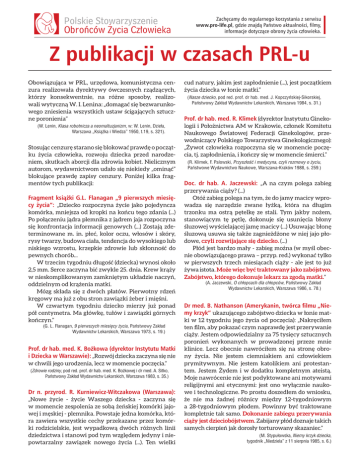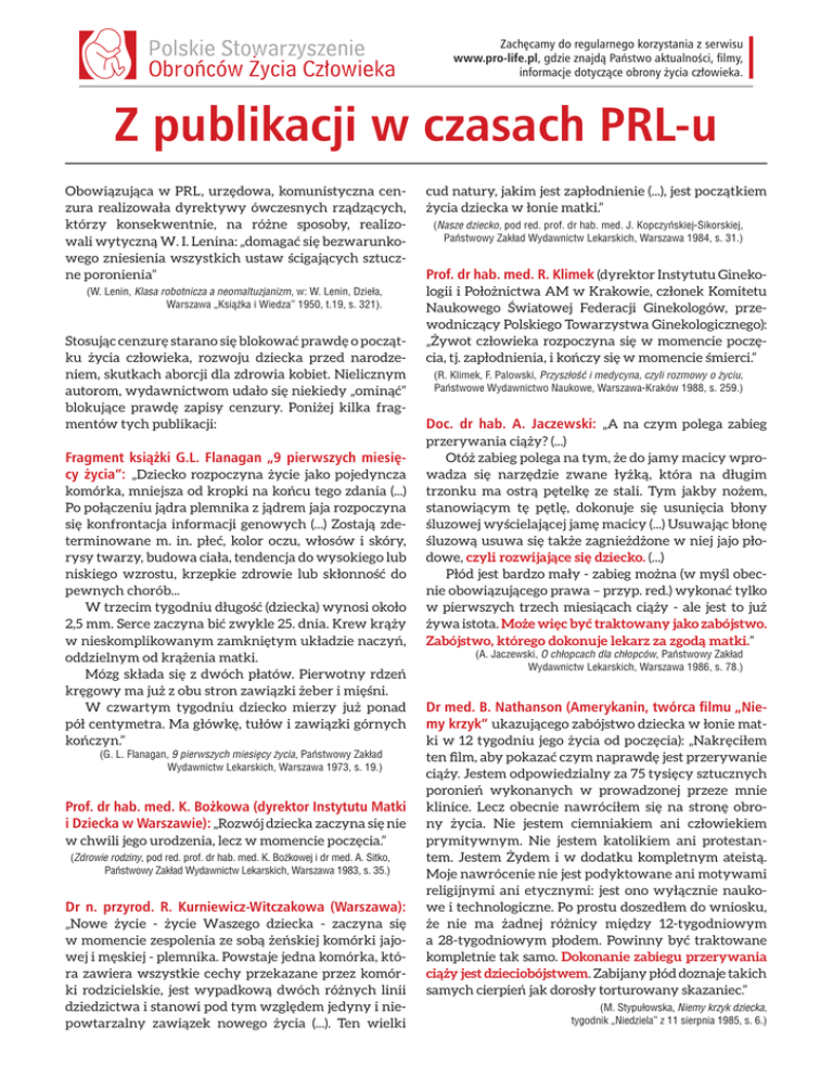 Zachęcamy do regularnego korzystania z serwisu www.pro-life.pl, gdzie znajdą Państwo aktualności, filmy, informacje dotyczące obrony życia człowieka. Z publikacji w czasach PRL-u Obowiązująca w PRL, urzędowa, komunistyczna cenzura realizowała dyrektywy ówczesnych rządzących, którzy konsekwentnie, na różne sposoby, realizowali wytyczną W. I. Lenina: „domagać się bezwarunkowego zniesienia wszystkich ustaw ścigających sztuczne poronienia” (W. Lenin, Klasa robotnicza a neomaltuzjanizm, w: W. Lenin, Dzieła, Warszawa „Książka i Wiedza” 1950, t.19, s. 321). Stosując cenzurę starano się blokować prawdę o początku życia człowieka, rozwoju dziecka przed narodzeniem, skutkach aborcji dla zdrowia kobiet. Nielicznym autorom, wydawnictwom udało się niekiedy „ominąć” blokujące prawdę zapisy cenzury. Poniżej kilka fragmentów tych publikacji: Fragment książki G.L. Flanagan „9 pierwszych miesięcy życia”: „Dziecko rozpoczyna życie jako pojedyncza komórka, mniejsza od kropki na końcu tego zdania (...) Po połączeniu jądra plemnika z jądrem jaja rozpoczyna się konfrontacja informacji genowych (...) Zostają zdeterminowane m. in. płeć, kolor oczu, włosów i skóry, rysy twarzy, budowa ciała, tendencja do wysokiego lub niskiego wzrostu, krzepkie zdrowie lub skłonność do pewnych chorób... W trzecim tygodniu długość (dziecka) wynosi około 2,5 mm. Serce zaczyna bić zwykle 25. dnia. Krew krąży w nieskomplikowanym zamkniętym układzie naczyń, oddzielnym od krążenia matki. Mózg składa się z dwóch płatów. Pierwotny rdzeń kręgowy ma już z obu stron zawiązki żeber i mięśni. W czwartym tygodniu dziecko mierzy już ponad pół centymetra. Ma główkę, tułów i zawiązki górnych kończyn.” (G. L. Flanagan, 9 pierwszych miesięcy życia, Państwowy Zakład Wydawnictw Lekarskich, Warszawa 1973, s. 19.) Prof. dr hab. med. K. Bożkowa (dyrektor Instytutu Matki i Dziecka w Warszawie): „Rozwój dziecka zaczyna się nie w chwili jego urodzenia, lecz w momencie poczęcia.” (Zdrowie rodziny, pod red. prof. dr hab. med. K. Bożkowej i dr med. A. Sitko, Państwowy Zakład Wydawnictw Lekarskich, Warszawa 1983, s. 35.) Dr n. przyrod. R. Kurniewicz-Witczakowa (Warszawa): „Nowe życie - życie Waszego dziecka - zaczyna się w momencie zespolenia ze sobą żeńskiej komórki jajowej i męskiej - plemnika. Powstaje jedna komórka, która zawiera wszystkie cechy przekazane przez komórki rodzicielskie, jest wypadkową dwóch różnych linii dziedzictwa i stanowi pod tym względem jedyny i niepowtarzalny zawiązek nowego życia (...). Ten wielki cud natury, jakim jest zapłodnienie (...), jest początkiem życia dziecka w łonie matki.” (Nasze dziecko, pod red. prof. dr hab. med. J. Kopczyńskiej-Sikorskiej, Państwowy Zakład Wydawnictw Lekarskich, Warszawa 1984, s. 31.) Prof. dr hab. med. R. Klimek (dyrektor Instytutu Ginekologii i Położnictwa AM w Krakowie, członek Komitetu Naukowego Światowej Federacji Ginekologów, przewodniczący Polskiego Towarzystwa Ginekologicznego): „Żywot człowieka rozpoczyna się w momencie poczęcia, tj. zapłodnienia, i kończy się w momencie śmierci.” (R. Klimek, F. Palowski, Przyszłość i medycyna, czyli rozmowy o życiu, Państwowe Wydawnictwo Naukowe, Warszawa-Kraków 1988, s. 259.) Doc. dr hab. A. Jaczewski: „A na czym polega zabieg przerywania ciąży? (...) Otóż zabieg polega na tym, że do jamy macicy wprowadza się narzędzie zwane łyżką, która na długim trzonku ma ostrą pętelkę ze stali. Tym jakby nożem, stanowiącym tę pętlę, dokonuje się usunięcia błony śluzowej wyścielającej jamę macicy (...) Usuwając błonę śluzową usuwa się także zagnieżdżone w niej jajo płodowe, czyli rozwijające się dziecko. (...) Płód jest bardzo mały - zabieg można (w myśl obecnie obowiązującego prawa – przyp. red.) wykonać tylko w pierwszych trzech miesiącach ciąży - ale jest to już żywa istota. Może więc być traktowany jako zabójstwo. Zabójstwo, którego dokonuje lekarz za zgodą matki.” (A. Jaczewski, O chłopcach dla chłopców, Państwowy Zakład Wydawnictw Lekarskich, Warszawa 1986, s. 78.) Dr med. B. Nathanson (Amerykanin, twórca filmu „Niemy krzyk” ukazującego zabójstwo dziecka w łonie matki w 12 tygodniu jego życia od poczęcia): „Nakręciłem ten film, aby pokazać czym naprawdę jest przerywanie ciąży. Jestem odpowiedzialny za 75 tysięcy sztucznych poronień wykonanych w prowadzonej przeze mnie klinice. Lecz obecnie nawróciłem się na stronę obrony życia. Nie jestem ciemniakiem ani człowiekiem prymitywnym. Nie jestem katolikiem ani protestantem. Jestem Żydem i w dodatku kompletnym ateistą. Moje nawrócenie nie jest podyktowane ani motywami religijnymi ani etycznymi: jest ono wyłącznie naukowe i technologiczne. Po prostu doszedłem do wniosku, że nie ma żadnej różnicy między 12-tygodniowym a 28-tygodniowym płodem. Powinny być traktowane kompletnie tak samo. Dokonanie zabiegu przerywania ciąży jest dzieciobójstwem. Zabijany płód doznaje takich samych cierpień jak dorosły torturowany skazaniec.” (M. Stypułowska, Niemy krzyk dziecka, tygodnik „Niedziela” z 11 sierpnia 1985, s. 6.)