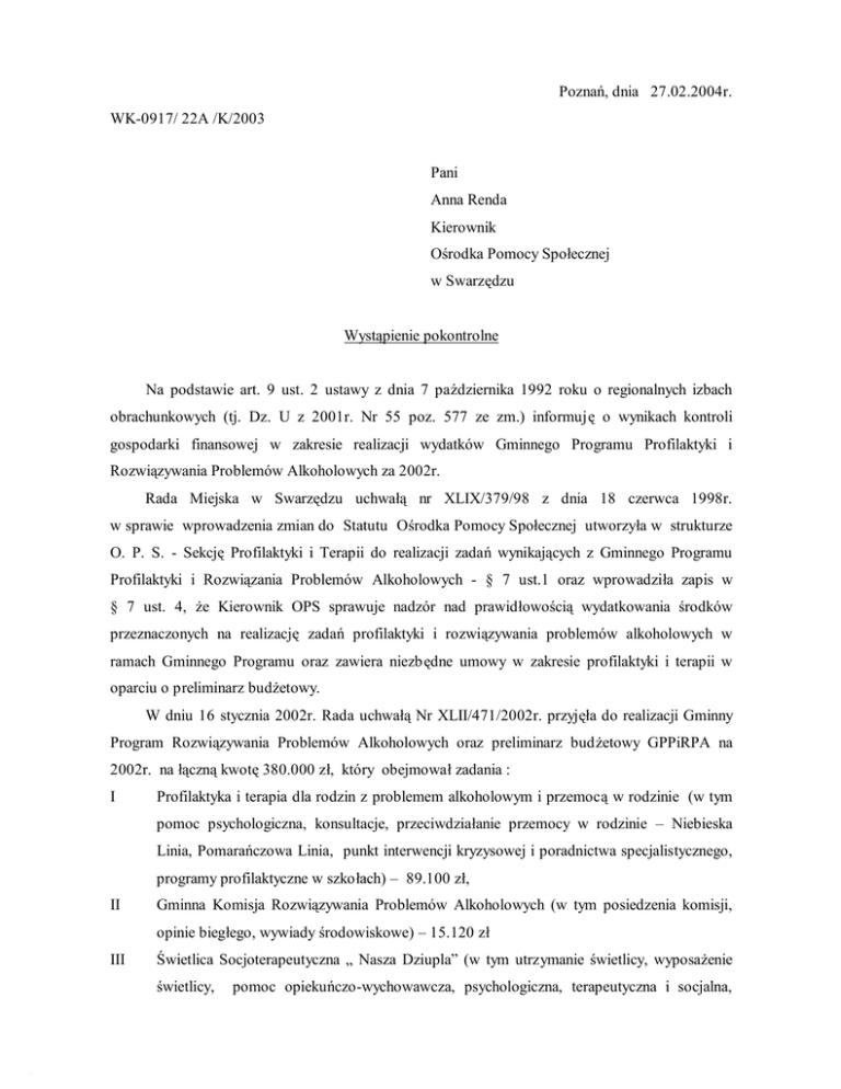Poznań, dnia 27.02.2004r. WK-0917/ 22A /K/2003 Pani Anna Renda Kierownik Ośrodka Pomocy Społecznej w Swarzędzu Wystąpienie pokontrolne Na podstawie art. 9 ust. 2 ustawy z dnia 7 października 1992 roku o regionalnych izbach obrachunkowych (tj. Dz. U z 2001r. Nr 55 poz. 577 ze zm.) informuję o wynikach kontroli gospodarki finansowej w zakresie realizacji wydatków Gminnego Programu Profilaktyki i Rozwiązywania Problemów Alkoholowych za 2002r. Rada Miejska w Swarzędzu uchwałą nr XLIX/379/98 z dnia 18 czerwca 1998r. w sprawie wprowadzenia zmian do Statutu Ośrodka Pomocy Społecznej utworzyła w strukturze O. P. S. - Sekcję Profilaktyki i Terapii do realizacji zadań wynikających z Gminnego Programu Profilaktyki i Rozwiązania Problemów Alkoholowych - § 7 ust.1 oraz wprowadziła zapis w § 7 ust. 4, że Kierownik OPS sprawuje nadzór nad prawidłowością wydatkowania środków przeznaczonych na realizację zadań profilaktyki i rozwiązywania problemów alkoholowych w ramach Gminnego Programu oraz zawiera niezbędne umowy w zakresie profilaktyki i terapii w oparciu o preliminarz budżetowy. W dniu 16 stycznia 2002r. Rada uchwałą Nr XLII/471/2002r. przyjęła do realizacji Gminny Program Rozwiązywania Problemów Alkoholowych oraz preliminarz budżetowy GPPiRPA na 2002r. na łączną kwotę 380.000 zł, który obejmował zadania : I Profilaktyka i terapia dla rodzin z problemem alkoholowym i przemocą w rodzinie (w tym pomoc psychologiczna, konsultacje, przeciwdziałanie przemocy w rodzinie – Niebieska Linia, Pomarańczowa Linia, punkt interwencji kryzysowej i poradnictwa specjalistycznego, programy profilaktyczne w szkołach) – 89.100 zł, II Gminna Komisja Rozwiązywania Problemów Alkoholowych (w tym posiedzenia komisji, opinie biegłego, wywiady środowiskowe) – 15.120 zł III Świetlica Socjoterapeutyczna „ Nasza Dziupla” (w tym utrzymanie świetlicy, wyposażenie świetlicy, pomoc opiekuńczo-wychowawcza, psychologiczna, terapeutyczna i socjalna, 2 obozy socjoterapeutyczne wycieczki, biwaki, dożywianie dzieci) – 92.760 zł, IV Świetlica Integracyjna – Terapeutyczna (w tym utrzymanie świetlicy, pomoc opiekuńczowychowawcza, psychologiczna, terapeutyczna, socjalna i administracyjno- gospodarcza, obozy, wycieczki, biwaki, dożywianie dzieci, prace adaptacyjno-remontowe, doposażenia) – 102.020 zł, V Współpraca z instytucjami i organizacjami stykającymi się z problemami alkoholowymi i przemocą w rodzinie (w tym organizowanie spotkań roboczych, obozy, wspomaganie działalności stowarzyszeń służącej do rozwiązywania problemów alkoholowych) – 36.000 zł, VI Działalność informacyjna i edukacyjna (w tym promowanie treści Gminnego Programu, plakaty, ulotki, artykuły, kampanie itp.) – 2.000 zł, VII Szkolenia dla realizatorów zadań Gminnego Programu – 10.000 zł, VIII Sekcja Profilaktyki i Terapii, w tym nadzór nad prawidłową realizacją zadań Gminnego Programu, koordynacja merytoryczna, obsługa księgowo-finansowa i kadrowo- administracyjna utrzymanie (art. biurowe, koszty delegacji, ksero, środki czystości) – 33.000 zł. . Na podstawie ewidencji księgowej oraz sprawozdania Rb-28S z wykonania planu wydatków budżetowych za 2002r. ustalono, że planowane i wykonane wydatki w rozdziale 85154 „Przeciwdziałanie alkoholizmowi„ przedstawiały się następująco: § wydatków Plan wydatkó w 2580 Dotacja podmiotowa z budżetu dla Wydatki wg Wydatki wg uchwały ewidencji Rb-28S budżetowej księgowej 63.700,- 63.700,- 63.700,- jednostek niezaliczonych do sektora finansów publicznych. 3020 Nagrody i wydatki osobowe nie zaliczone do wynagrodzeń 1.281, - 1.281,00 1.281,- 3030 Różne wydatki na rzecz osób fizycznych 12.350,- 8.400,00 8.400,- 4010 Wynagrodzenia osobowe pracowników 46.320,- 39.720,36 39.720,- 3.900,- 2.694,00 2.694,- 19.830,- 15.992,80 15.993,- 4040 Dodatkowe wynagrodzenie roczne 4110 Składki na ubezpieczenie społeczne 4120 Składki na fundusz pracy 2.070,- 4210 Zakup materiałów i wyposażenia 25.830,2 1.169,72 17.665,23 1.170, 17.665,- 3 4220 Zakup środków żywności 35.600,- 16.782,05 16.782,- 4260 Zakup energii 30.130,- 30.129,36 30.129,- 4270 Zakup usług remontowych 56.727,- 40.064,50 40.065,- 318.730,- 225.645,06 225.645,- 4410 Podróże służbowe krajowe 4.000,- 1.566,33 1.566,- 4430 Różne opłaty i składki 3.500,- 0 659,- 659,00 659, - 624.737,- 465.469,45 465.469,- 4300 Zakup usług pozostałych 4440 Odpisy na ZFŚŚ Ogółem 0 Z opisowego sprawozdania z wykonania budżetu za 2002r. wynika, że w rozdziale 85154 „Przeciwdziałanie alkoholizmowi„ kwotę 465.469 zł przeznaczono na realizację Gminnego Programu Rozwiązywania Problemów Alkoholowych poprzez Ośrodek Pomocy Społecznej. Wydatki dotyczyły działalności świetlic socjoterapeutycznych na osiedlu Czwartaków w Swarzędzu, w Gruszczynie i w Uzarzewie w tym : 1. dożywianie dzieci w świetlicach............................ .............................................. 16.782 z ł 2. zakup materiałów i wyposażenia.............................................................................. 17.665 z ł 3. opłaty eksploatacyjne ................................................... ........................................ 30.129 z ł 4. prace adaptacyjno-remontowe w świetlicy przy ul. Działkowej ............................. 32.422 z ł 5. koszty umów zleceń pracowników świetlic oraz obsługi punktów konsultacyj. .. 116.597 zł 6. programy profilaktyczne w szkołach ....................................................................... 22.164 z ł 7. obozy i kolonie socjoterapeutyczne........................................................................... .71.470 z ł 8. wynagrodzenia wraz z pochodnymi ...........................................................................59.577 z ł 9. przekazano w formie dotacji dla Stowarzyszenia Abstynentów Żagiel......................23.700 z ł 10. przekazano dla Akcji K
