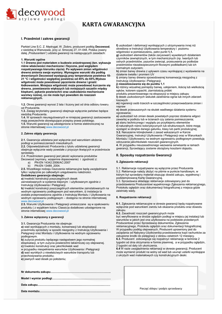KARTA GWARANCYJNA I. Przedmiot i zakres gwarancji Parkiet Line S.C. Z. Mędrygał, W. Ziobro, producent podłóg Decowood, z siedzibą w Warszawie, przy ul. Smoczej 27, 01-048, Polska (zwany dalej „Producentem”) udziela gwarancji na następujących zasadach: 1. Warunki ogólne 1.1 Drewno jest materiałem o budowie anizotropowej (tzn. wykazuje różne właściwości mechaniczne i fizyczne, pod względem rozpatrywanego kierunku cięcia). Po wpływem zmian wilgotności drewno zmienia swoje wymiary. Wymagane warunki dla podłóg drewnianych Decowood występują przy temperaturze powietrza 1821 °C i wilgotności względnej powietrza od 45% do 65%.Wyższa wilgotność może powodować pęcznienie drewna i grozić łódkowaniem. Mniejsza wilgotność może powodować kurczenie się drewna, powstawanie większych lub mniejszych szczelin między klepkami, pękanie powierzchni oraz uszkodzenia mechaniczne warstwy nośnej, co nie może być powodem do roszczeń reklamacyjnych. 1.2. Okres gwarancji wynosi 2 lata i liczony jest od dnia odbioru towaru od Producenta. 1.3. Zasięg terytorialny gwarancji obejmuje wyłącznie państwo będące siedzibą Producenta. 1.4. W sprawach nieuregulowanych w niniejszej gwarancji zastosowanie mają powszechnie obowiązujące przepisy prawa polskiego. 1.5. Warunki gwarancji są udostępnione w formie elektronicznej na stronie internetowej:www.decowood.pl 2. Zakres objęty gwarancją 2.1. Gwarancja udzielana jest wyłącznie pod warunkiem ułożenia podłogi w pomieszczeniach mieszkalnych. 2.2. Odpowiedzialność Producenta z tytułu udzielonej gwarancji obejmuje wyłącznie wady powstałe z przyczyn tkwiących w przedmiocie sprzedaży. 2.4. Przedmiotem gwarancji jest jakość wykonania produktów Decowood (wymiary, wzajemne dopasowanie) i zgodność z: a) PN-EN 14342:2006/AC:2007 b) PN-EN 13489_2004. 2.5. Wszelkiego rodzaju roszczenia reklamacyjne będą uwzględniane tylko i wyłącznie po całkowitym uregulowaniu należności. Dodatkowo gwarancja obejmuje: a) trwałość konstrukcji poszczególnych desek zainstalowanych w systemie klejonym i użytkowanym zgodnie z Instrukcją Użytkowania i Pielęgnacji. b) trwałość konstrukcji poszczególnych elementów zainstalowanych na wodnym ogrzewaniu podłogowym pod warunkiem, iż instalacja ta została przeprowadzona zgodnie z Instrukcją Montażu i Użytkowania na wodnym ogrzewaniu podłogowym – dostępna na stronie internetowej www.decowood.pl 2.5. Warunki Użytkowania i Pielęgnacji umieszczane są w opakowaniu produktu ( z wyjątkiem koloru Classic)a dodatkowo udostępnione na stronie internetowej www.decowood.pl 3. Zakres wyłączony z gwarancji 3.1. Gwarancja Producenta nie obejmuje: a) wad wynikających z montażu, konserwacji lub eksploatacji przedmiotu sprzedaży w sposób niezgodny z Instrukcją Użytkowania i Pielęgnacji oraz Montażu i Użytkowania na wodnym ogrzewaniu podłogowym. b) zużycia produktu będącego następstwem jego normalnej eksploatacji, w tym zużycia powierzchni lakierniczej czy olejowanej. c) trwałości konstrukcji oraz jakichkolwiek wad w przypadku niespełnienia warunków Użytkowania i Pielęgnacji d) wad wynikłych z niewłaściwych warunków transportu lub przechowywania produktu; e) jawnych wad desek po położeniu; f) uszkodzeń i deformacji wynikających z utrzymywania innej niż określona w Instrukcji Użytkowania temperatury i poziomu wilgotności w pomieszczeniu, patrz punkt 1,1. g) uszkodzeń elementów (także zarysowań) wywołanych działaniem czynników zewnętrznych, w tym mechanicznych (np. twardych lub ostrych przedmiotów, pazurów zwierząt, przesuwania po podłodze przedmiotów niezabezpieczonych filcowymi podkładkami) lub ich normalnym zużyciem; h) zmian barwy drewna z upływem czasu wynikającej z wystawienia na działanie światła i promieni UV i) zmiany barwy drewna spowodowanej konserwacją niezgodną z Instrukcją Użytkowania i Pielęgnacji; j) niezastosowania się do punktu 1.1 k) różnicy wizualnej pomiędzy barwą, usłojeniem, ilością lub wielkością sęków, kolorem szpachli, ziarnistością próbki produktu prezentowanego na ekspozycji w miejscu zakupu l) desek uszkodzonych wskutek zaistnienia ognia lub innych zdarzeń losowych m) ingerencji osób trzecich w szczególności przeprowadzania zmian i napraw n) desek przesuszonych na skutek wadliwego działania systemu ogrzewania; o) uszkodzeń lub zmian desek powstałych poprzez działania wilgoci zawartej w podłożu lub w ścianach czy zalania pomieszczenia; p) stanu technicznego i wyglądu po przyklejeniu elementów r) naturalnych różnic kolorystycznych lub strukturowych, które mogą wystąpić w obrębie danego gatunku, klasy lub partii produkcyjnej; 3.2. Naruszenie którejkolwiek z zasad wskazanych w Karcie Gwarancyjnej, Instrukcji Użytkowania i Pielęgnacji oraz w Warunkach Montażu i Użytkowaniu na wodnym ogrzewaniu podłogowym powodują odrzucenie jakichkolwiek roszczeń gwarancyjnych. 4. W przypadku nieuzasadnionego wezwania serwisanta w ramach gwarancji, Sprzedający zostanie obciążony kosztami dojazdu. II. Sposoby rozpatrzenia Gwarancji 5. Zgłaszanie reklamacji 5.1. Reklamacje rozpatrywane są wyłącznie przez Producenta 5.2. Reklamacje należy złożyć na piśmie w punkcie handlowym, w którym był sprzedany materiał okazując dowód zakupu, wypełnoną i podstemplowaną Kartę Gwarancyjną. 5.3. Sprzedawca składając reklamacje zobowiązany jest do przedstawienia Producentowi wypełnionego Zgłoszenia reklamacyjnego, Protokołu oględzin oraz dokumentacji fotograficznej z miejsca gdzie zaistniały wady. 6. Rozpatrzenie reklamacji 6.1. Zgłoszenia reklamacyjne w okresie gwarancji będą rozpatrywane wyłącznie pod warunkiem zwrotu lub okazania produktu oraz dowodu zakupu. 6.2. Zasadność roszczeń gwarancyjnych może być weryfikowana w drodze oględzin podłogi w miejscu jej instalacji lub warunków w jakich jest ona użytkowana na podstawie przesłanych Producent