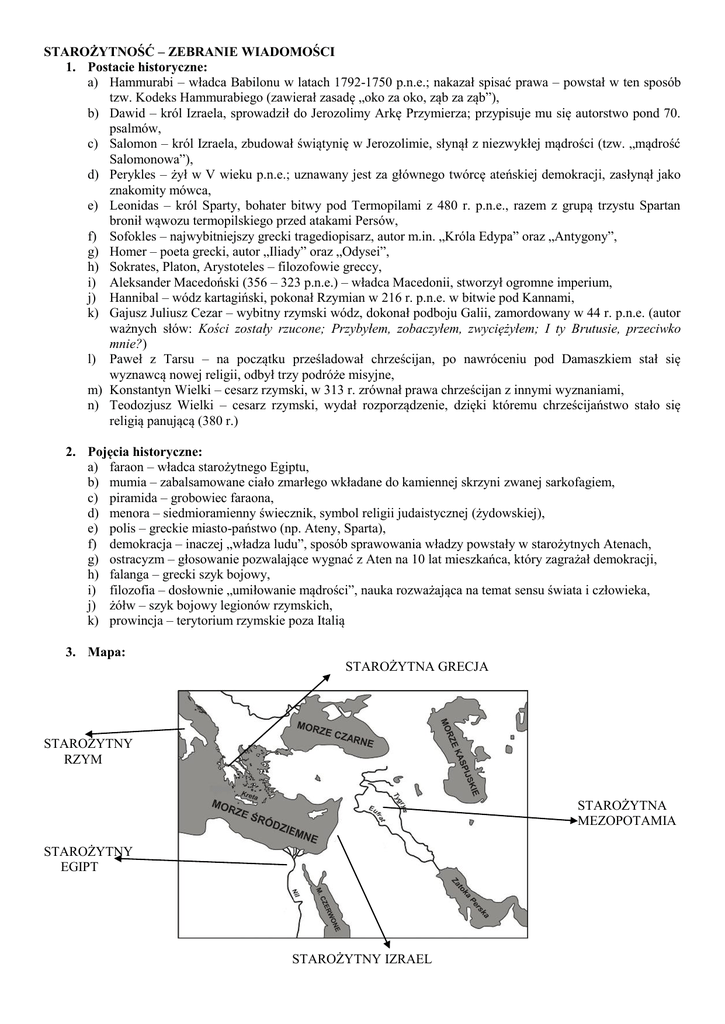 STAROŻYTNOŚĆ – ZEBRANIE WIADOMOŚCI 1. Postacie historyczne: a) Hammurabi – władca Babilonu w latach 1792-1750 p.n.e.; nakazał spisać prawa – powstał w ten sposób tzw. Kodeks Hammurabiego (zawierał zasadę „oko za oko, ząb za ząb”), b) Dawid – król Izraela, sprowadził do Jerozolimy Arkę Przymierza; przypisuje mu się autorstwo pond 70. psalmów, c) Salomon – król Izraela, zbudował świątynię w Jerozolimie, słynął z niezwykłej mądrości (tzw. „mądrość Salomonowa”), d) Perykles – żył w V wieku p.n.e.; uznawany jest za głównego twórcę ateńskiej demokracji, zasłynął jako znakomity mówca, e) Leonidas – król Sparty, bohater bitwy pod Termopilami z 480 r. p.n.e., razem z grupą trzystu Spartan bronił wąwozu termopilskiego przed atakami Persów, f) Sofokles – najwybitniejszy grecki tragediopisarz, autor m.in. „Króla Edypa” oraz „Antygony”, g) Homer – poeta grecki, autor „Iliady” oraz „Odysei”, h) Sokrates, Platon, Arystoteles – filozofowie greccy, i) Aleksander Macedoński (356 – 323 p.n.e.) – władca Macedonii, stworzył ogromne imperium, j) Hannibal – wódz kartagiński, pokonał Rzymian w 216 r. p.n.e. w bitwie pod Kannami, k) Gajusz Juliusz Cezar – wybitny rzymski wódz, dokonał podboju Galii, zamordowany w 44 r. p.n.e. (autor ważnych słów: Kości zostały rzucone; Przybyłem, zobaczyłem, zwyciężyłem; I ty Brutusie, przeciwko mnie?) l) Paweł z Tarsu – na początku prześladował chrześcijan, po nawróceniu pod Damaszkiem stał się wyznawcą nowej religii, odbył trzy podróże misyjne, m) Konstantyn Wielki – cesarz rzymski, w 313 r. zrównał prawa chrześcijan z innymi wyznaniami, n) Teodozjusz Wielki – cesarz rzymski, wydał rozporządzenie, dzięki któremu chrześcijaństwo stało się religią panującą (380 r.) 2. Pojęcia historyczne: a) faraon – władca starożytnego Egiptu, b) mumia – zabalsamowane ciało zmarłego wkładane do kamiennej skrzyni zwanej sarkofagiem, c) piramida – grobowiec faraona, d) menora – siedmioramienny świecznik, symbol religii judaistycznej (żydowskiej), e) polis – greckie miasto-państwo (np. Ateny, Sparta), f) demokracja – inaczej „władza ludu”, sposób sprawowania władzy powstały w starożytnych Atenach, g) ostracyzm – głosowanie pozwalające wygnać z Aten na 10 lat mieszkańca, który zagrażał demokracji, h) falanga – grecki szyk bojowy, i) filozofia – dosłownie „umiłowanie mądrości”, nauka rozważająca na temat sensu świata i człowieka, j) żółw – szyk bojowy legionów rzymskich, k) prowincja – terytorium rzymskie poza Italią 3. Mapa: STAROŻYTNA GRECJA STAROŻYTNY RZYM STAROŻYTNA MEZOPOTAMIA STAROŻYTNY EGIPT STAROŻYTNY IZRAEL 4. Taśma chronologiczna (daty i wydarzenia) pierwsza igrzyska olimpijskie 776 r. p.n.e. bitwa pod Termopilami (klęska Greków) 480 r. p.n.e. wydanie przez Konstantyna „edyktu mediolańskiego” 313 r. początek „niewoli babilońskiej” Żydów 586 r. p.n.e. śmierć Juliusza Cezara 44 r. p.n.e. bitwa pod Maratonem (zwycięstwo Greków) 490 r. p.n.e. PRZED 900 r. 800 r. 700 r. NASZĄ 600 r. ERĄ 500 r. 400 r . uznanie przez Teodozjusza chrześcijaństwa za religię panującą 380 r. NASZEJ 300 r. 200 r. 753 r. p.n.e. założenie Rzymu przez Romulusa 100 r. 1 r. 100 r. ERY 200 r. 300 r. 400 r. 500 r. narodziny Jezusa Chrystusa 480 r. p.n.e. bitwa u wybrzeży Salaminy (zwycięstwo Greków) 216 r. p.n.e. bitwa pod Kannami (Rzymianie pokonani przez Hannibala) 27 r. p.n.e. początek cesarstwa w Rzymie 323 r. p.n.e. śmierć Aleksandra Macedońskiego 476 r. upadek cesarstwa zachodniorzymskiego (koniec starożytności) 5. Zabytki związane z historią starożytną: ` 1/ Wielki Sfinks – ogromny posąg lwa z ludzką twarzą, strzeże piramid w Gizie, ma 20 m wysokości i 70 m długości 3/ Ściana Płaczu – jedyna pozostałość po Świątyni Jerozolimskiej 5/ Teatr w Epidauros – najlepiej zachowany do dziś teatr grecki 7/ Wilczyca kapitolińska – wykonana z brązu rzeźba (wykonana prawdopodobnie w V w. p.n.e.) 9/ Akwedukt w Pont du Gard we Francji – wybudowany pod koniec I w. p.n.e.; 2/ Piramida Cheopsa w Gizie – najwyższa piramida (miała wysokość 146 m) 4/ Partenon – znajdująca się na wzgórzu Akropol świątynia w Atenach, poświęcona była opiekunce miasta, czyli Atenie 6/ Dyskobol – rzeźba autorstwa greckiego rzeźbiarza Myrona 8/ Łuk tryumfalny w Orange – powstał w I wieku n.e. z okazji zwycięstw Rzymian nad Galami 10/ Koloseum – amfiteatr w Rzymie, wzniesiony w latach 70-82 n.e.; mieścił 55 tys. widzów 6. Przygotować szczegółowe przedstawienie dwóch zagadnień (w oparciu o podręcznik) 1/ „Społeczeństwo egipskie” – infografika s. 30 2/ „Życie Spartanina” – infografika s. 67. KAŻDA WYPOWIEDŹ MUSI ZAWIERAĆ MINIMUM 10 RÓŻNYCH INFORMACJI!!!