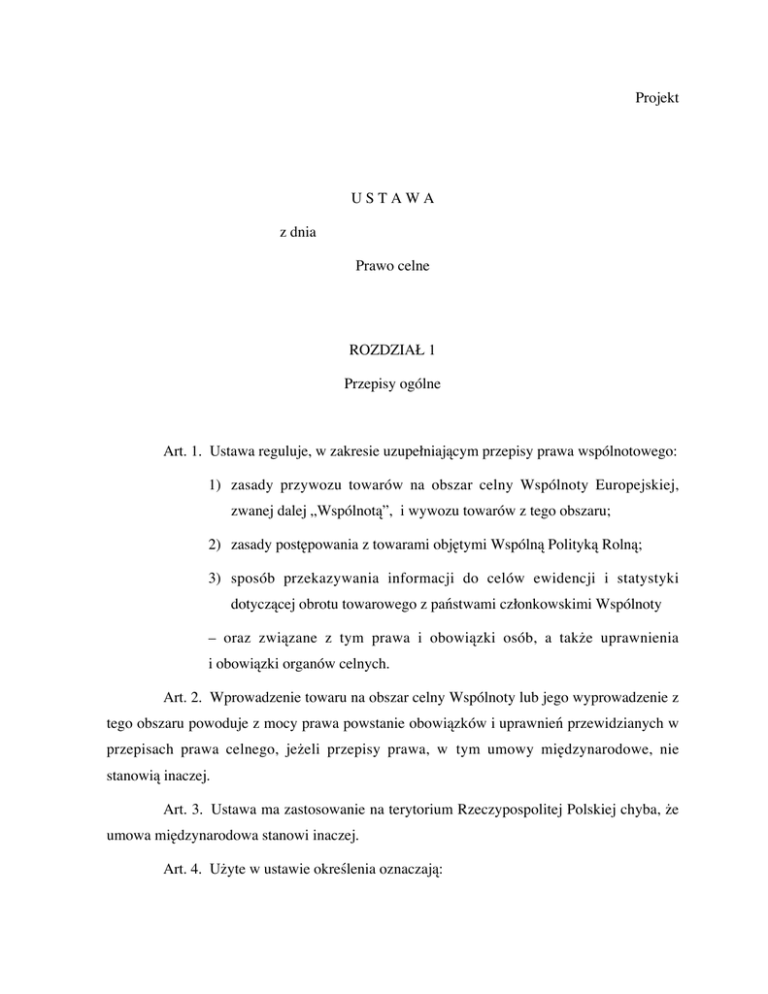 Projekt U S T A W A z dnia Prawo celne ROZDZIAŁ 1 Przepisy