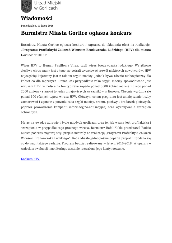 Wiadomości Poniedziałek, 11 lipca 2016 Burmistrz Miasta Gorlice ogłasza konkurs Burmistrz Miasta Gorlice ogłasza konkurs i zaprasza do składania ofert na realizację „Programu Profilaktyki Zakażeń Wirusem Brodawczaka Ludzkiego (HPV) dla miasta Gorlice” w 2016 r. Wirus HPV to Human Papilloma Virus, czyli wirus brodawczaka ludzkiego. Wyjątkowo złośliwy wirus znany jest z tego, że potrafi wywoływać rozwój niektórych nowotworów. HPV najczęściej kojarzony jest z rakiem szyjki macicy, jednak bywa równie niebezpieczny dla kobiet co dla mężczyzn. Ponad 2/3 przypadków raka szyjki macicy spowodowane jest wirusem HPV. W Polsce na ten typ raka zapada ponad 3600 kobiet rocznie z czego ponad 2000 umiera – stanowi to jeden z najwyższych wskaźników w Europie. Obecnie wyróżnia się ponad 100 różnych typów wirusa HPV. Głównym celem programu jest zmniejszenie liczby zachorowań i zgonów z powodu raka szyjki macicy, sromu, pochwy i brodawek płciowych, poprzez prowadzenie kampanii informacyjno-edukacyjnej oraz wykonywanie szczepień ochronnych. Mając na uwadze zdrowie i życie młodych gorliczan oraz to, jak ważna jest profilaktyka i szczepienia w przypadku tego groźnego wirusa, Burmistrz Rafał Kukla przedstawił Radzie Miasta podczas majowej sesji projekt uchwały na realizację „Programu Profilaktyki Zakażeń Wirusem Brodawczaka Ludzkiego”. Rada Miasta jednogłośnie poparła projekt i zgodziła się co do wagi takiego zadania. Program będzie realizowany w latach 2016-2018. W oparciu o wnioski z ewaluacji i monitoringu zostanie rozważone jego kontynuowanie. Konkurs HPV