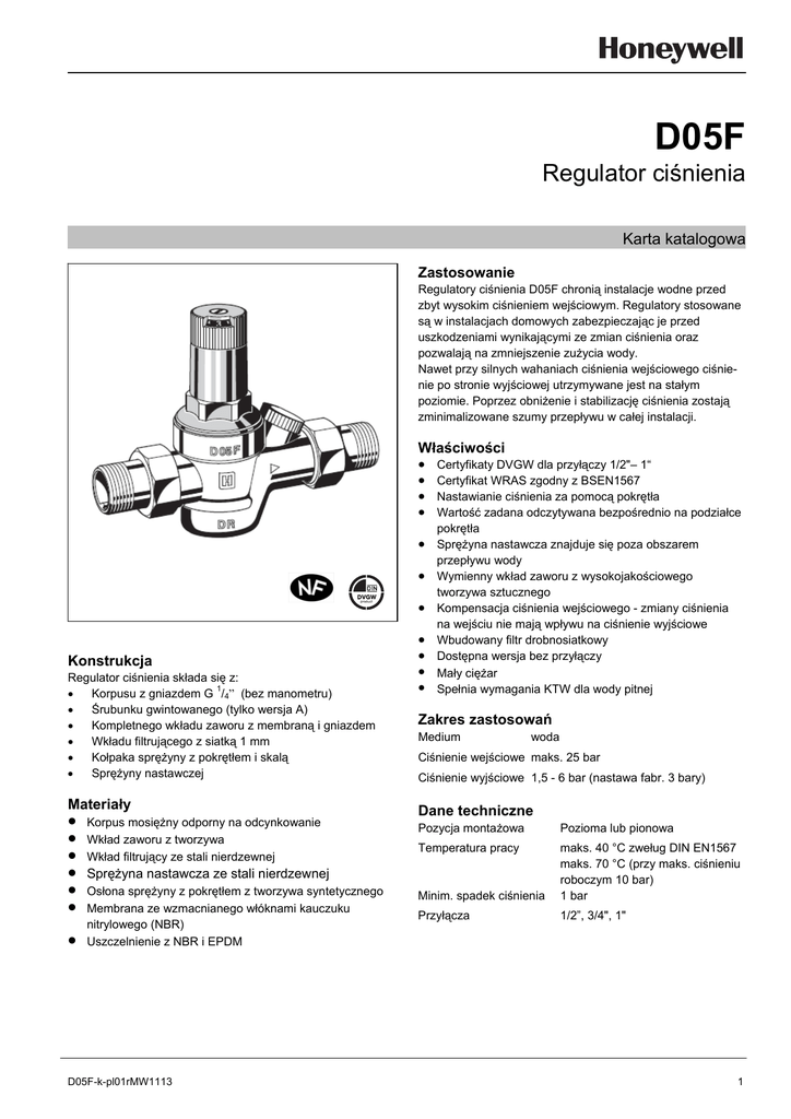 D05F Regulator ciśnienia Karta katalogowa Zastosowanie Regulatory ciśnienia D05F chronią instalacje wodne przed zbyt wysokim ciśnieniem wejściowym. Regulatory stosowane są w instalacjach domowych zabezpieczając je przed uszkodzeniami wynikającymi ze zmian ciśnienia oraz pozwalają na zmniejszenie zużycia wody. Nawet przy silnych wahaniach ciśnienia wejściowego ciśnienie po stronie wyjściowej utrzymywane jest na stałym poziomie. Poprzez obniżenie i stabilizację ciśnienia zostają zminimalizowane szumy przepływu w całej instalacji. Właściwości Certyfikaty DVGW dla przyłączy 1/2"– 1“ Certyfikat WRAS zgodny z BSEN1567 Nastawianie ciśnienia za pomocą pokrętła Wartość zadana odczytywana bezpośrednio na podziałce pokrętła Sprężyna nastawcza znajduje się poza obszarem przepływu wody Wymienny wkład zaworu z wysokojakościowego tworzywa sztucznego Kompensacja ciśnienia wejściowego - zmiany ciśnienia Konstrukcja Regulator ciśnienia składa się z: Korpusu z gniazdem G 1/4” (bez manometru) Śrubunku gwintowanego (tylko wersja A) Kompletnego wkładu zaworu z membraną i gniazdem Wkładu filtrującego z siatką 1 mm Kołpaka sprężyny z pokrętłem i skalą Sprężyny nastawczej Materiały Korpus mosiężny odporny na odcynkowanie Wkład zaworu z tworzywa Wkład filtrujący ze stali nierdzewnej na wejściu nie mają wpływu na ciśnienie wyjściowe Wbudowany filtr drobnosiatkowy Dostępna wersja bez przyłączy Mały ciężar Spełnia wymagania KTW dla wody pitnej Zakres zastosowań Medium woda Ciśnienie wejściowe maks. 25 bar Ciśnienie wyjściowe 1,5 - 6 bar (nastawa fabr. 3 bary) Dane techniczne Pozycja montażowa Pozioma lub pionowa Temperatura pracy Minim. spadek ciśnienia maks. 40 °C zweług DIN EN1567 maks. 70 °C (przy maks. ciśnieniu roboczym 10 bar) 1 bar Przyłącza 1/2”, 3/4", 1" Sprężyna nastawcza ze stali nierdzewnej Osłona sprężyny z pokrętłem z tworzywa syntetycznego Membrana ze wzmacnianego włóknami kauczuku nitrylowego (NBR) Uszczelnienie z NBR i EPDM D05F-k-pl01rMW1113 1 D05F Regulator ciśnienia Zasada działania Regulator ciśnienia działa na zasadzie równowagi sił działających na membranę: z jednej strony wynikającej z napięcia sprężyny, a z drugiej strony sił parcia od ciśnienia po redukcji. W przypadku występowania zmiennego ciśnienia wejściowego ruchomy wkład zaworu ustawia się w nowe położenie równowagi dla danej nastawy ciśnienia i ilości odbieranej wody (kompensacja ciśnienia wejściowego). W przypadku ustania poboru wody - zawór całkowicie się domyka. Bez względu na zmienne ciśnienie na wlocie, ciśnienie na wylocie pozostaje na niezmiennym poziomie dpowiadającym wartości nastawy. Oznaczenia katalogowe D05F-... A = Z gwintem zewnętrznym D05F-... E = Bez przyłaczy gwintowanych Specjalne wersje dostępne na życzenie Przyłącze Nominalna wielkość Waga Wymiary R 1/2" 3/4" 1" Ri 1/2" 3/4" - Ra DN 3/4" 15 1" 20 11/4" 25 kg 0,65 0,82 1,35 150 168 186 l 90 100 107 H 122 122 122 mm L Współczynnik kvs h 33 33 33 m3/h 2,6 2,8 3,0 Akcesoria M38K Manometr Obudowa 50mm, przyłącze dolne G 1/4" Zakresy: 0-4; 0-10; 0-16 lub 0 -25 bar Przy zamówieniu należy podać zakres M38K ZR06K ZR06K Klucz dwuoczkowy do montażu i demontażu osłony sprężyny VST06-A Śrubunek gwintowany VST06-B Złączki do spawania VST06-A 2 VST06-B D05F Regulator ciśnienia Przykład instalacji Przyłącze W* R ½“ ¾“ 1“ DN 15 20 25 mm 55 55 55 * Minimalna odległość od ściany do osi przewodu Zasady montażu Typowe zastosowania • Możliwy montaż w pozycji poziomej i pionowej • • Zamontować zawory odcinające Miejsce montażu powinno być chronione przed mrozem • Zapewnić dostęp do urządzenia tak, aby: odczyt manometru był dobrze widoczny ułatwić serwis i kontrolę Regulatory ciśnienia są przeznaczone do wszystkich typów domowych instalacji wodnych. Regulatory można stosować również w instalacjach przemysłowych zgodnie ze swoim przeznaczeniem i z uwzględnieniem parametrów technicznych. Regulator ciśnienia powinien być instalowany: W domowej instalacji przed regulatorem należy montować filtr drobnosiatkowy (dodatkowe zabezpieczenie przed zanieczyszczeniami) Zalecany jest prosty odcinek rury za regulatorem o długości co najmniej 5 razy większej od średnicy nominalnej (zgodnie z DIN EN806, Część 2) Gdy ciśnienie statyczne przekracza maksymalne, dopuszczalne ciśnienie w instalacji W celu obniżenia poziomu hałasu, gdy ciśnienie w miejscach poboru przekracza 5 bar W przypadku podziału instalacji na strefy ciśnienia np. na każdym piętrze budynku wielopiętrowego Gdy należy unikać zmian ciśnienia w instalacji Gdy w instalacji znajdują się urządzenia, które muszą być chronione przed nadmiernym ciśnieniem zasilania Diagram przepływu 3 D05F Regulator ciśnienia Części zamienne regulatora ciśnienia D 05F (od 2000 roku) 1 3 2 Nr Opis Wymiar Nr części 1 Kołpak sprężyny kompletny ze skalą 1/2" - 1" 0901515 2 Wkład zaworu wymienny 1/2" - 1" (bez filtra) D05FA-1/2B 3 Wkład filtrujący wymienny 1/2" - 1" ES05F-1/2A 4 Korek z uszczelnieniem O-Ring R 1/4” (5 sztuk) S06K-1/4 1/2" - 1" 4 Honeywell Sp. z o. o. ul. Domaniewska 39b, 02-672 WARSZAWA Tel.: 22 606 09 00; Faks: 22 606 09 83 www.honeywell.com.pl/automatyka_domow 4 D05F-k-pl01rMW1113