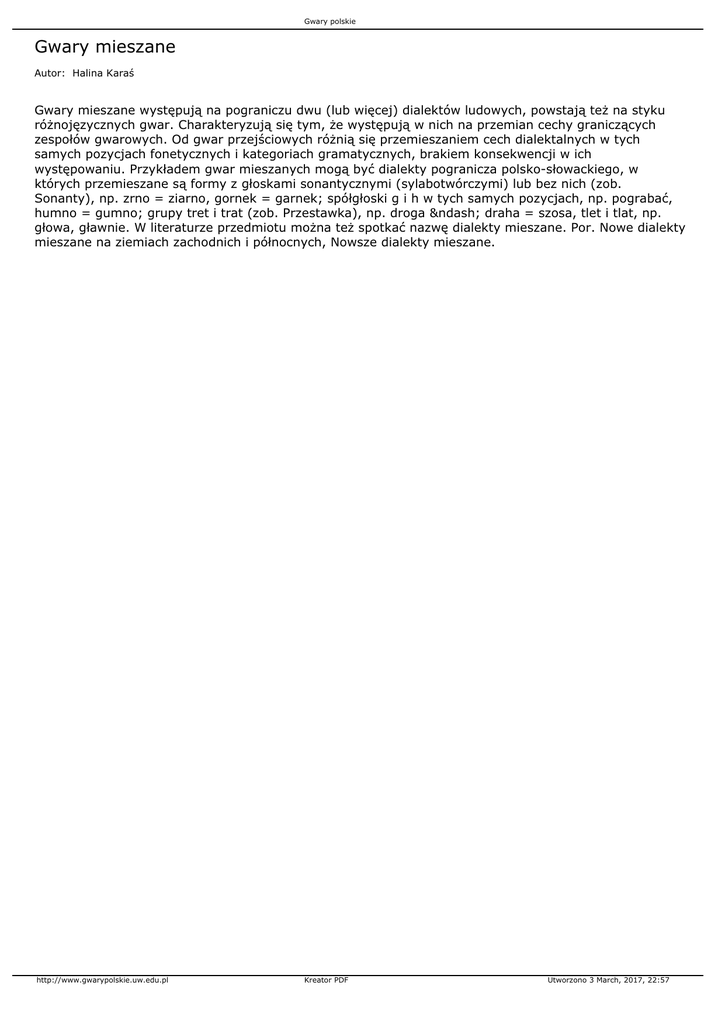 Gwary polskie Gwary mieszane Autor: Halina Karaś Gwary mieszane występują na pograniczu dwu (lub więcej) dialektów ludowych, powstają też na styku różnojęzycznych gwar. Charakteryzują się tym, że występują w nich na przemian cechy graniczących zespołów gwarowych. Od gwar przejściowych różnią się przemieszaniem cech dialektalnych w tych samych pozycjach fonetycznych i kategoriach gramatycznych, brakiem konsekwencji w ich występowaniu. Przykładem gwar mieszanych mogą być dialekty pogranicza polsko-słowackiego, w których przemieszane są formy z głoskami sonantycznymi (sylabotwórczymi) lub bez nich (zob. Sonanty), np. zrno = ziarno, gornek = garnek; spółgłoski g i h w tych samych pozycjach, np. pograbać, humno = gumno; grupy tret i trat (zob. Przestawka), np. droga – draha = szosa, tlet i tlat, np. głowa, gławnie. W literaturze przedmiotu można też spotkać nazwę dialekty mieszane. Por. Nowe dialekty mieszane na ziemiach zachodnich i północnych, Nowsze dialekty mieszane. http://www.gwarypolskie.uw.edu.pl Kreator PDF Utworzono 3 March, 2017, 22:57