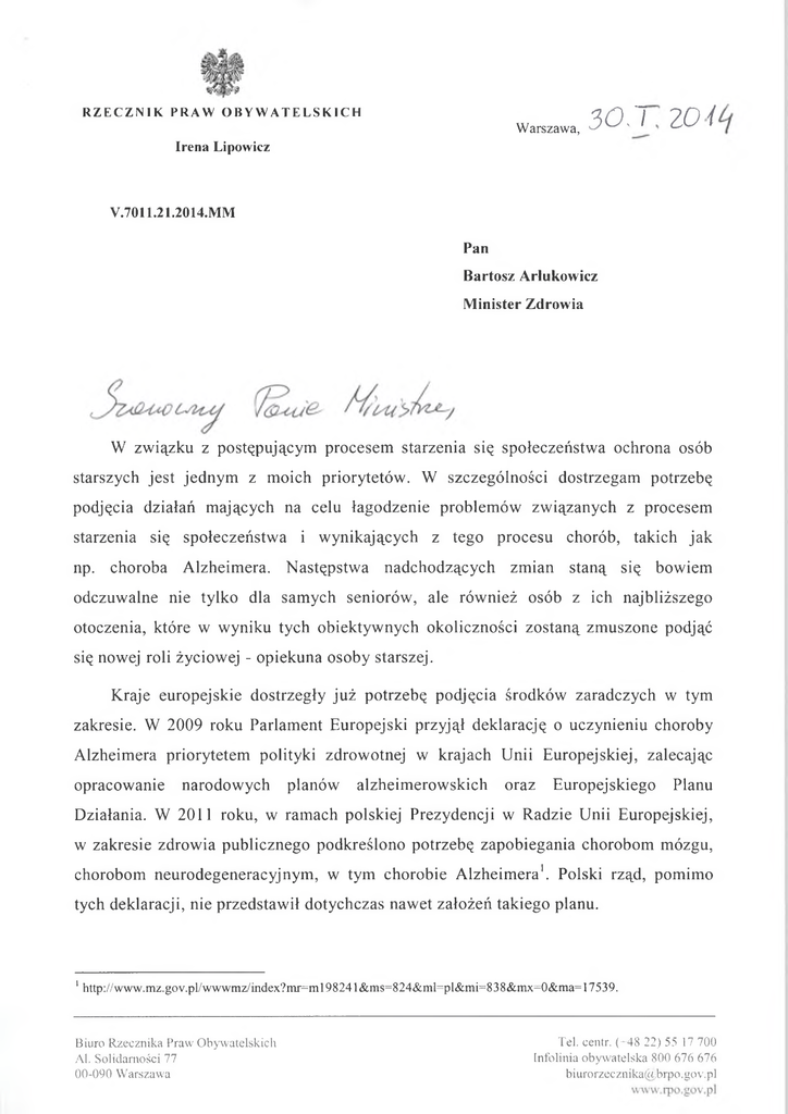 RZECZNIK PRAW OBYWATELSKICH Warszawa, 30 J 20 i Irena Lipowicz V.7011.21.2014.MM Pan Bartosz Arłukowicz Minister Zdrowia W związku z postępującym procesem starzenia się społeczeństwa ochrona osób starszych jest jednym z moich priorytetów. W szczególności dostrzegam potrzebę podjęcia działań mających na celu łagodzenie problemów związanych z procesem starzenia się społeczeństwa i wynikających z tego procesu chorób, takich jak np. choroba Alzheimera. Następstwa nadchodzących zmian staną się bowiem odczuwalne nie tylko dla samych seniorów, ale również osób z ich najbliższego otoczenia, które w wyniku tych obiektywnych okoliczności zostaną zmuszone podjąć się nowej roli życiowej - opiekuna osoby starszej. Kraje europejskie dostrzegły już potrzebę podjęcia środków zaradczych w tym zakresie. W 2009 roku Parlament Europejski przyjął deklarację o uczynieniu choroby Alzheimera priorytetem polityki zdrowotnej w krajach Unii Europejskiej, zalecając opracowanie narodowych planów alzheimerowskich oraz Europejskiego Planu Działania. W 2011 roku, w ramach polskiej Prezydencji w Radzie Unii Europejskiej, w zakresie zdrowia publicznego podkreślono potrzebę zapobiegania chorobom mózgu, chorobom neurodegeneracyjnym, w tym chorobie Alzheimera1. Polski rząd, pomimo tych deklaracji, nie przedstawił dotychczas nawet założeń takiego planu. 1http://www.mz.gov.pl/wwwmz/index?mr=ml 9824 l&ms=824&ml=pl&mi=838&mx=0&ma= 17539. Biuro Rzecznika Praw Obywatelskich Al. Solidarności 77 00-090 Warszawa Tel. eentr. (+48 22) 55 17 700 Infolinia obywatelska 800 676 676 [email protected] Brak narodowego planu alzheimerowskiego budzi niepokój. Waga problemu spowodowała, że w dniu 15 listopada 2013 r. zorganizowałam w moim Biurze konferencję pt. „Choroba Alzheimera - uczymy się pomagać”, podczas której lekarze, psycholodzy, eksperci organizacji pozarządowych oraz członkowie rodzin osób cierpiących na chorobę Alzheimera zaprezentowali główne problemy w walce z tą chorobą oraz wskazywali na obszary, które powinny zostać uwzględnione podczas tworzenia założeń programowych. Analiza sygnalizowanych problemów prowadzi do wniosku, iż przede wszystkim konieczne jest stworzenie na szczeblu centralnym odpowiednich ram instytucjonalno-prawnych dla opieki nad osobami dotkniętymi chorobą Alzheimera. W ramach służby zdrowia istnieje potrzeba utworzenia sieci ośrodków specjalistycznej pomocy medycznej dla chorych z otępieniami, zapewniających kompleksową opiekę lekarzy specjalistów z dziedziny geriatrii, psychologii, psychiatrii oraz neurologii. Ośrodki te, w zależności od stopnia zaawansowania choroby, służyłyby opieką całodobową, a także zapewniały wsparcie grup terapeutycznych dla osób we wczesnym stadium rozwoju choroby. Niezbędne jest także podjęcie działań edukacyjnych w kręgach osób potencjalnie zagrożonych chorobą. U progu postępującego wzrostu zachorowań należy bowiem przygotować społeczeństwo, opiekunów i lekarzy, jak rozpoznawać zmiany w zakresie funkcjonowania człowieka w wieku podeszłym. Niezbędne jest również podniesienie poziomu wiedzy środowisk medycznych na temat chorób otępiennych, w tym Alzheimera. Na uwagę zasługuje więc propozycja dotycząca poprawy diagnostyki, przewidująca wprowadzenie obligatoryjnych badań przesiewowych dla osób, które ukończyły 65 rok życia. Wzrastająca liczba osób cierpiących na chorobę Alzheimera wpływa w sposób zasadniczy na sytuację najbliższych członków rodziny chorego. Z tego powodu uważam za konieczne pilne opracowanie krajowego planu alzheimerowskiego, który kompleksowo określi strategię działania w walce z chorobą Alzheimera, uwzględniając także szczególną sytuację i rolę rodzin osób chorych. Taki obowiązek spoczywa na władzach publicznych, które zgodnie z art. 68 ust. 3 Konstytucji RP są obowiązane do zapewnienia szczególnej opieki zdrowotnej m.in. osobom w podeszłym wieku. Zmierzające w tym kierunku działania rządu są pożądane ze względu na konieczność poszanowania godności ludzkiej (art. 30 Konstytucji RP). Mając na uwadze powyższe, na podstawie art. 16 ust. 1 ustawy z dnia 15 lipca 1987 r. o Rzeczniku Praw Obywatelskich (Dz. U. z 2001 r. Nr 14, poz. 147 z późn. zm.) zwracam się do Pana Ministra o zajęcie stanowiska w przedmiotowej sprawie, a w szczególności o podjęcie niezbędnych działań zmierzających do wprowadzenia w życie Narodowego Planu Alzheimerowskiego.