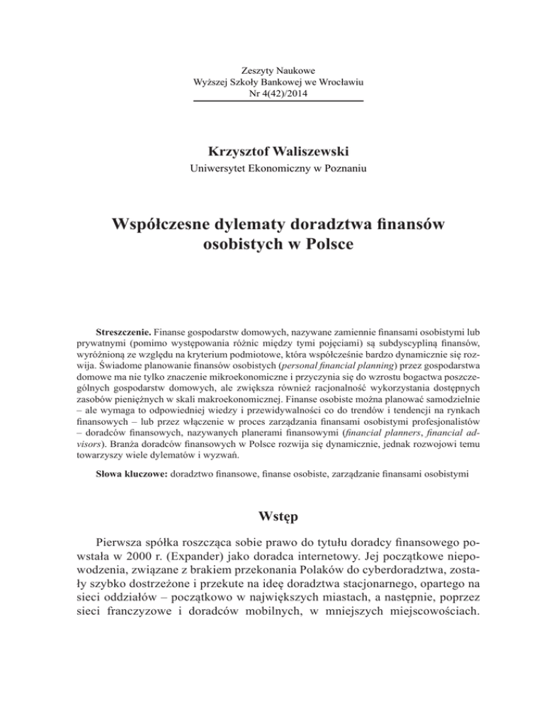 Zeszyty Naukowe Wyższej Szkoły Bankowej we Wrocławiu Nr 4(42)/2014 Krzysztof Waliszewski Uniwersytet Ekonomiczny w Poznaniu Współczesne dylematy doradztwa finansów osobistych w Polsce Streszczenie. Finanse gospodarstw domowych, nazywane zamiennie finansami osobistymi lub prywatnymi (pomimo występowania różnic między tymi pojęciami) są subdyscypliną finansów, wyróżnioną ze względu na kryterium podmiotowe, która współcześnie bardzo dynamicznie się rozwija. Świadome planowanie finansów osobistych (personal financial planning) przez gospodarstwa domowe ma nie tylko znaczenie mikroekonomiczne i przyczynia się do wzrostu bogactwa poszczególnych gospodarstw domowych, ale zwiększa również racjonalność wykorzystania dostępnych zasobów pieniężnych w skali makroekonomicznej. Finanse osobiste można planować samodzielnie – ale wymaga to odpowiedniej wiedzy i przewidywalności co do trendów i tendencji na rynkach finansowych – lub przez włączenie w proces zarządzania finansami osobistymi profesjonalistów – doradców finansowych, nazywanych planerami finansowymi (financial planners, financial advisors). Branża doradców finansowych w Polsce rozwija się dynamicznie, jednak rozwojowi temu towarzyszy wiele dylematów i wyzwań. Słowa kluczowe: doradztwo finansowe, finanse osobiste, zarządzanie finansami osobistymi Wstęp Pierwsza spółka roszcząca sobie prawo do tytułu doradcy finansowego powstała w 2000 r. (Expander) jako doradca internetowy. Jej początkowe niepowodzenia, związane z brakiem przekonania Polaków do cyberdoradztwa, zostały szybko dostrzeżone i przekute na ideę doradztwa stacjonarnego, opartego na sieci oddziałów – początkowo w największych miastach, a następnie, poprzez sieci franczyzowe i doradców mobilnych, w mniejszych miejscowościach. 194 Krzysztof Waliszewski Oznaczało to początek młodego segmentu rynku finansowego – branży doradców finansowych. Sukcesy pierwszych spółek, takich jak Open Finance, Expander czy Dom Kredytowy Notus, dostrzegali inni przedsiębiorcy, tworząc kolejne spółki doradztwa finansowego (A-Z Finanse, Money Expert, Gold Finance, Doradcy24). Kryzys na rynku finansowym stał się weryfikatorem siły i stabilności poszczególnych spółek doradztwa oraz realności ich strategii działania. Część spółek upadła, część połączyła się z silniejszymi partnerami z korzyścią dla wzmocnienia branży. 1. Finanse osobiste jako subdyscyplina finansów Finanse, rozumiane jako ogół zjawisk i procesów związanych z gromadzeniem, podziałem i wydatkowaniem środków pieniężnych będących w dyspozycji prywatnych (finanse prywatne) i publicznych podmiotów (finanse publiczne), ze względu na kryterium podmiotowe dzielą się na kilka subdyscyplin. W ramach finansów prywatnych wyróżniamy: finanse przedsiębiorstw, finanse banków i innych pośredników finansowych, finanse ubezpieczeń gospodarczych oraz finanse gospodarstw domowych. Jeszcze do niedawna ostatniej z subdyscyplin poświęcano stosunkowo najmniej uwagi – co widać chociażby po liczbie publikacji na ten temat w porównaniu z innymi subdyscyplinami finansów. Obecnie jednak sytuacja w tym zakresie ulega zmianie, a finansom osobistym poświęca się prace naukowe1. W ramach finansów gospodarstw domowych wprowadza się dodatkowe podsubdyscypliny oraz tworzy nowe określenia, takie jak finanse behawioralne czy nanofinanse2, czyli finanse codzienności. Finanse osobiste obejmują procesy związane z gromadzeniem środków pieniężnych przez gospodarstwa domowe z różnych źródeł (praca najemna, samozatrudnienie, zyski kapitałowe, dochody z najmu, inne), ich podziałem na konsumpcję bieżącą i przyszłą (inwestycje) oraz wydatkowaniem. Decyzje w ramach finansów osobistych dotyczą co najmniej następujących kwestii: – jaką część dochodu rozporządzalnego przeznaczyć na konsumpcję bieżącą, a jaką na przyszłą (oszczędności) (decyzje konsumpcja-oszczędności), 1 Por. prace habilitacyjne: S. Smyczek, Modele zachowań konsumentów na rynku usług finansowych, AE w Katowicach, 2008; B. Świecka, Niewypłacalność gospodarstw domowych. Przyczyny – skutki – przeciwdziałanie, Uniwersytet Szczeciński, 2010; D. Fatuła, Zachowania polskich gospodarstw domowych na rynku finansowym, UE w Krakowie, 2012. 2 Jak twierdzi J.K. Solarz, nanofinanse to jeden z 3 elementów nowego, pokryzysowego spojrzenia na analizę nauk o finansach – najbardziej elementarną analizę finansową, istniejącą obok megaekonomii i relacji wiążących makro- i mikroekonomię. Jest to analiza finansów codzienności. Codzienność to ta część zachowań gospodarstw domowych, która ma charakter przyzwyczajenia, naśladownictwa, mody – bez angażowania świadomego wyboru i woli jednostki. Więcej zob. także J.S. Solarz, Nanofinase. Codzienność zmienia świat, CH Beck, Warszawa 2012. Współczesne dylematy doradztwa finansów osobistych w Polsce 195 – jaka powinna być struktura posiadanych oszczędności w odniesieniu do poziomu ryzyka, płynności i rentowności (stopy zwrotu)3 (decyzje inwestycyjne), – jak zarządzać posiadanym długiem i jak zaciągać nowy dług (decyzje kredytowe), – jak zabezpieczyć posiadany majątek, zdrowie i życie przed ryzykiem (decyzje ubezpieczeniowe), – jak zabezpieczyć swoją przyszłość na starość (decyzje emerytalne), – jak zabezpieczyć bieżącą płynność gospodarstwa domowego, czyli możliwość regulowania bieżących zobowiązań (decyzje płynnościowe). Odpowiedzi na te pytania są konieczne, aby próbować optymalizować finanse osobiste. Wymagają one jednak rozeznania członków gospodarstwa domowego w dostępnych instrumentach rynku finansowego oraz ofertach banków, ubezpieczycieli, funduszy inwestycyjnych i emerytalnych, a także przewidywaniach i przyszłych trendach na rynkach finansowych. Zasadnicze znaczenie ma jednak świadomość co do koniecz