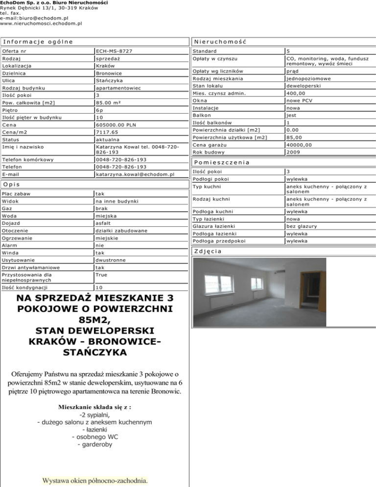 EchoDom Sp. z o.o. Biuro Nieruchomości Rynek Dębnicki 13/1, 30-319 Kraków tel. fax. e-mail:[email protected] www.nieruchomosci.echodom.pl Informacje ogólne Nieruchomość Oferta nr ECH-MS-8727 Standard 5 Rodzaj sprzedaż Opłaty w czynszu Lokalizacja Kraków CO, monitoring, woda, fundusz remontowy, wywóz śmieci Dzielnica Bronowice Opłaty wg liczników prąd Stańczyka Rodzaj mieszkania jednopoziomowe Rodzaj budynku apartamentowiec Stan lokalu deweloperski Ilość pokoi 3 Mies. czynsz admin. 400,00 85.00 m² Okna nowe PCV 6p Instalacje nowa 10 Balkon jest 605000.00 PLN Ilość balkonów 1 Cena/m2 7117.65 Powierzchnia działki [m2] 0.00 Status aktualna Powierzchnia użytkowa [m2] 85,00 Katarzyna Kowal tel. 0048-720826-193 Cena garażu 40000,00 Rok budowy 2009 Ulica Pow. całkowita [m2] Piętro Ilość pięter w budynku Cena Imię i nazwisko Telefon komórkowy 0048-720-826-193 Telefon 0048-720-826-193 E-mail [email protected] Opis Plac zabaw tak Widok na inne budynki Gaz brak Woda miejska Dojazd asfalt Otoczenie działki zabudowane Ogrzewanie miejskie Alarm nie Winda tak Usytuowanie dwustronne Drzwi antywłamaniowe tak Przystosowania dla niepełnosprawnych True Ilość kondygnacji 10 NA SPRZEDAŻ MIESZKANIE 3 POKOJOWE O POWIERZCHNI 85M2, STAN DEWELOPERSKI KRAKÓW - BRONOWICESTAŃCZYKA Oferujemy Państwu na sprzedaż mieszkanie 3 pokojowe o powierzchni 85m2 w stanie deweloperskim, usytuowane na 6 piętrze 10 piętrowego apartamentowca na terenie Bronowic. Mieszkanie składa się z : -2 sypialni, - dużego salonu z aneksem kuchennym - łazienki - osobnego WC - garderoby Wystawa okien północno-zachodnia. Pomieszczenia Ilość pokoi 3 Podłogi pokoi wylewka Typ kuchni aneks kuchenny - połączony z salonem Rodzaj kuchni aneks kuchenny - połączony z salonem Podłoga kuchni wylewka Typ łazienki nowa Glazura łazienki bez glazury Podłoga łazienki wylewka Podłoga przedpokoi wylewka Zdjęcia Czynsz wynosi ok 520zł -ogrzewanie jak i ciepła woda pochodzą z MPEC – sieci miejskiej, najbardziej ekonomiczna forma ogrzewania). Lokalizacja i inwestycja: - inwestycja zlokalizowana jest w północno – zachodniej części Krakowa przy ul. Stańczyka - niewielka odległość inwestycji od Parku Jordana, obfitującego w liczne atrakcje zarówno dla dzieci jak i dorosłych oraz Błoń Krakowskich - dostęp do licznych linii tramwajowych umożliwiających dotarcie do centrum Krakowa w zaledwie 15 minut - w pobliżu centra handlowe min. Galeria Bronowice, Makro oraz Ikea Serdecznie polecam i zapraszam na prezentację nieruchomości! Więcej ofert na EchoDom.pl! BIURO NIERUCHOMOŚCI EchoDom Sp. z o.o.- szeroki wybór ofert. Kompleksowa obsługa przy sprzedaży, wynajmie nieruchomości. Atrakcyjne propozycje kredytowe, sporządzane wedle potrzeb Klientów. ZAPEWNIAMY PROFESJONALIZM I BEZPIECZEŃSTWO ZAWIERANYCH TRANSAKCJI! © Wszelkie prawa zastrzeżone - EchoDom