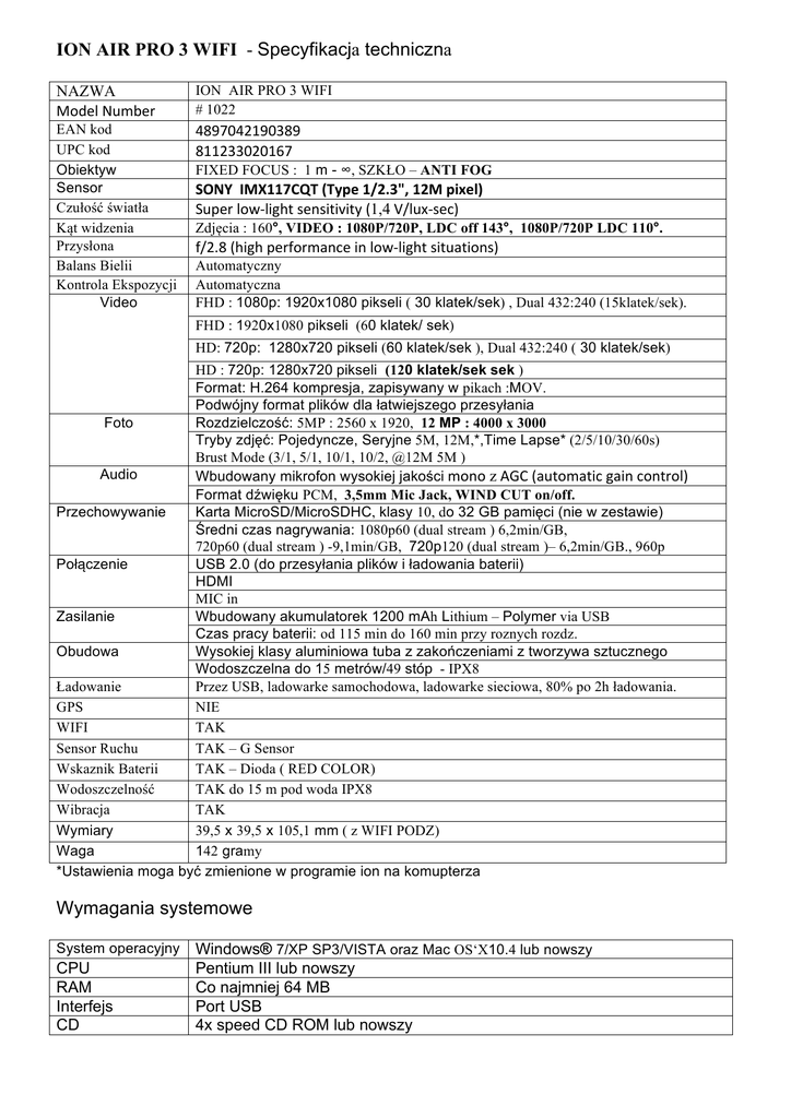 ION AIR PRO 3 WIFI - Specyfikacja techniczna NAZWA Model Number ION AIR PRO 3 WIFI # 1022 EAN kod UPC kod Obiektyw Sensor Czułość światła Kąt widzenia Przysłona Balans Bielii Kontrola Ekspozycji Video 4897042190389 811233020167 FIXED FOCUS : 1 m - ∞, SZKŁO – ANTI FOG SONY IMX117CQT (Type 1/2.3", 12M pixel) Super low-‐light sensitivity (1,4 V/lux-‐sec) Zdjęcia : 160°, VIDEO : 1080P/720P, LDC off 143°, 1080P/720P LDC 110°. f/2.8 (high performance in low-‐light situations) Automatyczny Automatyczna FHD : 1080p: 1920x1080 pikseli ( 30 klatek/sek) , Dual 432:240 (15klatek/sek). FHD : 1920x1080 pikseli (60 klatek/ sek) HD: 720p: 1280x720 pikseli (60 klatek/sek ), Dual 432:240 ( 30 klatek/sek) HD : 720p: 1280x720 pikseli (120 klatek/sek sek ) Format: H.264 kompresja, zapisywany w pikach :MOV. Podwójny format plików dla łatwiejszego przesyłania Foto Rozdzielczość: 5MP : 2560 x 1920, 12 MP : 4000 x 3000 Tryby zdjęć: Pojedyncze, Seryjne 5M, 12M,*,Time Lapse* (2/5/10/30/60s) Brust Mode (3/1, 5/1, 10/1, 10/2, @12M 5M ) Audio Wbudowany mikrofon wysokiej jakości mono z AGC (automatic gain control) Format dźwięku PCM, 3,5mm Mic Jack, WIND CUT on/off. Przechowywanie Karta MicroSD/MicroSDHC, klasy 10, do 32 GB pamięci (nie w zestawie) Średni czas nagrywania: 1080p60 (dual stream ) 6,2min/GB, 720p60 (dual stream ) -9,1min/GB, 720p120 (dual stream )– 6,2min/GB., 960p Połączenie USB 2.0 (do przesyłania plików i ładowania baterii) HDMI MIC in Zasilanie Wbudowany akumulatorek 1200 mAh Lithium – Polymer via USB Czas pracy baterii: od 115 min do 160 min przy roznych rozdz. Obudowa Wysokiej klasy aluminiowa tuba z zakończeniami z tworzywa sztucznego Wodoszczelna do 15 metrów/49 stóp - IPX8 Ładowanie Przez USB, ladowarke samochodowa, ladowarke sieciowa, 80% po 2h ładowania. GPS NIE WIFI TAK Sensor Ruchu TAK – G Sensor Wskaznik Baterii TAK – Dioda ( RED COLOR) Wodoszczelność TAK do 15 m pod woda IPX8 Wibracja TAK Wymiary 39,5 x 39,5 x 105,1 mm ( z WIFI PODZ) Waga 142 gramy *Ustawienia moga być zmienione w programie ion na komupterza Wymagania systemowe System operacyjny CPU RAM Interfejs CD Windows® 7/XP SP3/VISTA oraz Mac OS‘X10.4 lub nowszy Pentium III lub nowszy Co najmniej 64 MB Port USB 4x speed CD ROM lub nowszy W ZESTAWIE AKCESORIA Aluminiowe pudełko do przechowywania kamery i akcesoriów Kabel USB/mikro USB – przesyłanie danych i ładowanie przez port USB Ładowarka sieciowa USB WIFI PODZ Mały statyw trójnóg – Tripod. Pokrowiec na kamerę CD-rom Linka zabezpieczjaca kamerę CamLOCK – uniwerslany uchwyt ION CamLOCK Key – kluczyk do CamLocka Ball Jointy short - uchwyt do kamery Helment mount – uchwy na kask Nalepki dwustronne 3M do uchwytu na kask z 2 Instrukcja obsługi Karta gwarancyjna Karta Mimedia – do zalozenia konta w Chmurze Nalepka ION