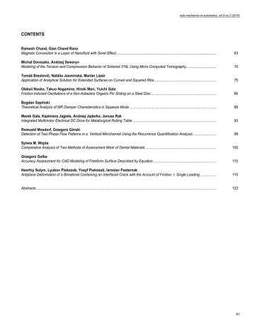 acta mechanica et automatica, vol.9 no.2 (2015) CONTENTS Ramesh Chand, Gian Chand Rana Magneto Convection in a Layer of Nanofluid with Soret Effect ....................................................................................................... 63 Michał Doroszko, Andrzej Seweryn Modeling of the Tension and Compression Behavior of Sintered 316L Using Micro Computed Tomography ............................... 70 Tomáš Brestovič, Natália Jasminská, Marián Lázár Application of Analytical Solution for Extended Surfaces on Curved and Squared Ribs ................................................................ 75 Oleksii Nosko, Takuo Nagamine, Hiroki Mori, Yuichi Sato Friction-Induced Oscillations of a Non-Asbestos Organic Pin Sliding on a Steel Disc ................................................................... 84 Bogdan Sapiński Theoretical Analysis of MR Damper Characteristics in Squeeze Mode ......................................................................................... 89 Marek Gała, Kazimierz Jagieła, Andrzej Jąderko, Janusz Rak Integrated Multimotor Electrical DC Drive for Metallurgical Rolling Table ...................................................................................... 93 Romuald Mosdorf, Grzegorz Górski Detection of Two-Phase Flow Patterns in a Vertical Minichannel Using the Recurrence Quantification Analysis ........................ 99 Sylwia M. Wojda Comparative Analysis of Two Methods of Assessment Wear of Dental Materials ......................................................................... 105 Grzegorz Golba Accuracy Assessment for CAD Modeling of Freeform Surface Described by Equation ................................................................. 110 Heorhiy Sulym, Lyubov Piskozub, Yosyf Piskozub, Iaroslav Pasternak Antiplane Deformation of a Bimaterial Containing an Interfacial Crack with the Account of Friction. I. Single Loading ................. 115 Abstracts ......................................................................................................................................................................................... 123 61