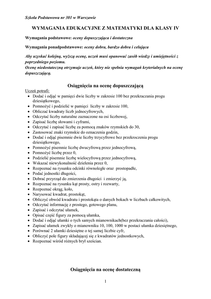 Szkoła Podstawowa nr 301 w Warszawie WYMAGANIA EDUKACYJNE Z MATEMATYKI DLA KLASY IV Wymagania podstawowe: oceny dopuszczająca i dostateczna Wymagania ponadpodstawowe: oceny dobra, bardzo dobra i celująca Aby uzyskać kolejną, wyższą ocenę, uczeń musi opanować zasób wiedzy i umiejętności z poprzedniego poziomu. Ocenę niedostateczną otrzymuje uczeń, który nie spełnia wymagań kryterialnych na ocenę dopuszczającą. Osiągnięcia na ocenę dopuszczającą Uczeń potrafi: Dodać i odjąć w pamięci dwie liczby w zakresie 100 bez przekraczania progu dziesiątkowego, Pomnożyć i podzielić w pamięci liczby w zakresie 100, Obliczać kwadraty liczb jednocyfrowych, Odczytać liczby naturalne zaznaczone na osi liczbowej, Zapisać liczbę słowami i cyframi, Odczytać i zapisać liczbę za pomocą znaków rzymskich do 30, Zastosować znaki rzymskie do oznaczenia godzin, Dodać i odjąć pisemnie dwie liczby trzycyfrowe bez przekroczenia progu dziesiątkowego, Pomnożyć pisemnie liczbę dwucyfrową przez jednocyfrową, Pomnożyć liczbę przez 0, Podzielić pisemnie liczbę wielocyfrową przez jednocyfrową, Wskazać niewykonalność dzielenia przez 0, Rozpoznać na rysunku odcinki równoległe oraz prostopadłe, Podać jednostki długości, Dobrać przyrząd do zmierzenia długości i zmierzyć ją, Rozpoznać na rysunku kąt prosty, ostry i rozwarty, Rozpoznać okrąg, koło, Narysować kwadrat, prostokąt, Obliczyć obwód kwadratu i prostokąta o danych bokach w liczbach całkowitych, Odczytać informację z prostego, gotowego planu, Zapisać i odczytać ułamek, Opisać część figury za pomocą ułamka, Dodać i odjąć ułamki o tych samych mianownikach(bez przekraczania całości), Zapisać ułamek zwykły o mianowniku 10, 100, 1000 w postaci ułamka dziesiętnego, Porównać 2 ułamki dziesiętne o tej samej liczbie cyfr, Obliczyć pole figury składającej się z kwadratów jednostkowych, Rozpoznać wśród różnych brył sześcian. Osiągnięcia na ocenę dostateczną 1 Szkoła Podstawowa nr 301 w Warszawie Uczeń potrafi: Dodać i odjąć w pamięci dwie liczby dwucyfrowe bez przekraczania progu dziesiątkowego, Sprawdzić poprawność odejmowania (za pomocą dodawania), Pomnożyć i podzielić w pamięci liczbę dwucyfrową przez jednocyfrową. Rozwiązać i układać zadania tekstowe jednodziałaniowe, Wykonywać dzielenie z resztą liczby dwucyfrowej przez jednocyfrową, Obliczać kwadraty liczb jednocyfrowych, Zaznaczyć liczby naturalne na osi liczbowej, zgodnie z daną jednostką, Zbudować liczbę naturalną na podstawie informacji o jej cyfrach, Pomnożyć liczbę naturalną przez 10,100,1000, Dodać i odjąć pisemnie dwie liczby trzycyfrowe, Pomnożyć pisemnie liczbę trzycyfrową przez dwucyfrową, Narysować odcinki równoległe i prostopadłe za pomocą ekierki i linijki, Narysować odcinki o podanej długości, Zamienić jednostki długości (z większej na mniejszą), Narysować kąt o podanej mierze i zmierzyć narysowany kąt (w zakresie kąta półpełnego), Narysować kwadrat i prostokąt o podanych wymiarach, Na rysunku okręgu rozpoznaje środek, promień i średnicę okręgu, Narysować okręgu o danym środku i promieniu, Podać różnice pomiędzy kołem a okręgiem, Narysować odcinki w skali 1: 1, 1 : 2, 2 : 1, Porównać dwa ułamki o tych samych mianownikach, Odróżniać ułamek właściwy i niewłaściwy, Wyłączyć całości z ułamka niewłaściwego, Zapisać ułamek dziesiętny w postaci ułamka zwykłego skróconego, Dodać lub odjąć dwa wyrażenia dwumianowane bez przekroczenia progu dziesiątkowego, Zamienić jednostki (np.: kg na dag, kg na g), Obliczyć pole prostokąta o danych bokach, Narysować siatkę sześcianu, Obliczyć pole powierzchni sześcianu. Osiągnięcia na ocenę dobrą Uczeń potrafi: Dodać i odjąć w pamięci liczby dwucyfrowe z przekraczaniem progu dziesiątkowego, Obliczać kwadraty i sześciany liczb naturalnych, Wykonać obliczenia w pamięci uwzględniając właściwą kolejność działań, Rozwiązywać i układać zadania tekstowe wielodziałaniowe, Ustalić jednostkę na osi liczbowej na podstawie danych liczb, Porównać i uporządkować liczby naturalne, Zapisywać i odczytywać liczby naturalne w systemie rzymskim do 4000, Pomnożyć i podzielić pisemnie liczby wielocyfrowe przez dwucyfrowe, Narysować prostą figurę na podstawie jej opisu, Zamieniać jednostki długości dwumianowane, podając je w zapisie dziesiętnym, Opisać własności kwadratu, prostokąta i koła, Obliczyć obwód podanej figury, 2 Szkoła Podstawowa nr 301 w Warszawie Narysować prostokąt w danej skali, Obliczyć rzeczywistą długość odcinków na podstawie skali, Porównać dwa ułamki o tych samych licznikach, Zamienić liczbę mieszaną na ułamek i odwrotnie, Zapisać ułamek zwykły o mianowniku: 2, 4, 5, 25 na ułamek dziesiętny, Wykonać odejmowanie liczb mieszanych , gdy ułamek w odjemnej jest mniejszy niż w odjemniku, Pomnożyć liczbę mieszaną przez liczbę naturalną, Dodać lub odjąć wyrażenia dwumianowane z przekroczeniem progu dziesiątkowego, Dodać lub odjąć ułamki dziesiętne o różnych mianownikach, Obliczyć pole podanej figury, Opisać własności danego sześcianu i prostopadłościanu, Narysować siatkę prostopadłościanu. Osiągnięcia na ocenę bardzo dobrą Uczeń potrafi: Zastosować własności działań do szybkiego wykonywania rachunków, Rozwiązywać trudne zadania tekstowe wielodziałaniowe, Zapisywać i odczytywać liczby do miliarda, Podać za pomocą znaków rzymskich wiek, Podzielić pisemnie liczby wielocyfrowe z występowaniem cyfry 0 w ilorazie, Wykonać pisemnie obliczenia, w których występują więcej niż dwa działania, Układać działania do zadań tekstowych oraz stosując kolejność działań, rozwiązać je, Obliczyć skalę, gdy podane są wymiary oraz podać wymiary w innej skali, Zaznaczyć na osi liczbowej ułamki, dobrać jednostkę, Obliczyć