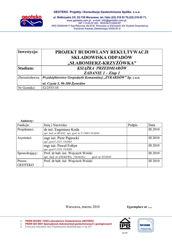 GEOTEKO Projekty i Konsultacje Geotechniczne Spółka z o.o. ul. Wałbrzyska 3/5, 02-739 Warszawa, tel./ faks (22) 218 93 70,(22) 218 93 71, www.geoteko.com.pl, e-mail: [email protected], NIP 113-00-07-283, REGON 012558187, KRS 0000204617 Sąd Rejonowy dla M.St. Warszawy w Warszawie XIII Wydział Gospodarczy Wysokość Kapitału Zakładowego 50000,00 zł Inwestycja: PROJEKT BUDOWLANY REKULTYWACJI SKŁADOWISKA ODPADÓW „SŁABOMIERZ-KRZYśÓWKA” KSIĄśKA PRZEDMIARÓW ZADANIE 1 – Etap 1 Stadium: Zleceniodawca: Przedsiębiorstwo Gospodarki Komunalnej „śYRARDÓW” Sp. z o.o. Nr Geoteko: Autorzy: Funkcja: Projektanci: ul. Czysta 5, 96-300 śyrardów 52/2553/10 Imię i Nazwisko Podpis dr inŜ. Eugeniusz Koda Data III 2010 upr. bud. nr Bł-8/92, upr. geol. nr V-1300 i VI-0343 Asystenci: III 2010 mgr inŜ. Piotr Paprocki upr. geol.V-1527, VI-0363 III 2010 mgr inŜ. Paweł Fołtyn upr. geol.V-1525, VI-0389 Sprawdzający: Prof. dr hab. inŜ. Wojciech Wolski upr. bud. nr 450/64/Ww, 726/66/Ww; Prezes GEOTEKO Prof. dr hab. inŜ. Wojciech Wolski Warszawa, marzec 2010 • • • III 2010 geol. nr VI-0345 III 2010 Egzemplarz nr ..... PN/EN ISO/IEC 17025 Laboratorium Geotechniczne GEOTEKO PN/EN ISO 9001 Sporządzanie dokumentacji geotechnicznych i geologicznych Firma jest członkiem Izby Projektowania Budowlanego nr rej 237 Nr 237 GEOTEKO Sp. z o.o. ul. Wałbrzyska 3/5, 02-739 Warszawa KSIĄŻKA PRZEDMIARÓW 45100000-8 45112330-7 Klasyfikacja robót wg. Wspólnego Słownika Zamówień Przygotowanie terenu pod budowę Rekultywacja terenu NAZWA INWESTYCJI : INWESTOR : ADRES INWESTORA BRANŻA : : PROJEKT BUDOWLANY REKULTYWACJI SKŁADOWISKA ODPADÓW "SŁABOMIERZ - KRZYŻÓWKA" - Zad. I, ETAP I Przedsiębiorstwo Gospodarki Komunalnej "ŻYRARDÓW" Sp. z o.o. ul. Czysta 5 , 96-300 Żyrardów sanitarna, roboty inżynieryjne i ziemne SPORZĄDZIŁ PRZEDMIAR : DATA OPRACOWANIA : mgr inż. Paweł Fołtyn 14.03.2010 WYKONAWCA : INWESTOR : Data opracowania 14.03.2010 Data zatwierdzenia Dokument został opracowany przy pomocy programu NORMA PRO OGÓLNA CHARAKTERYSTYKA OBIEKTU 1. INWESTOR: Przedsiębiorstwo Gospodarki Komunalnej "ŻYRARDÓW" Sp. z o.o. ul. Czysta 5, 96-300 Żyrardów 2. OBIEKT: REKULTYWACJA SKŁADOWISKA ODPADÓW "SŁABOMIERZ-KRZYŻÓWKA" 3. CZĘŚĆ: ZADANIE NR I - Przesłona przeciefiltracyjna wraz z drogą technologiczną wokół składowiska. Zadanie I, ETAP I 4. ZAKRES ROBÓT: roboty inżynieryjne i ziemne 5. PODSTAWA OPRACOWANIA 5.1. Projekt budowlany 5.2. Rozporządzenie Ministra Infrastruktury z dnia 18 maja 2004 r. w sprawie określenia metod i podstaw sporządzania kosztorysu inwestorskiego, obliczania planowanych kosztów prac projektowych oraz planowanych kosztów robót budowlanych określonych w programie unkcjonalno-użytkowym (Dz.U.04.130.1389 z dnia 8 czerwca 2004 r.). 5.3. Rozporządzenie Ministra Infrastruktury z dnia 2 września 2004 r. w sprawie zakresu form dokumentacji projektowej, specyfikacji technicznych wykonania i odbioru robót budowlanych oraz programu funkcjonalno - użytkowego (Wspólny Słownik Zamówień CPV) 5.4. Zakres rzeczowy - wg KNNR, KNR 6. ZAKRES ROBÓT WRAZ Z KODAMI CPV CPV: 45100000-8 Przygotowanie terenu pod budowę 45222110-3 Rekultywacja składowiska Warszawa 2010r. -2Norma PRO Wersja 4.28 Licencja: 20863 Zagospodarowanie odcieków - zad 1, ETAP I PRZEDMIAR Lp. Podstawa Opis i wyliczenia j.m. Poszcz Razem 1 DROGA TECHNOLOGOCZNA WOKÓŁ SKŁADOWISKA (Odcinek od A przez R,Q, P,O do N) 1.1 KNR 2-01 Roboty pomiarowe przy liniowych robotach ziemnych km 0119-03 trasa drogi w terenie równinnym 0.71+0.04 km 0.75 RAZEM 0.75 1.2 KNR 2-01 Mechaniczne karczowanie średniej gęstości krzaków i ha 0108-05 podszycia 0.20 ha 0.20 RAZEM 0.20 1.3 KNR 2-01 Przemieszczenie spycharkami mas ziemnych na odm3 0229-02 ległość do 10 m w gruncie kat. III 23*0.8*0.5*5 m3 46.00 RAZEM 46.00 1.4 KNR 2-01 Przemieszczenie spycharkami mas ziemnych w grunm3 0229-08 cie kat. III - dodatek za każde rozpoczęte 10 m w przedziale ponad 30 do 60 m 23*0.8*0.5*5 m3 46.00 RAZEM 46.00 1.5 KNR 2-01 Mechaniczne plantowanie terenu spycharkami gąsiem2 0233-05 nicowymi o mocy 74 kW (100 KM) w gruncie kat. III 708*5+40*4 m2 3700.00 RAZEM 3700.00 1.6 KNR 2-01 Zagęszczanie nasypów walcami samojezdnymi wibram3 0237-08 cyjnymi; grunt spoisty kat. III-IV (zagęszczenie podbudowy i korpusu drogi) 708*4*0.5+40*4*0.5 m3 1496.00 RAZEM 1496.00 1.7 KNR 2-01 Mechaniczne plantowanie terenu spycharkami gąsiem2 0233-04 nicowymi o mocy 74 kW (100 KM) w gruncie kat. I-II (plantowanie podsypki filtracyjnej) 708*4+40*4 m2 2992.00 RAZEM 2992.00 1.8 KNR 2-25 Nawierzchnie z płyt żelbetowych pełnych - wykonanie m2 0408-02 podsypki piaskowej grubości 30cm 708*4+40*4 m2 2992.00 RAZEM 2992.00 1.9 KNR 2-25 Nawierzchnie z płyt żelbetowych pełnych (płyty o pom2 0408-03 wierzchni do 3 m2) - budowa drogi i mijanek z płyt MON grubości 20cm) 708*3+40*3 m2 2244.00 RAZEM 2244.00 1.1 KNR 2-25 Nawierzchnie z płyt żelbetowych pełnych (płyty o pom2 0 0408-03 wierzchni do 3 m2) - wymiana 10% uszkodzonych płyt podczas wykonywania przesłony) 2244*0.1 m2 224.40 RAZEM 224.40 1.1 KNR 2-01 Formowanie i zagęszczanie nasypów o wys. do 3.0 m m3 1 0235-02 spycharkami w gruncie kat. III-IV (wykonanie poboczy z wcześniej dostarczonego kruszywa lub gruzu) 708*1.5*0.5+40*1*0.5 m3 551.00 RAZEM 551.00 -3Norma PRO Wersja 4.28 Licencja: 20863 Zagospodarowanie odcieków - zad 1, ETAP I PRZEDMIAR Lp. Podstawa Opis i wyliczenia j.m. Poszcz Razem 2 PRZESŁONA PRZECIWFILTRACYJNA (Odcinek od A przez R,Q,P,O do N) 2.1 KNR 2-01 Roboty pomiarowe przy liniowych robotach ziemnych km 0119-03 trasa drogi w terenie równinnym analogia (wytyczenie trasy przesłony przeciwfiltracyjnej) 0.71 km 0.71 RAZEM 0.71 2.2 KNR 2-01 Mechaniczne plantowanie terenu spycharkami gąsiem2 0233-05 nicowymi o mocy 74 kW (100 KM) w gruncie kat. III (Przygotowanie terenu pod zaplecze oraz wyrównanie podłoża w trasie przesłony) 710*3+30*35 m2 3180.00 RAZEM