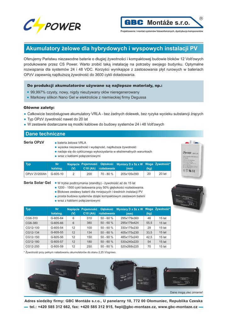 Montáže s.r.o. Projektowanie i montaz systemów fotowoltaicznych, dystrybucja komponentów Akumulatory żelowe dla hybrydowych i wyspowych instalacji PV Oferujemy Państwu niezawodne baterie o długiej żywotności i kompaktowej budowie bloków 12 Volt'owych produkowane przez CS Power. Warto zrobić taką instalację na potrzeby swojego budynku. Optymalne rozwiązania dla systemów 24 i 48 VDC. Korzyści wynikające z zastosowania płyt rurowych w bateriach OPzV zapewnią najdłuższą żywotność do 3600 cykli doładowania. Do produkcji akumulatorów używane są najlepsze materiały, np.: 99,997% czysty, nowy, nigdy nieużywany ołów nieregenerowany Markowy silikon Nano Gel w elektrolicie z niemieckiej firmy Degussa Główne zalety: Całkowicie bezobsługowe akumulatory VRLA - bez żadnych dolewek, bez ryzyka wycieku substancji żrących Typ OPzV żywotność nawet do 20 lat W zestawie dostarczane są mostki kablowe do budowy systemów 24 i 48 Volt'owych Dane techniczne Seria OPzV bateria żelowa VRLA wysoka niezawodność i wydajność, najdłuższa żywotność nadaje się do cyklicznego wykorzystania w ekstremalnych warunkach wraz z kablami połączeniowymi Typ Nr katalog. OPzV 2V200Ah G-605-10 Seria Solar Gel Napięcie Pojemność Głębokość Wymiary D x Sz x W Waga Żywotność* (kg) C10 (Ah) rozładowania (V) (mm) 2 200 70 - 80 % 205x105x390 20 20 lat W trybie podtrzymania (standby) - żywotność aż do 15 lat 1200 - 1500 cykli ładowania przy 50% głębokości rozładowania. Blokowe zestawy baterii dla mniejszych i średnich instalacji PV prosta budowa systemów dzięki kompaktowym zestawom baterii wraz z kablami połączeniowymi Typ Nr katalog. CG6-310 G-605-64 6 310 50 - 60 % 295x179x360 46 15 lat CG6-380 G-605-66 6 380 50 - 60 % 295x179x424 55,5 15 lat CG12-100 G-605-54 12 100 50 - 60 % 330x175x230 29 15 lat CG12-134 G-605-55 12 134 50 - 60 % 405x175x230 33,5 15 lat CG12-150 G-605-56 12 150 50 - 60 % 485x175x240 42,5 15 lat CG12-180 G-605-57 12 180 50 - 60 % 530x240x220 54 15 lat CG12-250 G-605-59 12 250 50 - 60 % 520x268x225 70 15 lat Napięcie Pojemność Głębokość Wymiary D x Sz x W Waga Żywotność* (kg) C10 (Ah) rozładowania (V) (mm) * Żywotność przy pełnym naładowaniu akumulatorów do stanu 2,25 V/ogniwo. Dane mogą ulec zmianie! Adres siedziby firmy: GBC Montáže s.r.o., U panelarny 10, 772 00 Ołomuniec, Republika Czeska tel.: +420 585 312 662, fax: +420 585 312 915, [email protected], www.gbc-montaze.cz