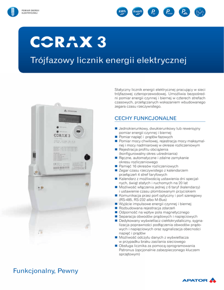 Pomiar energii elektrycznej kWh kvarh P (t) P max P I U f Trójfazowy licznik energii elektrycznej Statyczny licznik energii elektrycznej pracujący w sieci trójfazowej czteroprzewodowej. Umożliwia bezpośredni pomiar energii czynnej i biernej w czterech strefach czasowych, przełączanych wskazaniem wbudowanego zegara czasu rzeczywistego. Cechy funkcjonalne Jednokierunkowy, dwukierunkowy lub rewersyjny pomiar energii czynnej i biernej Pomiar napięć i prądów fazowych Pomiar mocy chwilowej, rejestracja mocy maksymalnej i mocy nadmiarowej w okresie rozliczeniowym Rejestracja profilu obciążenia (konfigurowalny okres uśredniania) Ręczne, automatyczne i zdalne zamykanie okresu rozliczeniowego Pamięć 16 okresów rozliczeniowych Zegar czasu rzeczywistego z kalendarzem przełączeń 4 stref taryfowych Kalendarz z możliwością ustawienia dni specjalnych, świąt stałych i ruchomych na 20 lat Możliwość włączenia jednej z 6 taryf (kalendarzy) i ustawienie czasu plombowanym przyciskiem Komunikacja przez port optyczny i port szeregowy (RS-485, RS-232 albo M-Bus) Wyjście impulsowe energii czynnej i biernej Rozbudowana rejestracja zdarzeń Odporność na wpływ pola magnetycznego Separacja obwodów prądowych i napięciowych Dedykowany wyświetlacz ciekłokrystaliczny, sygnalizacja poprawności podłączenia obwodów prądowych i napięciowych oraz sygnalizacja obecności napięć i prądów Możliwość odczytu danych z wyświetlacza w przypadku braku zasilania sieciowego Obsługa licznika za pomocą oprogramowania Patronus (opcjonalnie zabezpieczonego kluczem sprzętowym) Funkcjonalny, Pewny Od pomiarów do zarządzania informacją Dane techniczne CORAX 3 Model bezpośredni Sposób podłączenia Napięcie znamionowe Un [V] Prąd bazowy Iref [A] 3x230 / 400 5 lub 10 Prąd maksymalny Imax [A] 80 lub 100 lub 120 A lub B Klasa dokładności pomiaru en. czynnej 2 lub 3 Klasa dokładności pomiaru en. biernej Pobór mocy w torze prądowym (na fazę) Pobór mocy w torze napięciowym (na fazę) Wytrzymałość elektryczna izolacji Stałe impulsowania Zegar Komunikacja Wyjścia Rejestracja zdarzeń Wyświetlacz [VA] <0,01 [W] / [VA] <0,5 / <1,1 [kV] 4 (AC 50 Hz), 6 (udary 1,2/50 μs) [imp/kWh] typowo: 1500 Wewnętrzny, dokładność nie gorsza niż 0,5 s/24 h w temp. 23˚C, synchronizowany sygnałem zewnętrznym. Port optyczny; port szeregowy RS-485 lub RS-232, albo M-Bus. Prędkość transmisji konfigurowalna od 300 Bd do 9600 Bd. Obsługa protokołów PN-EN 62056-21 (IEC1107), DLMS (opcja). Wyjście impulsowe dla energii czynnej i dla energii biernej. Zamknięcie okresu rozliczeniowego, zanik i powrót zasilania, parametryzacja, zerowanie, zdjęcie osłony skrzynki zacisków, otwarcie obudowy, wraz z wartością rejestru energii, datą i czasem zdarzenia. Wpływ pola magnetycznego z czasem i datą zdarzenia, długością czasu ingerencji i pobranej w tym czasie energii. Czas pracy licznika bez zasilania sieciowego. LCD specjalizowany, 8 cyfr, dane opisane kodami OBIS (PN-EN 62056-61), dwie konfigurowalne listy komunikatów. od −40˚C do 70˚C Temperatura pracy IP 54 lub IP 55, II kl. ochronności Obudowa PN-EN 50470-1 PN-EN 50470-2 Normy Niniejsza publikacja ma charakter informacyjny i nie stanowi oferty w rozumieniu prawa cywilnego. Prezentowane wykonania są przykładowe i istnieje możliwość modyfikacji funkcjonalności licznika. Szczegółowe parametry liczników zawiera instrukcja z opisem technicznym. PL.00116 | 2012 www.apator.com