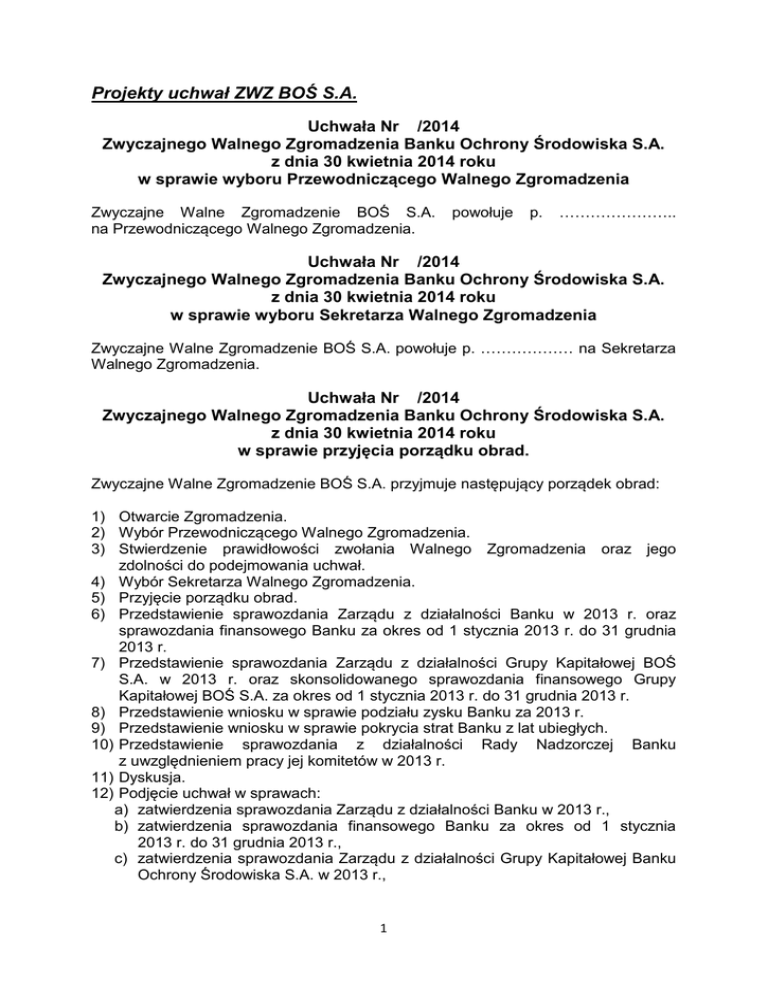 Projekty uchwał ZWZ BOŚ S.A. Uchwała Nr /2014 Zwyczajnego Walnego Zgromadzenia Banku Ochrony Środowiska S.A. z dnia 30 kwietnia 2014 roku w sprawie wyboru Przewodniczącego Walnego Zgromadzenia Zwyczajne Walne Zgromadzenie BOŚ S.A. na Przewodniczącego Walnego Zgromadzenia. powołuje p. .. Uchwała Nr /2014 Zwyczajnego Walnego Zgromadzenia Banku Ochrony Środowiska S.A. z dnia 30 kwietnia 2014 roku w sprawie wyboru Sekretarza Walnego Zgromadzenia Zwyczajne Walne Zgromadzenie BOŚ S.A. powołuje p. na Sekretarza Walnego Zgromadzenia. Uchwała Nr /2014 Zwyczajnego Walnego Zgromadzenia Banku Ochrony Środowiska S.A. z dnia 30 kwietnia 2014 roku w sprawie przyjęcia porządku obrad. Zwyczajne Walne Zgromadzenie BOŚ S.A. przyjmuje następujący porządek obrad: 1) Otwarcie Zgromadzenia. 2) Wybór Przewodniczącego Walnego Zgromadzenia. 3) Stwierdzenie prawidłowości zwołania Walnego Zgromadzenia oraz jego zdolności do podejmowania uchwał. 4) Wybór Sekretarza Walnego Zgromadzenia. 5) Przyjęcie porządku obrad. 6) Przedstawienie sprawozdania Zarządu z działalności Banku w 2013 r. oraz sprawozdania finansowego Banku za okres od 1 stycznia 2013 r. do 31 grudnia 2013 r. 7) Przedstawienie sprawozdania Zarządu z działalności Grupy Kapitałowej BOŚ S.A. w 2013 r. oraz skonsolidowanego sprawozdania finansowego Grupy Kapitałowej BOŚ S.A. za okres od 1 stycznia 2013 r. do 31 grudnia 2013 r. 8) Przedstawienie wniosku w sprawie podziału zysku Banku za 2013 r. 9) Przedstawienie wniosku w sprawie pokrycia strat Banku z lat ubiegłych. 10) Przedstawienie sprawozdania z działalności Rady Nadzorczej Banku z uwzględnieniem pracy jej komitetów w 2013 r. 11) Dyskusja. 12) Podjęcie uchwał w sprawach: a) zatwierdzenia sprawozdania Zarządu z działalności Banku w 2013 r., b) zatwierdzenia sprawozdania finansowego Banku za okres od 1 stycznia 2013 r. do 31 grudnia 2013 r., c) zatwierdzenia sprawozdania Zarządu z działalności Grupy Kapitałowej Banku Ochrony Środowiska S.A. w 2013 r., 1 d) zatwierdzenia skonsolidowanego sprawozdania finansowego Grupy Kapitałowej Banku Ochrony Środowiska S.A. za okres od 1 stycznia 2013 r. do 31 grudnia 2013 r., e) podziału zysku Banku za rok 2013, f) pokrycia strat Banku z lat ubiegłych, g) udzielenia absolutorium poszczególnym członkom Zarządu Banku z wykonania obowiązków w 2013 r., h) zatwierdzenia sprawozdania z działalności Rady Nadzorczej BOŚ S.A. z uwzględnieniem pracy jej komitetów w 2013 r., i) udzielenia absolutorium poszczególnym członkom Rady Nadzorczej Banku z wykonania obowiązków w 2013 r. 13) Przedstawienie projektu i podjęcie uchwały w sprawie ustalenia liczby członków Rady Nadzorczej. 14) Zmiany w składzie Rady Nadzorczej: a) podjęcie uchwał w sprawie odwołania członków Rady Nadzorczej, b) podjęcie uchwał w sprawie powołania członków Rady Nadzorczej. 15) Przedstawienie projektu i podjęcie uchwały w sprawie ustalenia wysokości wynagrodzeń członków Rady Nadzorczej Banku. 16) Przedstawienie projektów i podjęcie uchwał w sprawie zmian w Statucie Banku. 17) Przedstawienie projektu i podjęcie uchwały w sprawie upoważnienia Rady Nadzorczej do ustalenia tekstu jednolitego Statutu Banku. 18) Przedstawienie projektu i podjęcie uchwały w sprawie Programu odkupu akcji BOŚ S.A. w celu zaoferowania osobom zajmującym stanowiska kierownicze mające istotny wpływ na profil ryzyka Banku. 19) Zamknięcie obrad. Uchwała Nr /2014 Zwyczajnego Walnego Zgromadzenia Banku Ochrony Środowiska S.A. z dnia 30 kwietnia 2014 roku w sprawie zatwierdzenia sprawozdania Zarządu z działalności Banku w 2013 r. Działając na podstawie art. 393 pkt 1 oraz art. 395 § 2 pkt 1 Kodeksu spółek handlowych, w związku z § 9 ust. 4 pkt 1 oraz § 10 pkt 1 Statutu Banku, Zwyczajne Walne Zgromadzenie BOŚ S.A. zatwierdza sprawozdanie Zarządu z działalności Banku w 2013 r., przedstawione Akcjonariuszom przez Zarząd Banku na Zwyczajnym Walnym Zgromadzeniu w dniu 30 kwietnia 2014 r. Ocena „Sprawozdania Zarządu z działalności Banku w 2013 r.” dokonana przez Radę Nadzorczą na posiedzeniu w dniu 31 marca 2014 r. stanowi Załącznik nr 1 do niniejszych projektów uchwał. Sprawozdanie Zarządu z działalności Banku w 2013 r. zostało przekazane do publicznej wiadomości w raporcie rocznym (R/2013) w dniu 19 marca 2014 r. Uchwała Nr /2014 Zwyczajnego Walnego Zgromadzenia Banku Ochrony Środowiska S.A. z dnia 30 kwietnia 2014 roku 2 w sprawie zatwierdzenia sprawozdania finansowego Banku za okres od 1 stycznia 2013 r. do 31 grudnia 2013 r. Działając na podstawie art. 393 pkt 1 oraz art. 395 § 2 pkt 1 Kodeksu spółek handlowych a także na podstawie art. 53 ust. 1 ustawy o rachunkowości, w związku z § 9 ust. 4 pkt 1 i § 10 pkt 1 Statutu Banku, Zwyczajne Walne Zgromadzenie BOŚ S.A. zatwierdza zaopiniowane przez biegłego rewidenta sprawozdanie finansowe Banku za rok 2013, na które składają się: − rachunek zysków i strat za rok obrotowy 2013 wykazujący zysk netto w kwocie 62 911 tysięcy złotych; − sprawozdanie z całkowitych dochodów za rok obrotowy 2013, wykazujące całkowity dochód w wysokości 37 386 tysięcy złotych; − sprawozdanie z sytuacji finansowej sporządzone na dzień 31 grudnia 2013 r., które po stronie aktywów i pasywów wykazuje sumę 18 331 881 tysięcy złotych; − sprawozdanie ze zmian w kapitale własnym za rok obrotowy 2013 wykazujące zwiększenie stanu kapitału własnego o kwotę 37 730 tysięcy złotych; − sprawozdanie z przepływów pieniężnych za rok obrotowy 2013 wykazujące zwiększenie stanu środków pieniężnych netto o kwotę 440 894 tysiące złotych; − zasady (polityki) rachunkowości oraz dodatkowe noty objaśniające. Ocena „Sprawozdania finansowego Banku Ochrony Środowiska S.A. za okres od 1 stycznia 2013 r. do 31 grudnia 2013 r.” dokonana przez Radę Nadzorczą na posiedzeniu w dniu 31 marca 2014 r. stanowi Załącznik nr 2 do niniejszych projek
