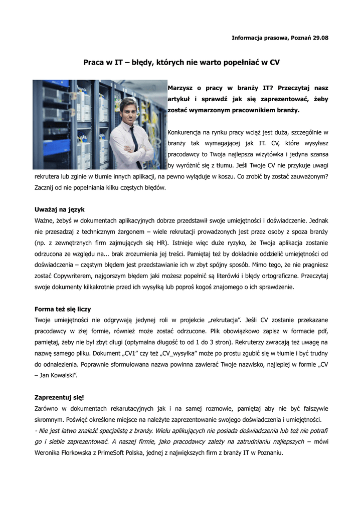Informacja prasowa, Poznań 29.08 Praca w IT – błędy, których nie warto popełniać w CV Marzysz o pracy w branży IT? Przeczytaj nasz artykuł i sprawdź jak się zaprezentować, żeby zostać wymarzonym pracownikiem branży. Konkurencja na rynku pracy wciąż jest duża, szczególnie w branży tak wymagającej jak IT. CV, które wysyłasz pracodawcy to Twoja najlepsza wizytówka i jedyna szansa by wyróżnić się z tłumu. Jeśli Twoje CV nie przykuje uwagi rekrutera lub zginie w tłumie innych aplikacji, na pewno wyląduje w koszu. Co zrobić by zostać zauważonym? Zacznij od nie popełniania kilku częstych błędów. Uważaj na język Ważne, żebyś w dokumentach aplikacyjnych dobrze przedstawił swoje umiejętności i doświadczenie. Jednak nie przesadzaj z technicznym żargonem – wiele rekrutacji prowadzonych jest przez osoby z spoza branży (np. z zewnętrznych firm zajmujących się HR). Istnieje więc duże ryzyko, że Twoja aplikacja zostanie odrzucona ze względu na... brak zrozumienia jej treści. Pamiętaj też by dokładnie oddzielić umiejętności od doświadczenia – częstym błędem jest przedstawianie ich w zbyt spójny sposób. Mimo tego, że nie pragniesz zostać Copywriterem, najgorszym błędem jaki możesz popełnić są literówki i błędy ortograficzne. Przeczytaj swoje dokumenty kilkakrotnie przed ich wysyłką lub poproś kogoś znajomego o ich sprawdzenie. Forma też się liczy Twoje umiejętności nie odgrywają jedynej roli w projekcie „rekrutacja”. Jeśli CV zostanie przekazane pracodawcy w złej formie, również może zostać odrzucone. Plik obowiązkowo zapisz w formacie pdf, pamiętaj, żeby nie był zbyt długi (optymalna długość to od 1 do 3 stron). Rekruterzy zwracają też uwagę na nazwę samego pliku. Dokument „CV1” czy też „CV_wysyłka” może po prostu zgubić się w tłumie i być trudny do odnalezienia. Poprawnie sformułowana nazwa powinna zawierać Twoje nazwisko, najlepiej w formie „CV – Jan Kowalski”. Zaprezentuj się! Zarówno w dokumentach rekarutacyjnych jak i na samej rozmowie, pamiętaj aby nie być fałszywie skromnym. Poświęć określone miejsce na należyte zaprezentowanie swojego doświadczenia i umiejętności. - Nie jest łatwo znaleźć specjalistę z branży. Wielu aplikujących nie posiada doświadczenia lub też nie potrafi go i siebie zaprezentować. A naszej firmie, jako pracodawcy zależy na zatrudnianiu najlepszych – mówi Weronika Florkowska z PrimeSoft Polska, jednej z największych firm z branży IT w Poznaniu. Szukając zatrudnienia w jakiejkolwiek branży powinieneś przyłożyć się do swoich dokumentów rekrutacyjnych. Pamiętaj, że to one są Twoją przepustką do dalszych etapów rekrutacji, a może nawet do wymarzonej pracy... -Dystrybucja materiałów: Agata Gajewy [email protected] kom./+48/ 730 311 112
