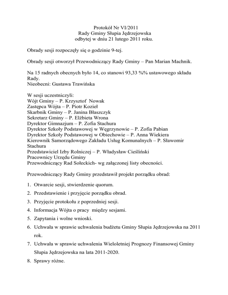 Protokół Nr VI/2011 Rady Gminy Słupia Jędrzejowska odbytej w dniu 21 lutego 2011 roku. Obrady sesji rozpoczęły się o godzinie 9-tej. Obrady sesji otworzył Przewodniczący Rady Gminy – Pan Marian Machnik. Na 15 radnych obecnych było 14, co stanowi 93,33 %% ustawowego składu Rady. Nieobecni: Gustawa Trawińska W sesji uczestniczyli: Wójt Gminy – P. Krzysztof Nowak Zastępca Wójta – P. Piotr Kozieł Skarbnik Gminy – P. Janina Błaszczyk Sekretarz Gminy – P. Elżbieta Wrona Dyrektor Gimnazjum – P. Zofia Stachura Dyrektor Szkoły Podstawowej w Węgrzynowie – P. Zofia Pabian Dyrektor Szkoły Podstawowej w Obiechowie – P. Anna Wiekiera Kierownik Samorządowego Zakładu Usług Komunalnych – P. Sławomir Stachura Przedstawiciel Izby Rolniczej – P. Władysław Cieśliński Pracownicy Urzędu Gminy Przewodniczący Rad Sołeckich- wg załączonej listy obecności. Przewodniczący Rady Gminy przedstawił projekt porządku obrad: 1. Otwarcie sesji, stwierdzenie quorum. 2. Przedstawienie i przyjęcie porządku obrad. 3. Przyjęcie protokołu z poprzedniej sesji. 4. Informacja Wójta o pracy między sesjami. 5. Zapytania i wolne wnioski. 6. Uchwała w sprawie uchwalenia budżetu Gminy Słupia Jędrzejowska na 2011 rok. 7. Uchwała w sprawie uchwalenia Wieloletniej Prognozy Finansowej Gminy Słupia Jędrzejowska na lata 2011-2020. 8. Sprawy różne. 9. Odpowiedzi na zapytania radnych. 10. Zakończenie obrad. Ad. punktu 1. Otwierając obrady sesji Przewodniczący Rady Gminy stwierdził, iż bierze w niej udział 14 radnych, tj.93,33 % ustawowego składu Rady. Ad. punktu 2. Porządek obrad sesji został przez radnych przyjęty. „ZA” przyjęciem porządku obrad głosowało 14 radnych. Ad. punktu 3. Protokół z poprzedniej sesji został przyjęty bez odczytania. Do protokołu radni nie wnieśli uwag. „ZA” przyjęciem protokołu w głosowaniu jawnym było 14 radnych. Ad. punktu 4. Informacja Wójta o pracy między sesjami: - przeprowadzono przetarg na odwodnienie placu wraz z budynkiem szkoły Podstawowej w Starym Węgrzynowie. Wykonawcą została firma HandlowoUsługowa Wacława Grudnia z Miechowa za kwotę brutto 45 786,91 zł, termin realizacji do 30 kwietnia 2011 roku; - w toku realizacji jest przygotowanie odcinka kolektora sanitarnego w Słupi do kapitalnego remontu; przeprowadzono płukanie odcinka kolektora, natomiast jego kamerowanie pozwoli na określenie długości wymiany, opracowano dokumentację przetargową na jego remont; -wybory do izb rolniczych odbędą się 3 kwietnia 2011 r ( okręg dwumandatowy – wybiera się dwóch członków); -od 1 do 31 marca 2011 roku będą przyjmowane w Gminie wnioski na zwrot podatku akcyzowego zawartego w cenie oleju napędowego wykorzystanego do produkcji rolnej; - w dniu 28 lutego 2011 r zostaną przeprowadzone negocjacje na sprzedaż działek w Raszkowie nr 50/4, 50/7 wraz z budynkiem sklepu. Obecnie trwają prace przygotowawcze do przetargu nieograniczonego na „ Remont drogi gminnej Nr 380019 T Jasieniec – Węgrzynów etap I , długości 450 mb i 4,5 mb szerokości; - 11.02.2011 r został ogłoszony przetarg na „ Przebudowę drogi gminnej Nr 380009 T Nowa Wieś – Marianów, długości 747 mb wraz z wykonaniem oświetlenia ulicznego. Otwarcie ofert nastąpi 28.02.2011 r o godz. 11.00. Gmina Słupia wystąpiła z wnioskiem do Funduszu Społecznego w ramach priorytetu IX Rozwój wykształcenia i kompetencji w regionach – łącznie pozyskaliśmy 104 742,60 ( 100% kosztów pokrywa EFS). W ramach programu odbędą się dodatkowe zajęcia dla dzieci w szkołach podstawowych na terenie gminy Słupia; - przygotowano dokumentację do przetargu na zadanie pn. Budowa przydomowych oczyszczalni ścieków w gminie Słupia Jędrzejowska Etap I ( I połowa marca 2011 roku). W lutym przeprowadzono 11 zebrań wiejskich dotyczących wyboru sołtysa i Rady Sołeckiej. Wójt pogratulował sołtysom wyboru i życzył sukcesów w pracy. 17 lutego br. przeprowadzona została kontrola stawu w Słupi, zakończono ją wynikiem pozytywnym. W miesiącu styczniu w jednostkach OSP Rożnica i Sieńsko należących do Krajowego Systemu Ratowniczo Gaśniczego PSP przeprowadzono kontrolę sprawności sprzętu pożarniczego oraz dokumentacji mechaników- kierowców. Kontrole wypadły pozytywnie. - obecnie są wykonywane roboty na urządzeniach melioracji ( wstawianie mostków przejazdowych) w Obiechowie oraz został zorganizowany czyn społeczny przez rolników do wożenia kamienia na drogi dojazdowe do łąk, do załadunku wykorzystywana jest koparka z Zakładu Gospodarki Komunalnej w Słupi. W dniu 4 marca 2011 roku odbędzie się Walne Zebranie Spółki Wodnej „Naprzód” w Słupi. Ad. punktu 5. Radny P. Krupa – dlaczego wystąpiły zmiany w projekcie budżetu 2011 roku, poprzez zmniejszenie długości odcinka remontowanej drogi w Jasieńcu; Radny P. Jerzy Kubicki – czy odbyły się już przetargi na przyłącza kanalizacyjne; Sołtys P. Rola – zgłosił występujące niebezpieczeństwo na drodze Rożnica – Sieńsko, gdzie leży przewrócony słup na poboczu; - była wieża nawigacyjna, obecnie jest zniszczona na działce Pana Zbigniewa Ciszewskiego. Ad. punktu 6. Skarbnik Gminy odczytała pozytywną opinię RIO w Kielcach odnośnie przedłożonego „ Projektu budżetu Gminy Słupia Jędrzejowska na 2011 rok” Następnie przedstawiła projekt budżetu na 2011 rok: Planowane dochody budżetu gminy wynoszą : 13.563.519,20 zł Planowane wydatki wynoszą : 15.350.519,20 zł Deficyt budżetu gminy w wysokości 1.787.000 zł zostanie pokryty przychodami z zaciągniętych kredytów w kwocie 1.787.000 zł. W budżecie tworzy się rezerwę ogólną w wysokości 30.000 zł oraz celową w wysokości 22.000 zł z przeznaczeniem na zarządzanie kryzysowe. Upoważnia się Wójta do zaciągania kredytów do kwot wynikających z limitów, w celu sfinansowania przejściowego i planowanego deficytu budżetu oraz spłaty wcześniej zaciągnięt