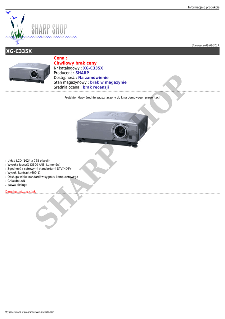 Informacje o produkcie Utworzono 03-03-2017 XG-C335X Nr katalogowy : XG-C335X Producent : SHARP Dostępność : Na zamówienie Stan magazynowy : brak w magazynie Średnia ocena : brak recenzji P Cena : Chwilowy brak ceny ● ● ● ● ● ● Układ LCD (1024 x 768 pikseli) Wysoka jasność (3500 ANSI Lumenów) Zgodność z cyfrowymi standardami DTV/HDTV Wysoki kontrast (600:1) Obsługa wielu standardów sygnału komputerowego Gniazdo LAN Łatwa obsługa SH Dane techniczne - link AR ● P SH O Projektor klasy średniej przeznaczony do kina domowego i prezentacji Wygenerowano w programie www.oscGold.com