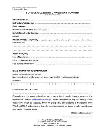 ……………………………………………… Miejscowość i data FORMULARZ ZWROTU / WYMIANY TOWARU (niepotrzebne skreślić) Nr zamówienia:………................................................................................................ Nr.Faktury/paragonu: ……........................................................................................ Data zakupu: ................................................................................................................ Wartość zamówienia (bez kosztów wysyłki): ........................................................................... Nr telefonu kontaktowego: ......................................................................................... e-mail: ……................................................................................................................... Powód zwrotu / wymiany (w przypadku wymiany podać dokładną nazwę towaru, rozmiar i kolor, na który ma zostać wymieniony) …………………………………………………………………………………… …………………………………………………………………………………… Adres nabywcy Imię i Nazwisko: ………………………................................................................………. Ulica i nr domu/mieszkania: .........………………………………………………………….. Kod pocztowy i miasto: ………………..............……………………………………………. DANE O RACHUNKU BANKOWYM (ważne w przypadku zwrotu towaru) Numer rachunku bankowego, na który mają zostać zwrócone pieniądze: Nr konta: Dane właściciela rachunku:.......…….....……………………............................................ ………………………………..........…….....……………………..........…….....……….…… Oświadczam, że zapoznałam/łem się z warunkami zwrotu towaru zawartymi w regulaminie sklepu www.waldi-meble.pl. Klient zobowiazuje się na własny koszt dostarczyć towar do siedziby firmy. W przypadku skorzystania z transportu firmy WALDI-MEBLE zobowiązany jest do wcześniejszego kontaktu w celu uzgodnienia warunków i kosztów zwrotu. Data i podpis nabywcy …………………………………….. P.H.U WALDEMAR PIĘTKA ul. Sienkiewicza 33, 08-400 Garwolin NIP 826 141 58 85 BZ WBK 59 64 1500 1663 1216 6008 6103 0000