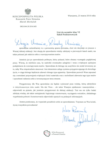 11 Warszawa, 23 marca 2016 roku RZECZPOSPOLITA POLSKA Rzecznik Praw Dziecka Marek Michalak DKS.064.29.2016.MS List do uczniów klas VI Szkól Podstawowych spraw zian szostoklasisty to z pewnoscią sprawa poważna, choc nie decyduje on jeszcze o Waszej dalszej edukacji. Jest okazją do sprawdzenia wiedzy zdobytej w pierwszych latach nauki, ma także pokazać jak radzicie sobie z rozwiązywaniem testów. Jesteście już po sprawdzianie próbnym, który pokazał, które obszary wymagały pogłębionej pracy. Wierzę, że mieliście czas, by nadrobić ewentualne zaległości i teraz z większym spokojem podejdziecie do rozwiązywania testów. Sprawdzian do którego się uczyliście nie został stworzony po to, żeby Was niepotrzebnie stresować. Jest elementem całego systemu przygotowującego do dorosłego życia, w ciągu którego będziecie zdawać różnego typu egzaminy. Sprawdzian pozwoli Wam zapoznać się z metodami przyswajania większych ilości materiału oraz z technikami zdawania tego typu testów i sposobami radzenia sobie z towarzyszącym temu stresem. Przygotowany dla Was sprawdzian nie będzie wykraczał poza wiedzę, którą zdobyliście w dotychczasowym toku nauki. Ma dać Wam — ale także Waszym opiekunom i nauczycielom — odpowiedź na pytanie, jak jesteście przygotowani do dalszej edukacji. Test ma nie tylko badać zdobytą wiedzę, ale także umiejętności logicznego rozumowania, wyciągania wniosków, dokładnego wypełniania poleceń i konstruowania odpowiedzi opartych na podanych informacjach. Jestem przekonany, że wspaniale poradzicie sobie ze sprawdzianem. Trzymam za Was kciuki, życzę wszystkim powodzenia! • 26 lat Konwencji o Prawach Dziecka