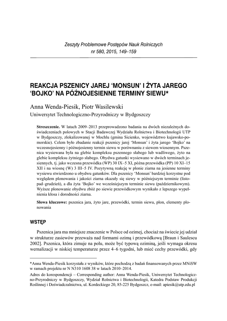 Zeszyty Problemowe Postępów Nauk Rolniczych nr 580, 2015, 149–159 REAKCJA PSZENICY JAREJ ‘MONSUN’ I ŻYTA JAREGO ‘BOJKO’ NA PÓŹNOJESIENNE TERMINY SIEWU* Anna Wenda-Piesik, Piotr Wasilewski Uniwersytet Technologiczno-Przyrodniczy w Bydgoszczy Streszczenie. W latach 2009–2013 przeprowadzono badania na dwóch niezależnych doświadczeniach polowych w Stacji Badawczej Wydziału Rolnictwa i Biotechnologii UTP w Bydgoszczy, zlokalizowanej w Mochlu (gmina Sicienko, województwo kujawsko-pomorskie). Celem było zbadanie reakcji pszenicy jarej ‘Monsun’ i żyta jarego ‘Bojko’ na wczesnojesienny i późnojesienny termin siewu w porównaniu z siewem wiosennym. Pszenica wysiewana była na glebie kompleksu pszennego słabego lub wadliwego, żyto na glebie kompleksu żytniego słabego. Obydwa gatunki wysiewano w dwóch terminach jesiennych, tj. jako wczesna przewódka (WP) 30 IX–5 XI, późna przewódka (PP) 10 XI–15 XII i na wiosnę (W) 3 III–5 IV. Pozytywną reakcję w plonie ziarna na jesienne terminy wysiewu stwierdzono u obydwu gatunków. Dla pszenicy ‘Monsun’ bardziej korzystne pod względem plonowania i jakości ziarna okazały się siewy w późniejszym terminie (listopad–grudzień), a dla żyta ‘Bojko’ we wcześniejszym terminie siewu (październikowym). Wyższe plonowanie obydwu zbóż po siewie przewódkowym wynikało z lepszego wypełnienia kłosa i dorodności ziarna. Słowa kluczowe: pszenica jara, żyto jare, przewódki, termin siewu, plon, elementy plonowania WSTĘP Pszenica jara ma mniejsze znaczenie w Polsce od ozimej, chociaż na świecie jej udział w strukturze zasiewów przeważa nad formami ozimą i przewódkową [Braun i Saulescu 2002]. Pszenica, która zimuje na polu, może być typową oziminą, jeśli wymaga okresu wernalizacji w niskiej temperaturze przez 4–6 tygodni, lub mieć cechy przewódki, gdy *Anna Wenda-Piesik korzystała z wyników, które pochodzą z badań finansowanych przez MNiSW w ramach projektu nr N N310 1608 38 w latach 2010–2014. Adres do korespondencji – Corresponding author: Anna Wenda-Piesik, Uniwersytet Technologiczno-Przyrodniczy w Bydgoszczy, Wydział Rolnictwa i Biotechnologii, Katedra Podstaw Produkcji Roślinnej i Doświadczalnictwa, ul. Kordeckiego 20, 85-225 Bydgoszcz, e-mail: [email protected] 150 A. Wenda-Piesik, P. Wasilewski takich wymagań nie posiada. Odmiany rekomendowane do siewów przewódkowych charakteryzują się większą odpornością na niską temperaturę w okresach zimy i wczesnej wiosny od typowych odmian jarych [Stelmakh 1998, Wenda-Piesik i in. 2015]. Hodowcy rekomendują niektóre genotypy pszenicy do siewu późnojesiennego, chociaż na liście odmian COBORU taka odrębna forma nie występuje. Uprawa pszenicy przewódkowej (ang. facultative) jest rozpowszechniona w południowych regionach Europy (na terenie byłej Jugosławii), Azji Środkowej, na Bliskim Wschodzie, w Australii i Ameryce Północnej [Okic 1995, Hnilicka i in. 2005, Ozturk i in. 2006, Bewick i in. 2008]. Wzrastająca popularność przewódek w Polsce i innych krajach Europy Centralnej wynika z rosnącej powierzchni uprawy kukurydzy z przeznaczeniem na ziarno, która podobnie jak burak cukrowy należy do późno zbieranych przedplonów pszenicy. To stawia wielu rolników przed problemem, czy lepiej zaryzykować z opóźnionym terminem siewu pszenicy ozimej, czy jednak poczekać do wiosennego siewu pszenicy jarej. Łagodne zimy oraz susze występujące na wiosnę zachęcają rolników do uprawy jakościowych odmian pszenicy jarej o walorach przewódkowych w terminach przedzimowych. O ile warunki atmosferyczne pozwalają na przygotowanie pola pod zasiew i na wysianie nasion pszenicy przed nadejściem zimy (co może się zdarzać nawet w grudniu), zwłaszcza w rejonach charakteryzujących się łagodnym przebiegiem zimy, taka uprawa może okazać się bardziej opłacalna niż po zasiewie w terminie wiosennym [Grocholski i in. 2007, Hall 2013]. Reakcja pszenicy na siewy przewódkowe była badana przez polskich autorów, którzy wykazali wyższy plon pszenicy jarej z jesiennego terminu siewu niż z wiosennego [Grocholski i in. 2007, Kurowski i Bruderek 2009, Kardasz i in. 2010, Wyzińska 2012]. Grocholski i inni [2007] korzystną reakcję pszenicy jarej na jesienny termin siewu tłumaczą wcześniejszym rozpoczęciem wegetacji na wiosnę oraz lepszym okryciem gleby, a uzyskany przez nich plon był wyższy od 1,14 (odmiana Hena) do 2,93 t·ha–1 (odmiana Triso) niż w terminie wiosennym tych samych odmian. Kurowski i Bruderek [2009], badając wpływ terminów siewu przedzimowych na zdrowotność oraz plonowanie dwóch odmian pszenicy jarej, stwierdzili ograniczenie porażenia patogenami grzybowymi wraz z opóźnieniem terminu siewu pszenicy jarej. Badania Kardasza i innych [2010] polegały na ocenie stanu zachwaszczenia oraz plonowania odmian pszenicy jarej przewódkowej wysianej w różnych terminach. Plon wszystkich badanych odmian z siewu jesiennego był wyższy o 43,2–62,6% w porównaniu do siewu wiosennego. Przewódkowość dotyczy nie tylko pszenicy, ale także pszenżyta, które znacznie lepiej radzi sobie w gorszych warunkach siedliskowych, na przykład na glebach suchych, z niedoborami składników pokarmowych lub przy niekorzystnym rozkładzie temperatury [Salmon i in. 2004]. Gatunek ten także pozytywnie reaguje na siew późnojesienny pod warunkiem doboru odpowiedniej odmiany w typie przewódkowym, tzn. takiej, która nie potrzebuje niskiej temperatury do wernalizacji, a ma większą mrozoodporność. W badaniach austriackich wykorzystano odmianę Agrano pochodzącą z hodowli Saatzucht Donau, Austria [Hall 2013]. Zmienne warunki klimatyczne Polski, zwłaszcza okresu zimy, powodują, że w strukturze zasiewów potrzebne są zboża jare. Literatura podaje, że żyto jare dobrze znosi uprawę na glebach lekkich i zakwaszonych [Grochowski i Galek 1997, 1998, Kaczmarek i in. 2000, Kadłubiec i Bojarczuk 2003].